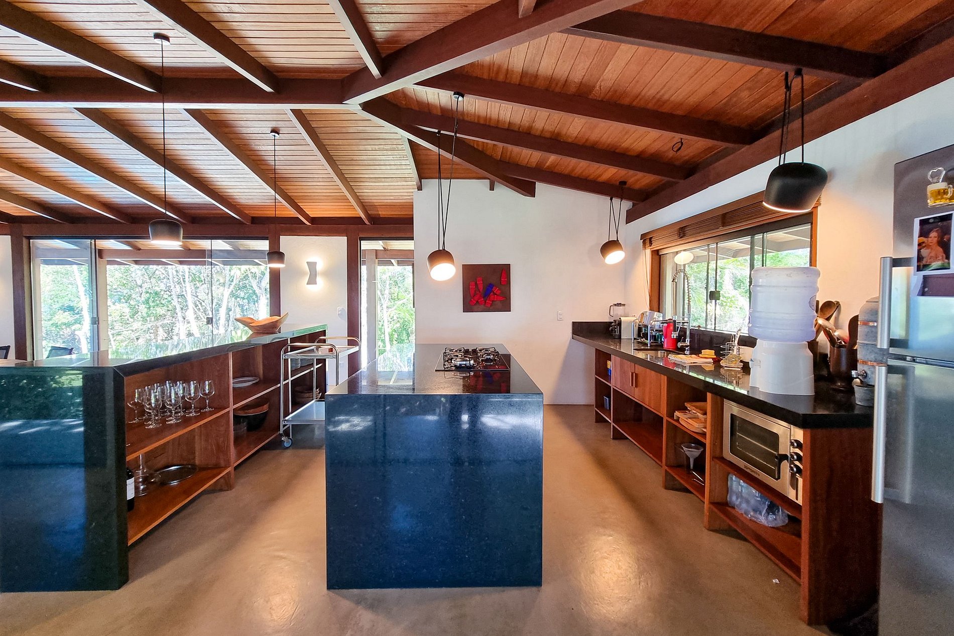 Casa feita com madeira Massaranduba, dando um lindo toque rústico baiano à decoração da mesma. Os móveis foram especialmente desenhados e fabricados com madeira tropical maciça. As luminárias possuem design Italiano para iluminar toda a casa enquanto embeleza os ambientes. Todos os cômodos são muito bem iluminados naturalmente e são cercados de natureza e tranquilidade neste lugar maravilhoso.