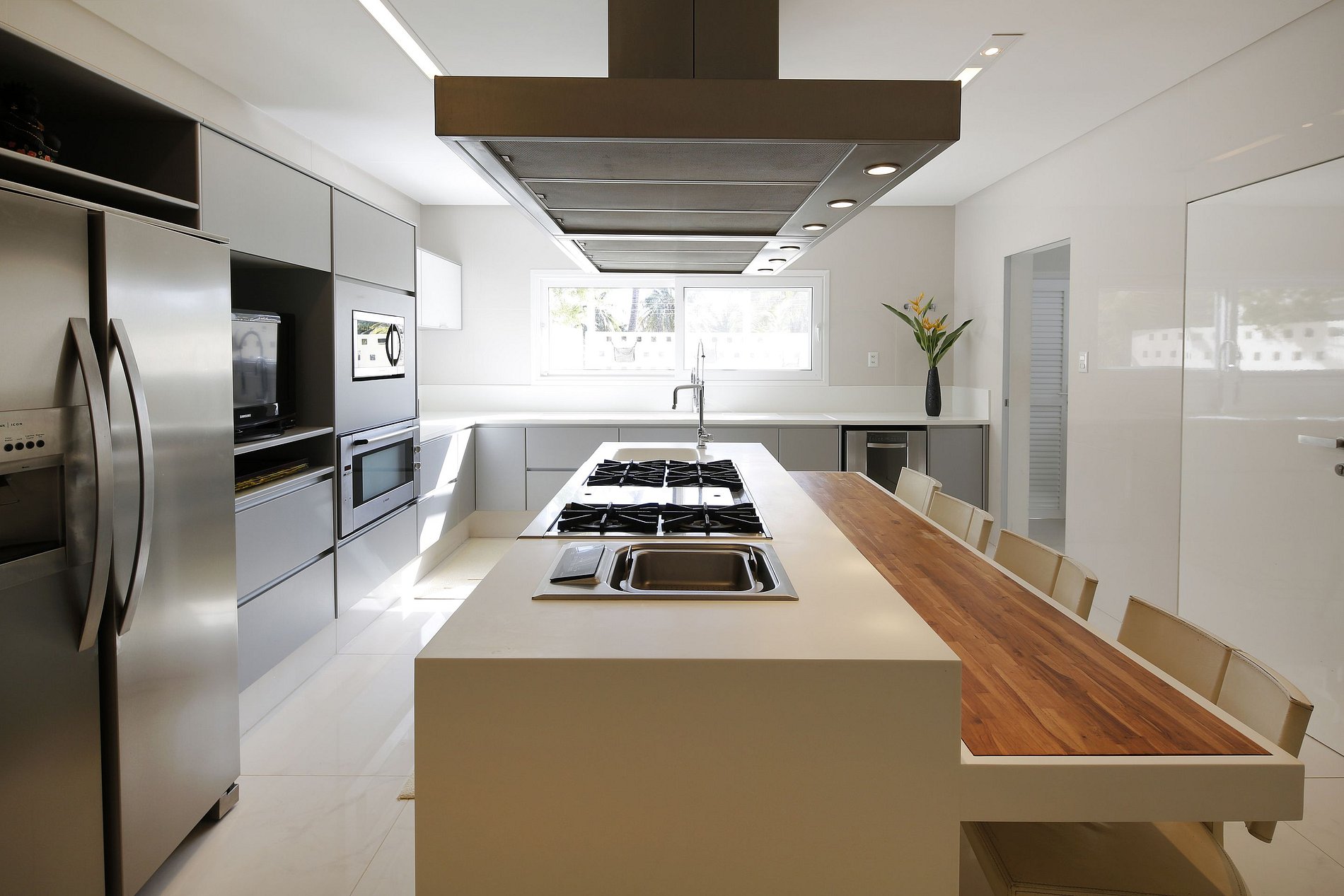 - Cozinha equipada com acessórios de alta qualidade: Fogão Industrial "WOLF" (USA), com seis bocas e uma chapa para grelhar, vaporeira, forno de grande porte (90 cm de largura), 2 frigoríficos "side by side", micro-ondas, máquina de lavar louça, máquina de gelo, com ar condicionado.