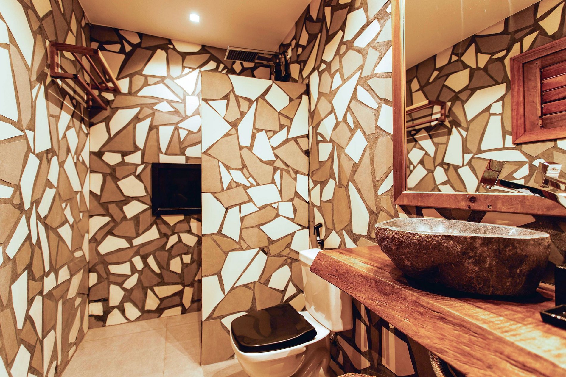A casa dispõe de 8 suites cuidadosamente decoradas com banheiro privativo, todos idênticos, e equipados com televisão, ar condicionado e varanda. 4 suítes ficam no térreo e 4 suítes no primeiro andar. A área comum é em torno da linda piscina e do jardim verdejante.