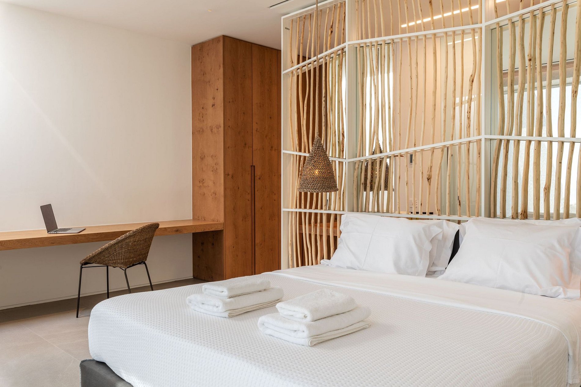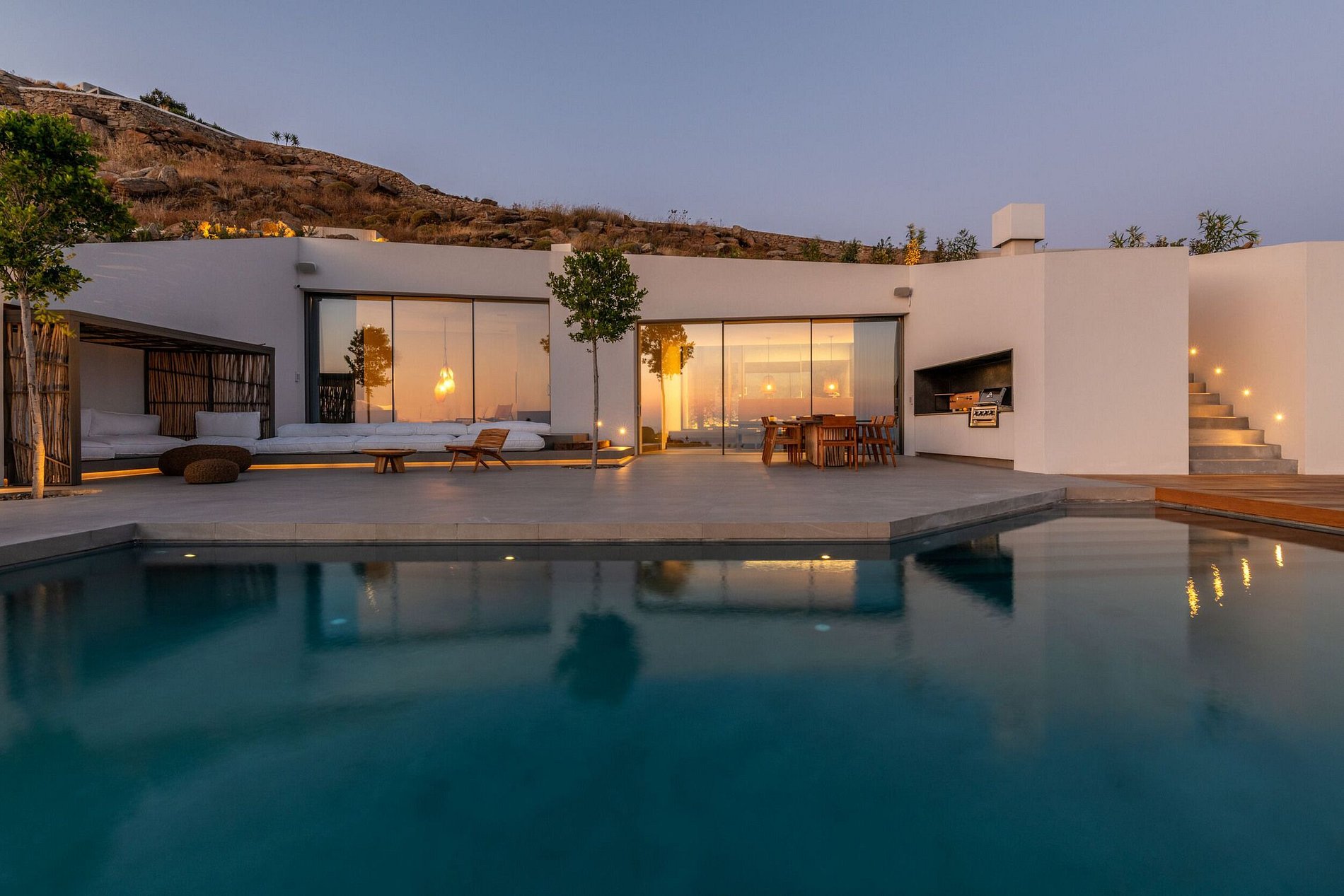 Todos os quartos da propriedade estão voltados para o oeste do Mar Egeu e oferecem incríveis vistas panorâmicas do pôr do sol no mar. A villa consiste na casa principal e na casa de hóspedes e possui 5 quartos, mais 1 quarto extra e 8 banheiros. O espaçoso deck externo de aproximadamente 500 m² inclui uma piscina infinita privativa com vista para o Mar Egeu, área para refeições e churrasqueira, home cinema ao ar livre e várias áreas de estar.