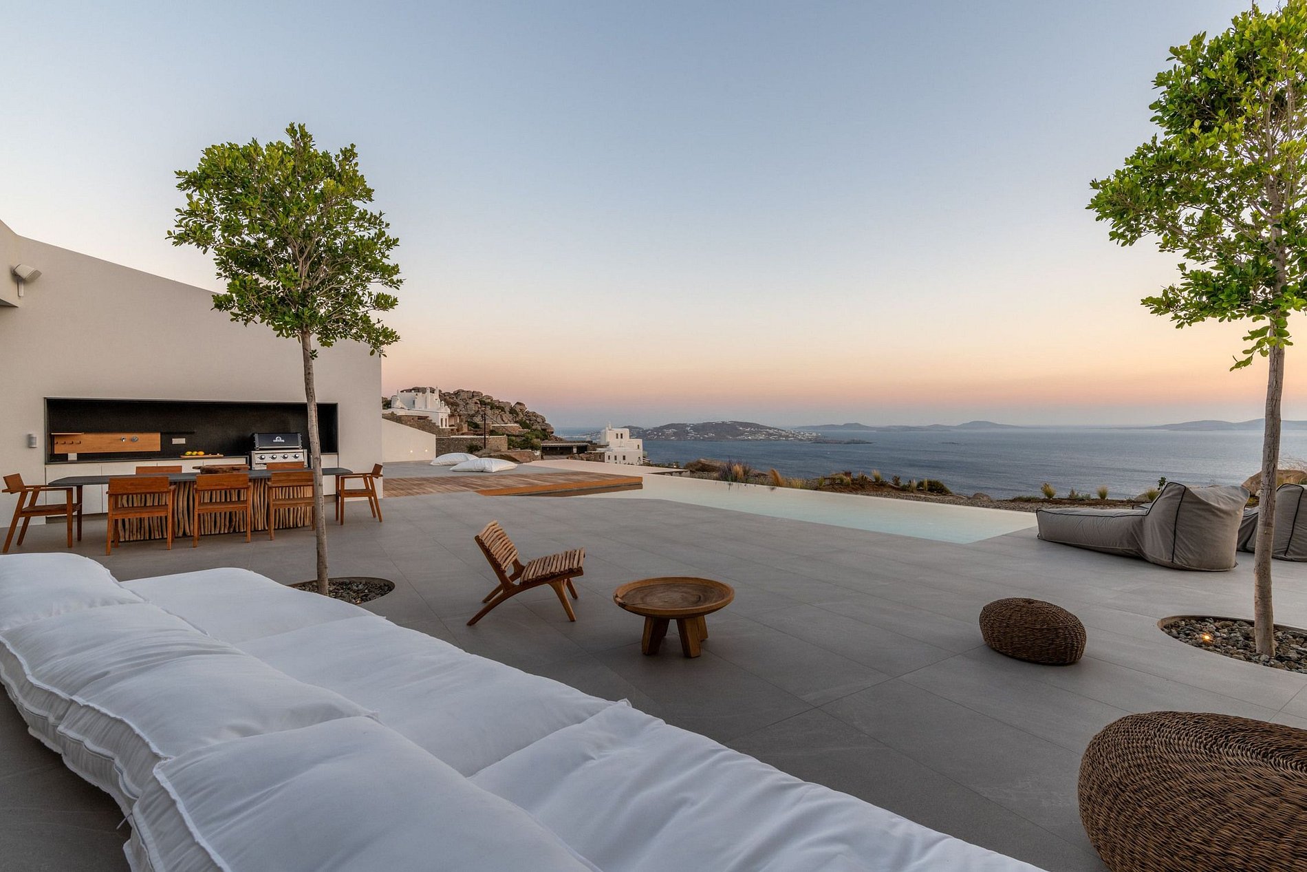 Todos os quartos da propriedade estão voltados para o oeste do Mar Egeu e oferecem incríveis vistas panorâmicas do pôr do sol no mar. A villa consiste na casa principal e na casa de hóspedes e possui 5 quartos, mais 1 quarto extra e 8 banheiros. O espaçoso deck externo de aproximadamente 500 m² inclui uma piscina infinita privativa com vista para o Mar Egeu, área para refeições e churrasqueira, home cinema ao ar livre e várias áreas de estar.