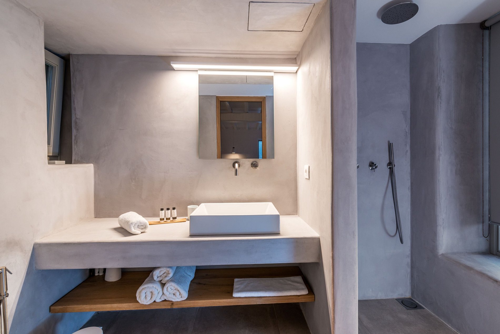Os hóspedes têm acesso às 2 piscinas da propriedade (uma das quais pode ser aquecida a pedido), ao jacuzzi exterior, ginásio, Hammam (disponível a pedido), tudo isto rodeado por um bonito jardim. A área para refeições ao ar livre está situada logo acima da piscina e oferece uma vista verdadeiramente deslumbrante do céu e do mar Egeu.