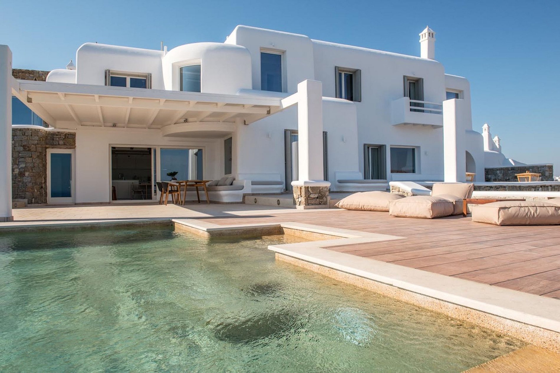 A villa situada na orla da costa rochosa a menos de 300 metros da famosa praia de Elia, é composta por amplas áreas de estar e terraços com vistas deslumbrantes. Os interiores caiados de branco, decorados com os mais altos padrões, combinam design contemporâneo com arte e luxo.