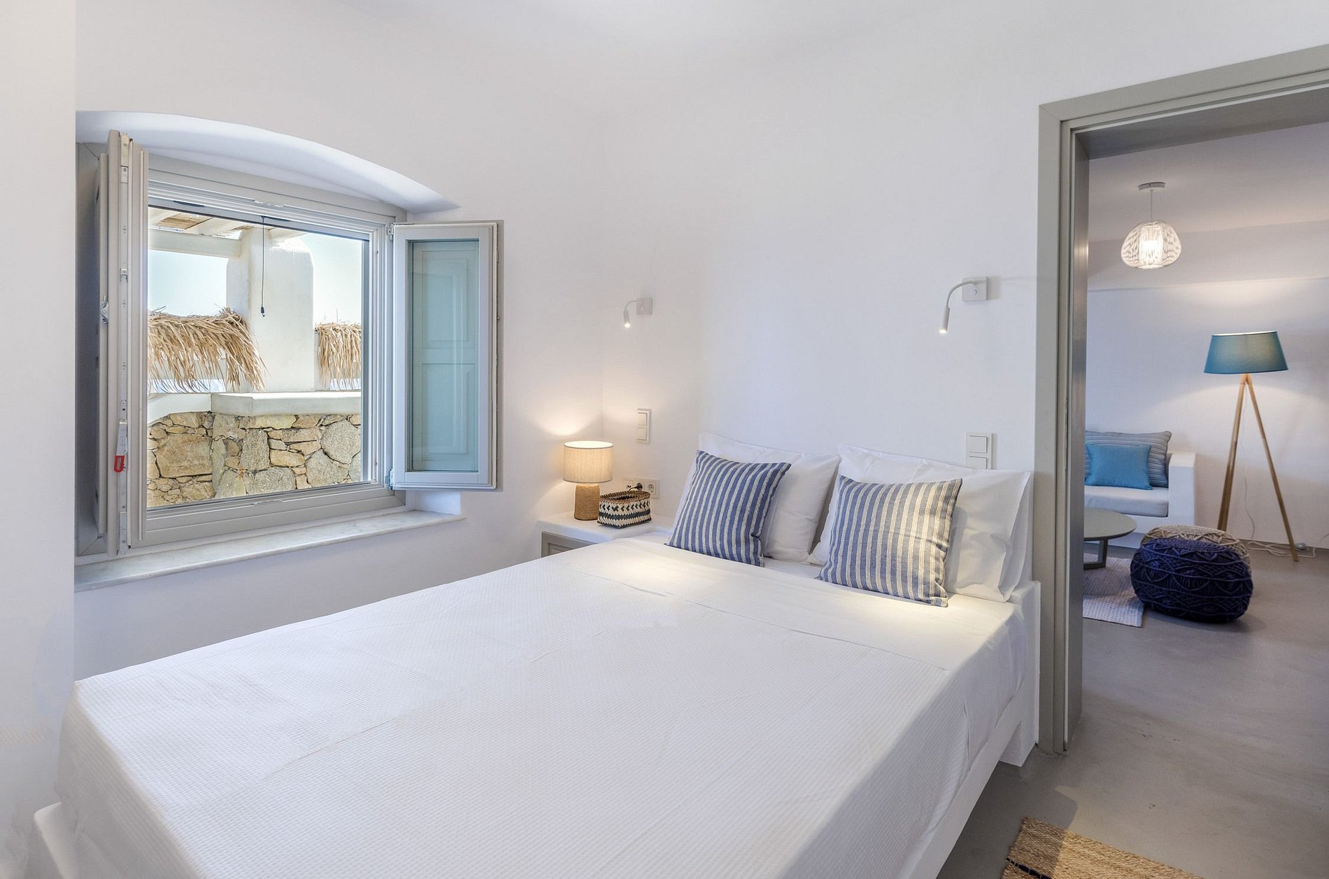 Com uma localização excepcional, apenas a 5 minutos a pé da bela praia natural de Agios Sostis, esta villa oferece o prazer único adicional de vistas inesquecíveis no coração das Cíclades.