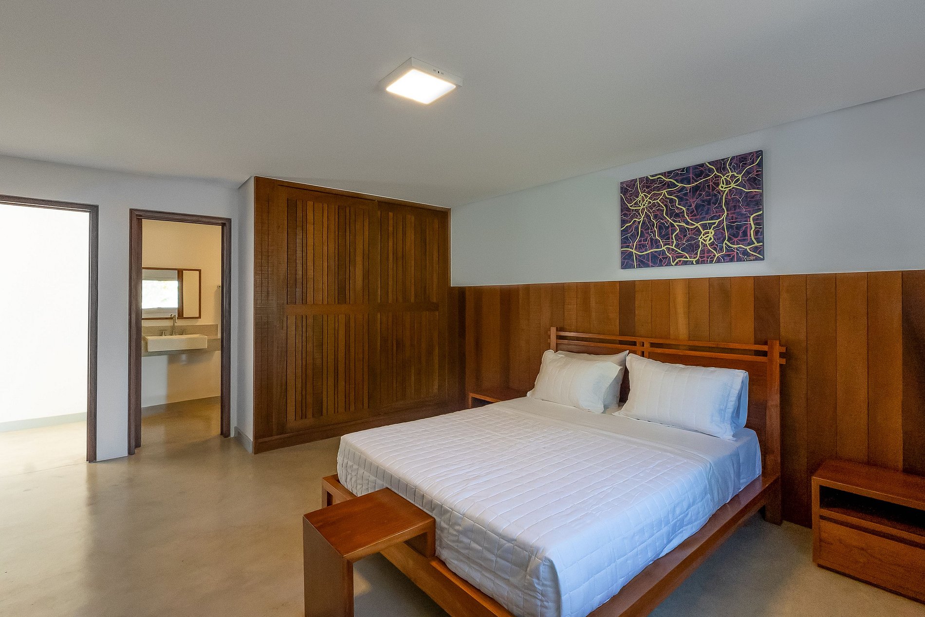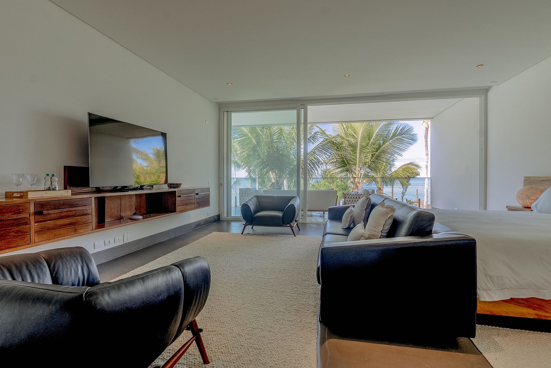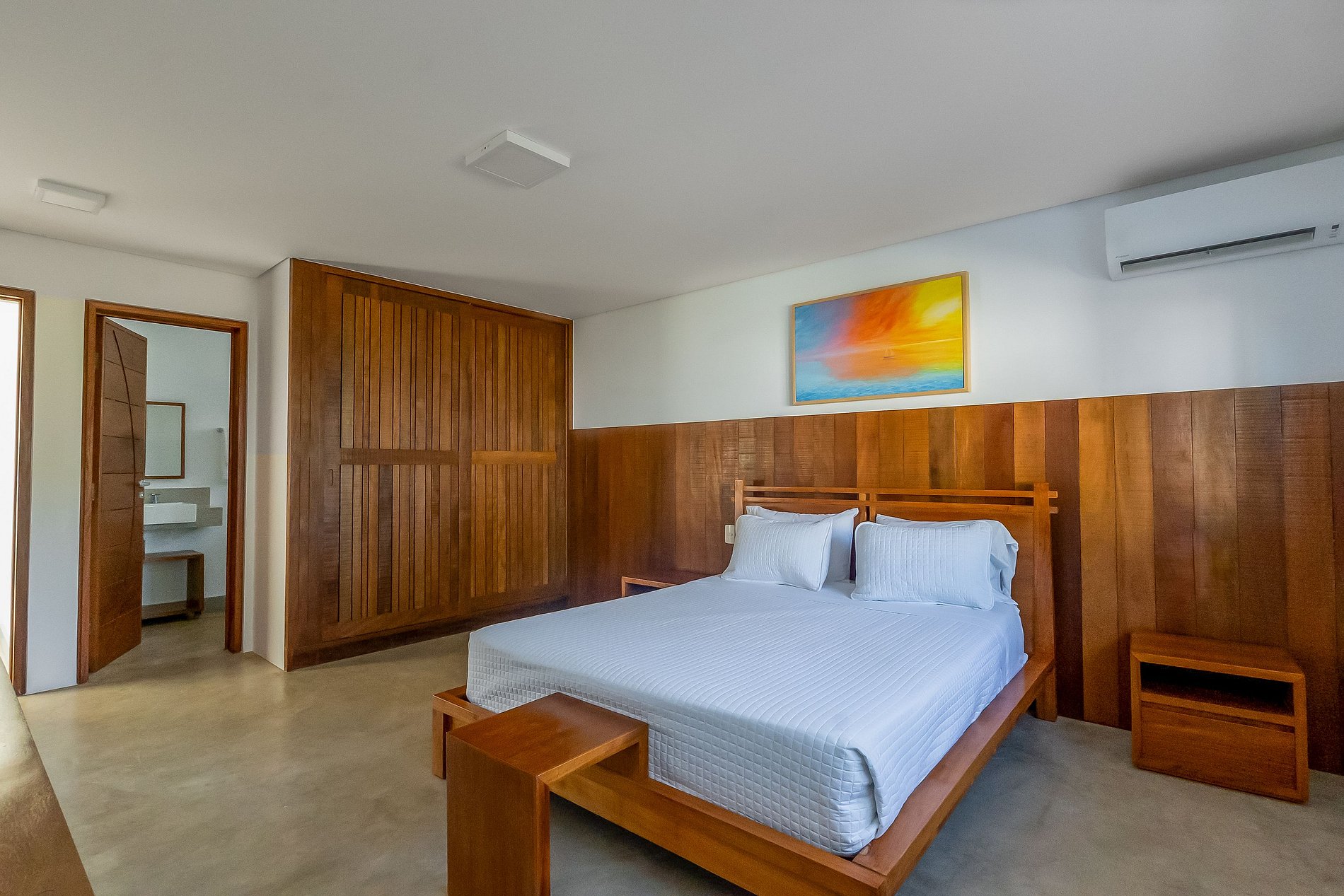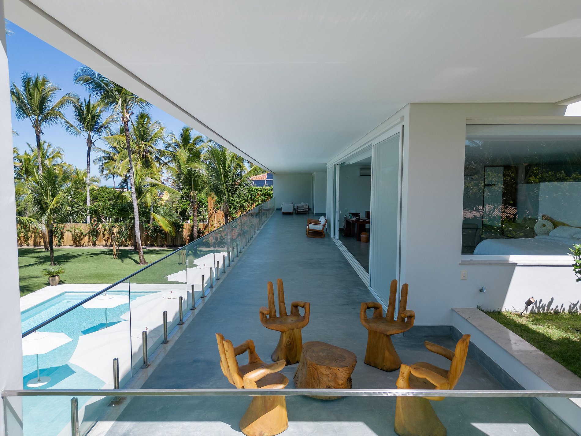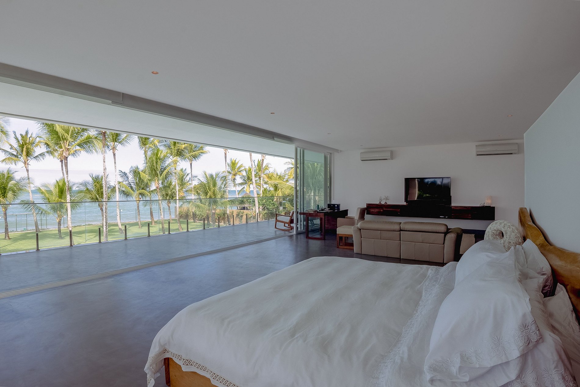 A casa principal, começando pelo piso superior com área de 260M², estão as duas suítes máster. Vista direta ao mar, piscina e jardim. Cama king size, poltronas ou sofá, cortinas elétrica, bancada de trabalho, SmartTV 43” e ar condicionado. O closet tem bela marcenaria e é bem espaçoso. Os banheiros tem a individualidade de duas pias, dois chuveiros com 30 centímetros de diâmetro e tem uma jacuzzi para duas pessoas.