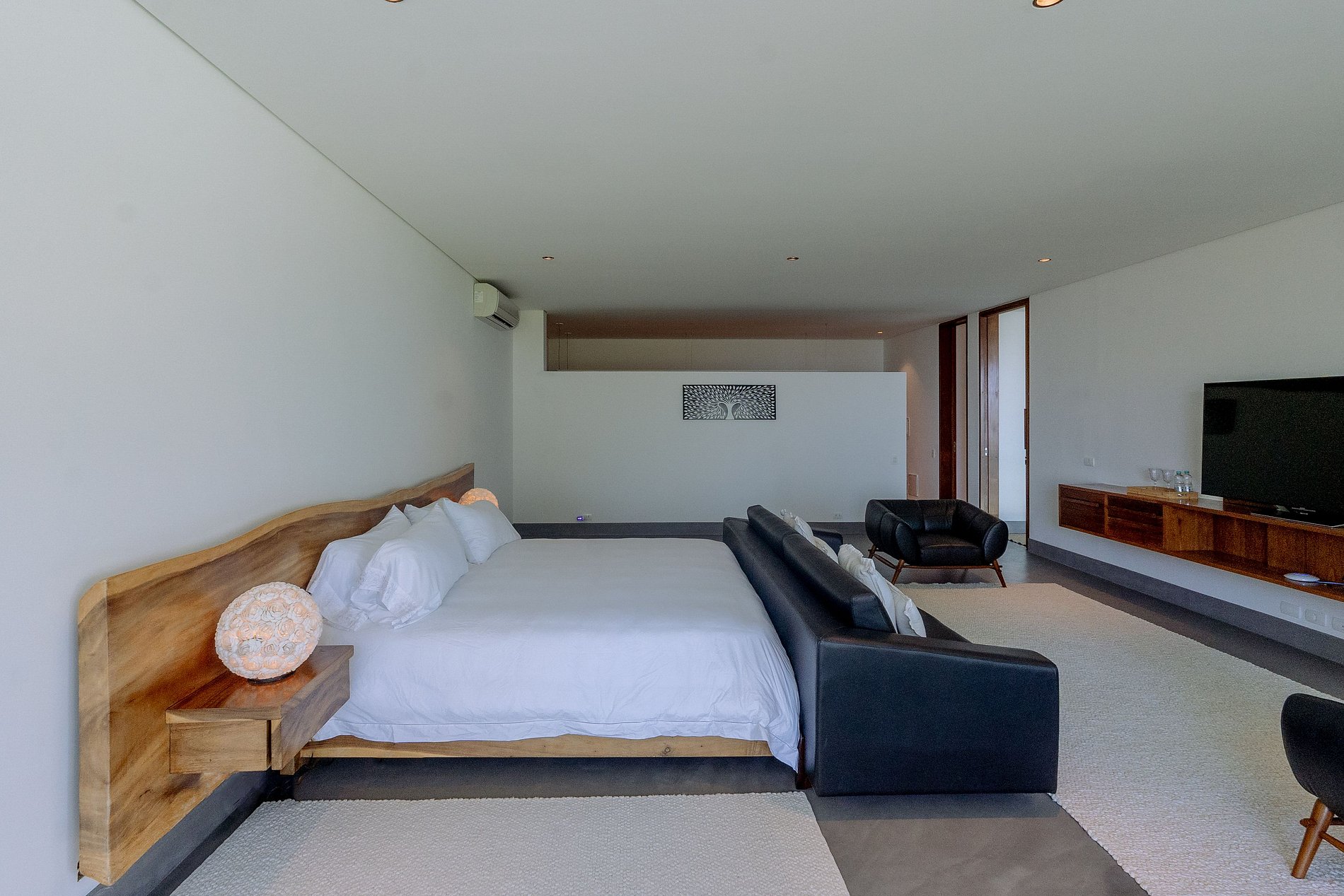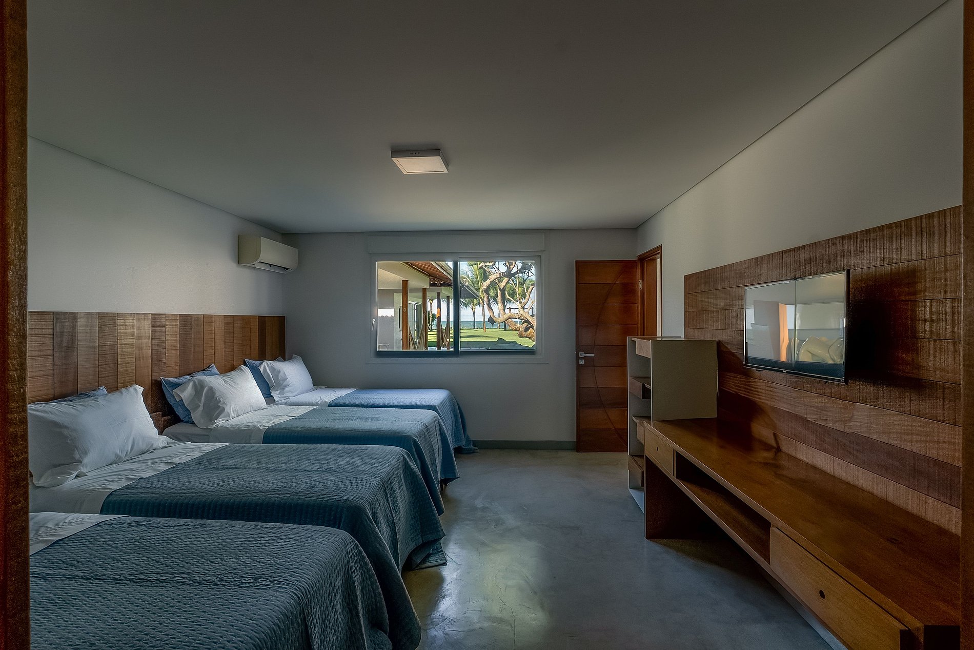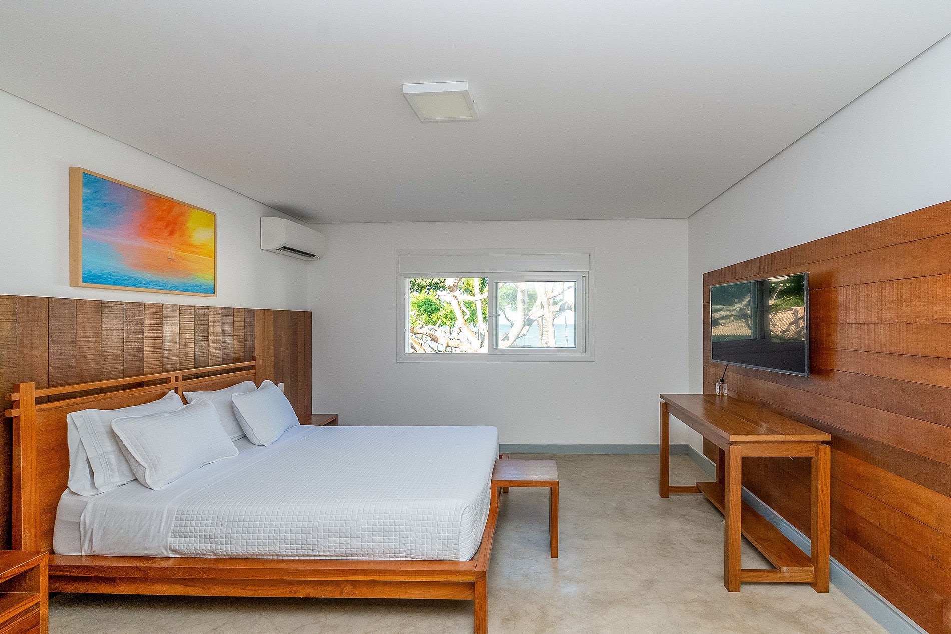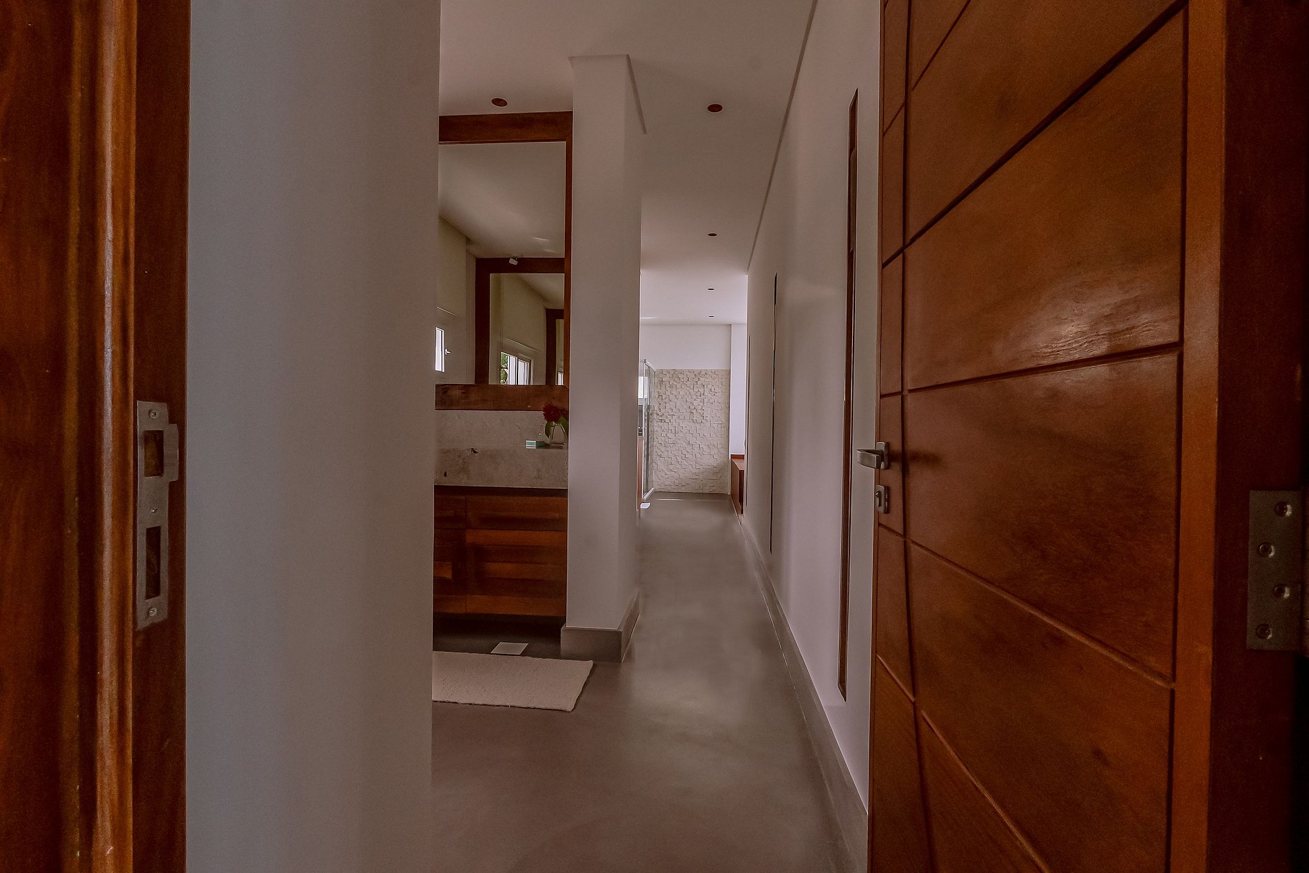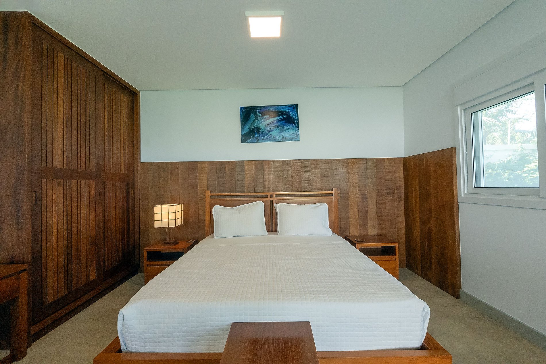 A casa principal, começando pelo piso superior com área de 260M², estão as duas suítes máster. Vista direta ao mar, piscina e jardim. Cama king size, poltronas ou sofá, cortinas elétrica, bancada de trabalho, SmartTV 43” e ar condicionado. O closet tem bela marcenaria e é bem espaçoso. Os banheiros tem a individualidade de duas pias, dois chuveiros com 30 centímetros de diâmetro e tem uma jacuzzi para duas pessoas.