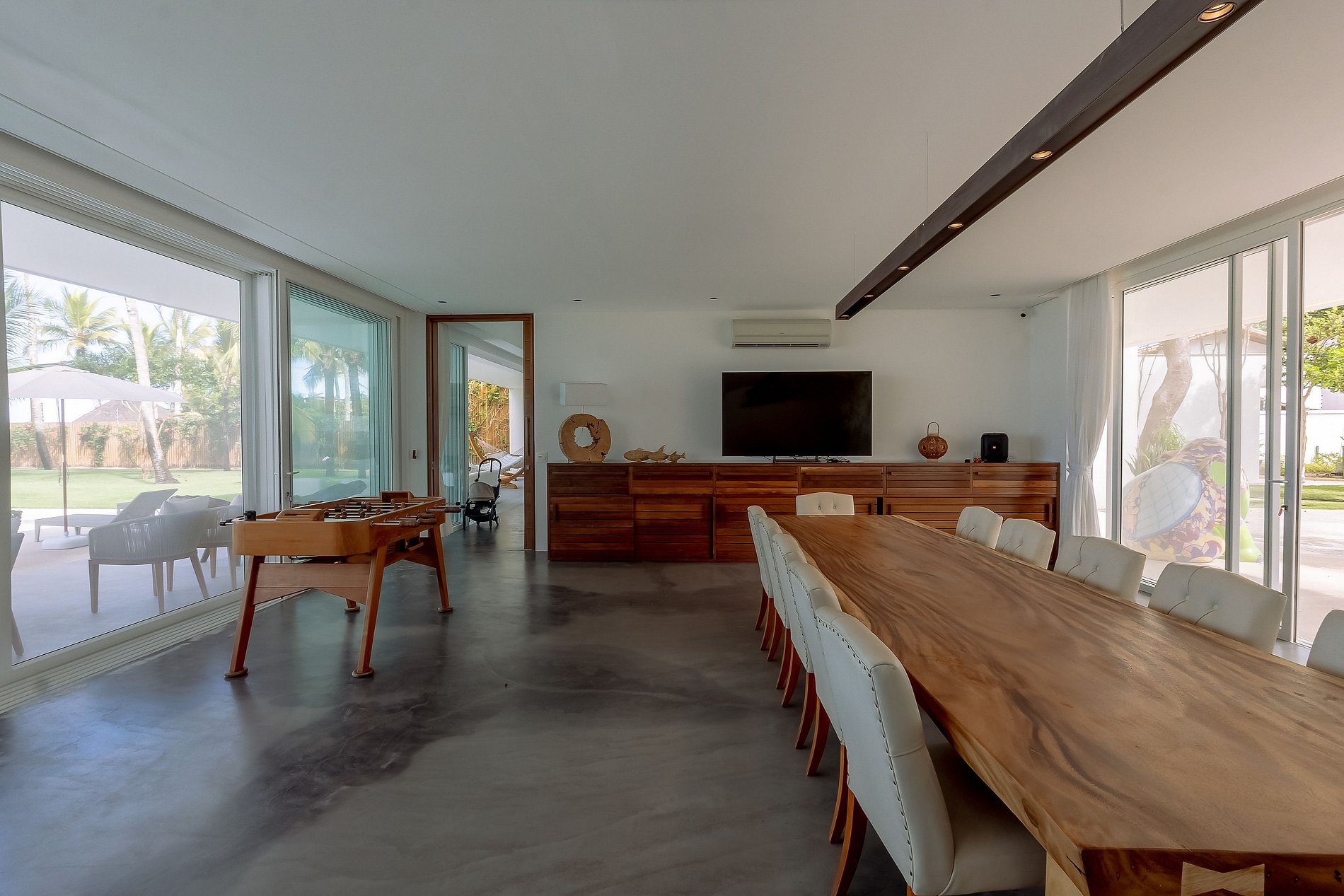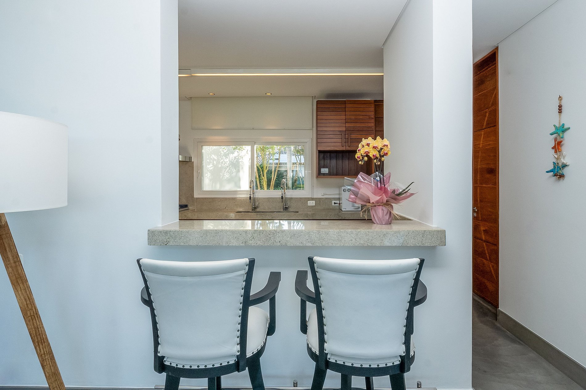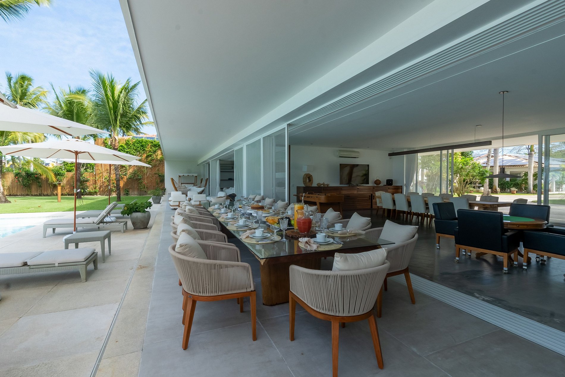 No pavimento térreo estão: a sala de estar, sala de jantar com duas belas mesas de refeição e cozinha. A cozinha é completa e preparada para servir 20 pessoas diariamente. A cozinha tem três geladeiras, 02 freezer, cervejeira, dois fogões elétrico, um fogão industrial e todos os equipamentos necessários. Anexo a cozinha está a cozinha gourmet que tem churrasqueira elétrica e um bar que serve a varanda e piscina. Excelente apoio para pequenos eventos, almoços ou festas. Toda essa área de estar ´interno, é integrada a área externa com as portas de vidro de correr. Fazendo que a grande e bela piscina faça parte da área de estar. Bem decorada com ombrelones e chaises.