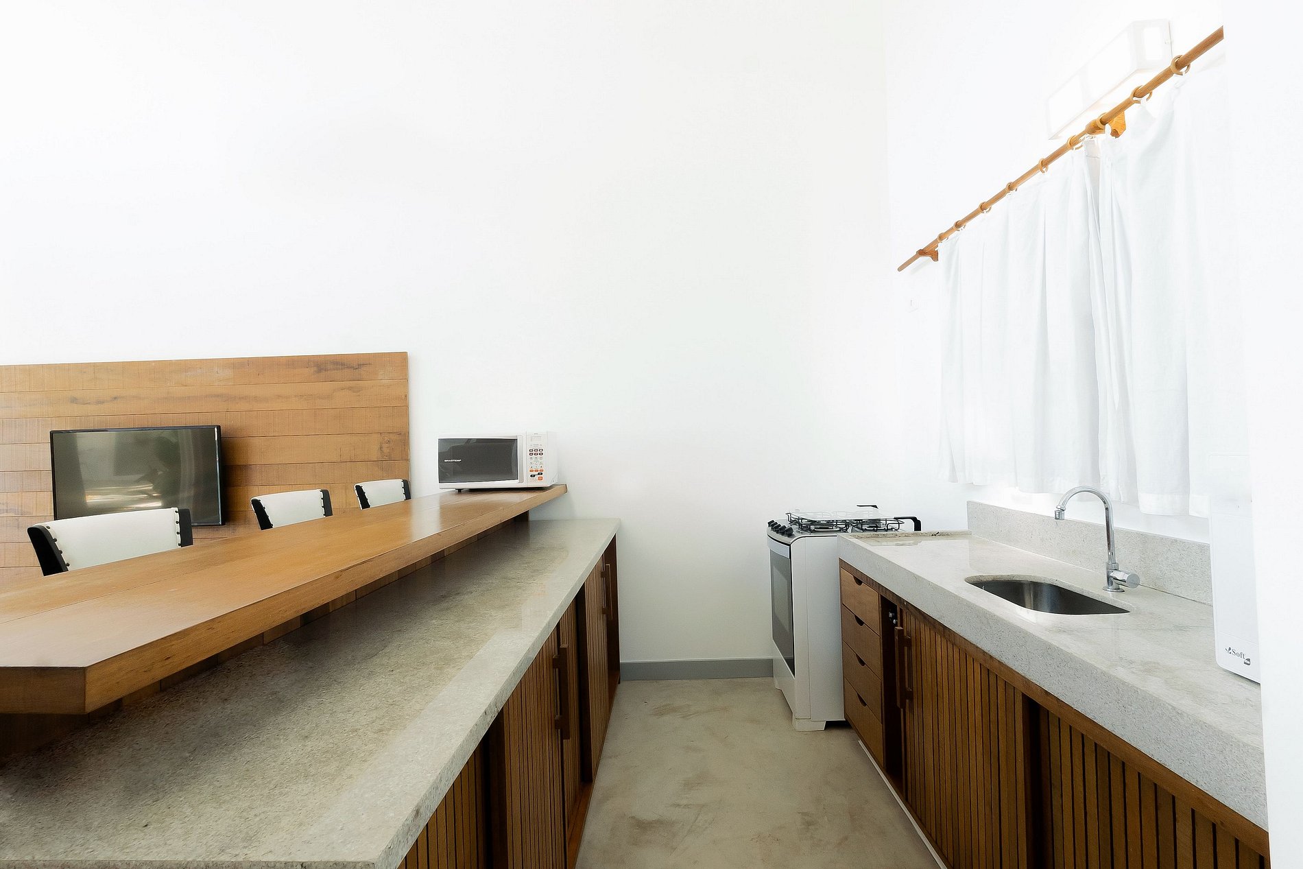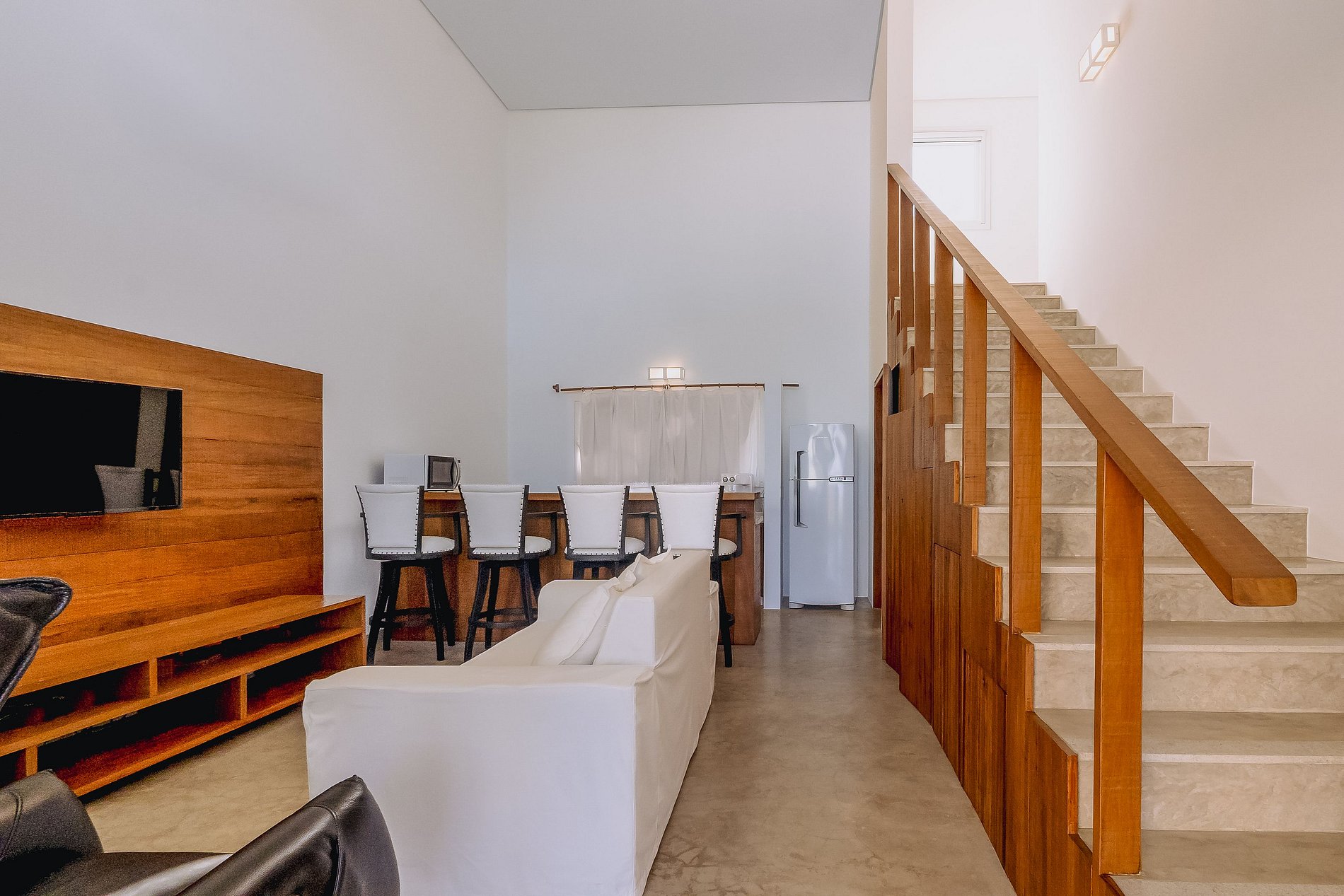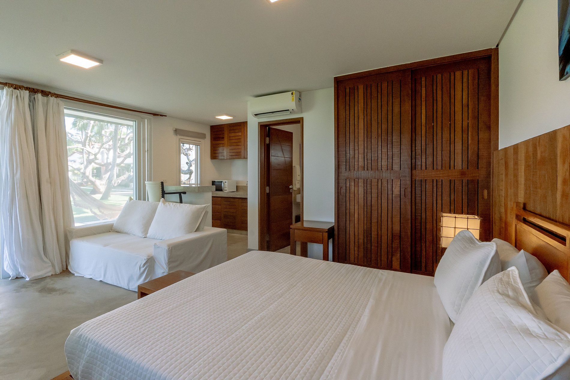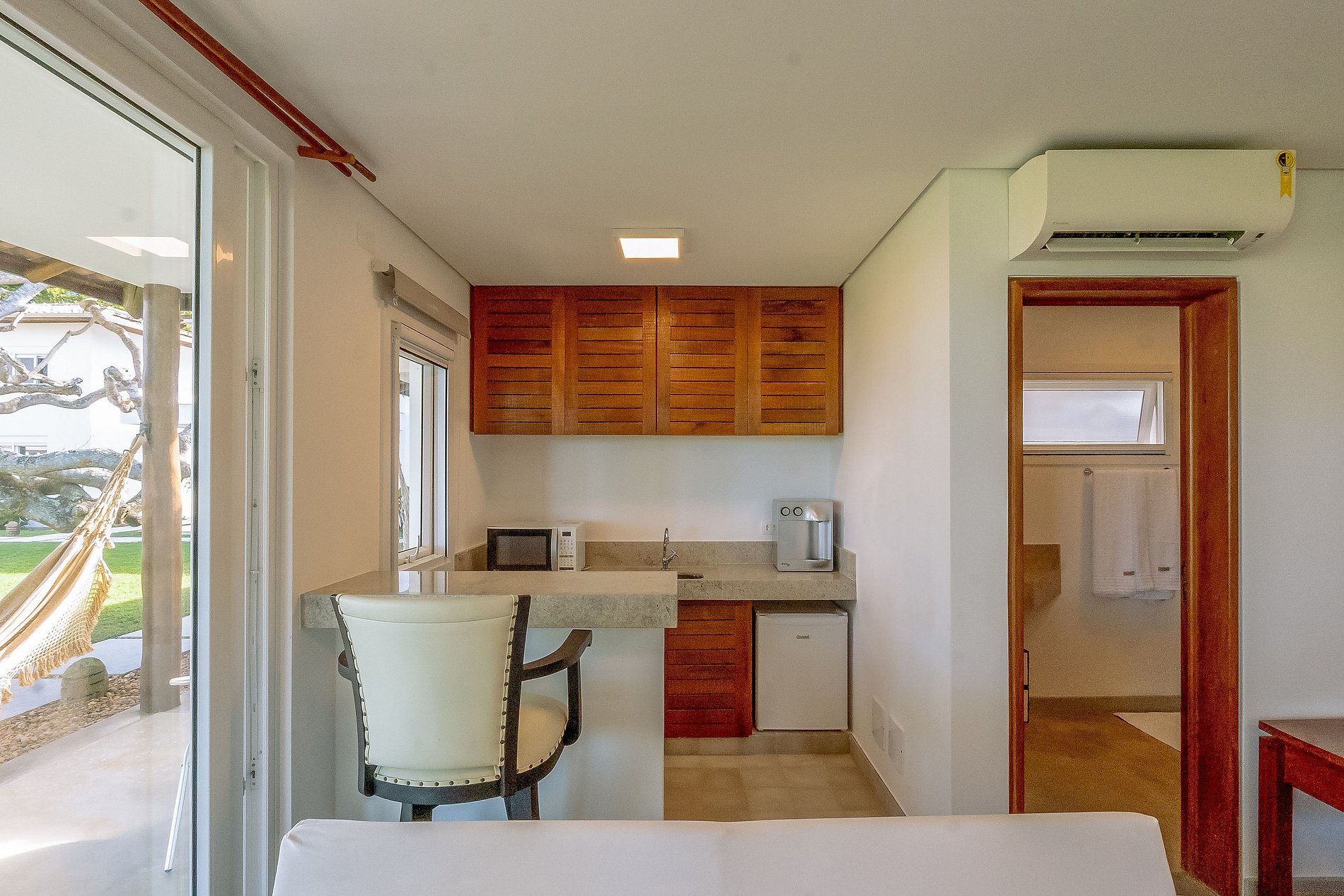 Na área externa tem 5 construções com chalés individuais e entrada privativa. São chalés pois todo quarto além de cama, banheiro, ar condicionado e smartv; tem também uma bancada de granito na cozinha, frigobar e microondas. Tudo sempre com muita qualidade, boa decoração e conforto.
