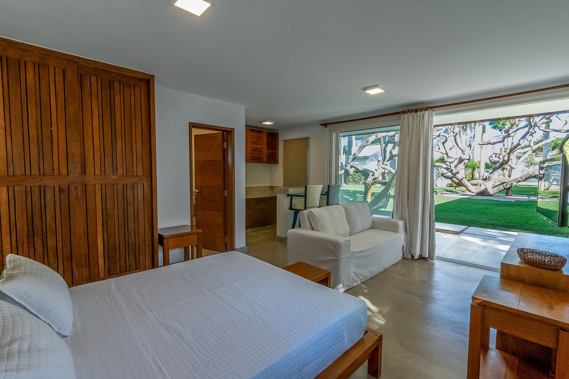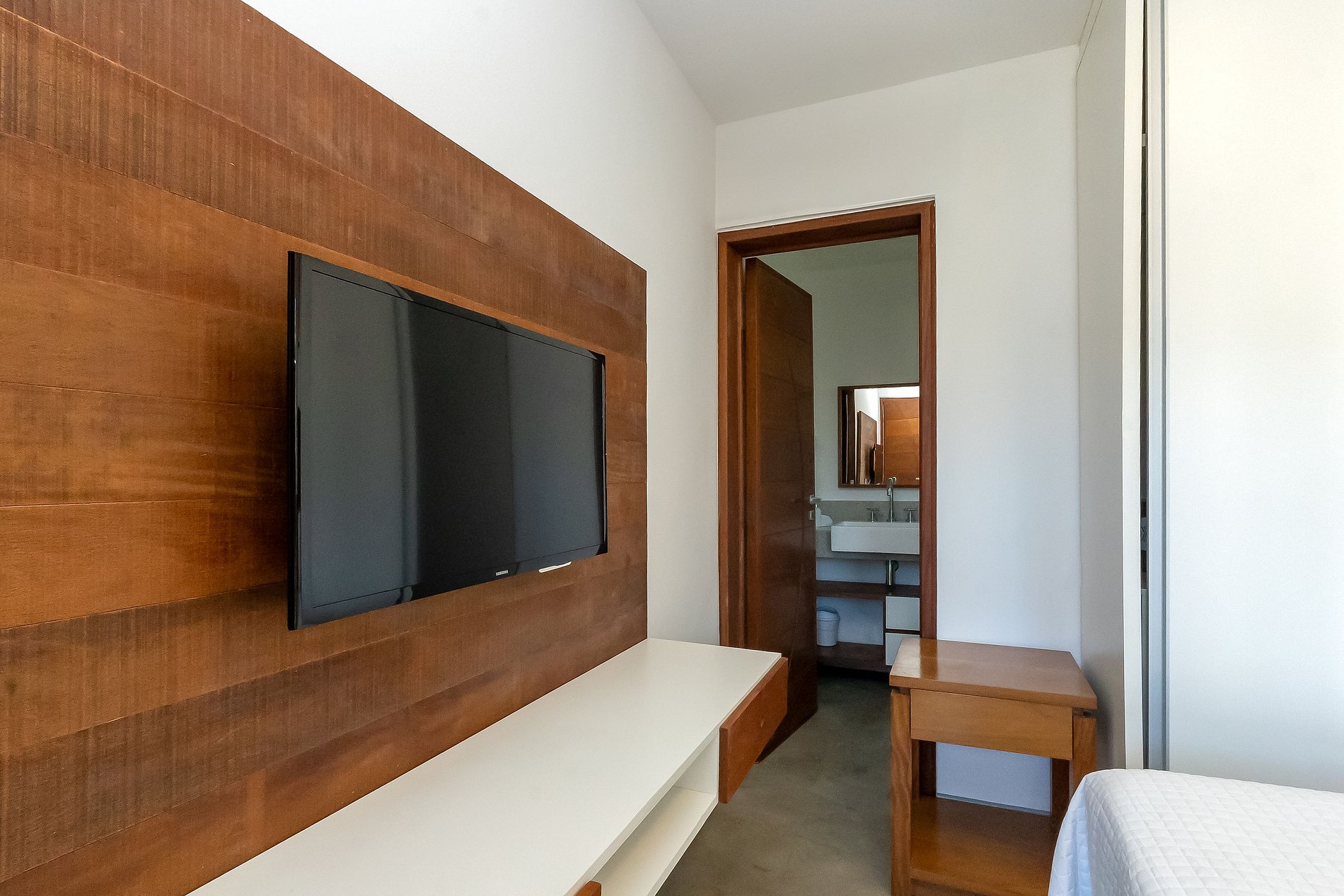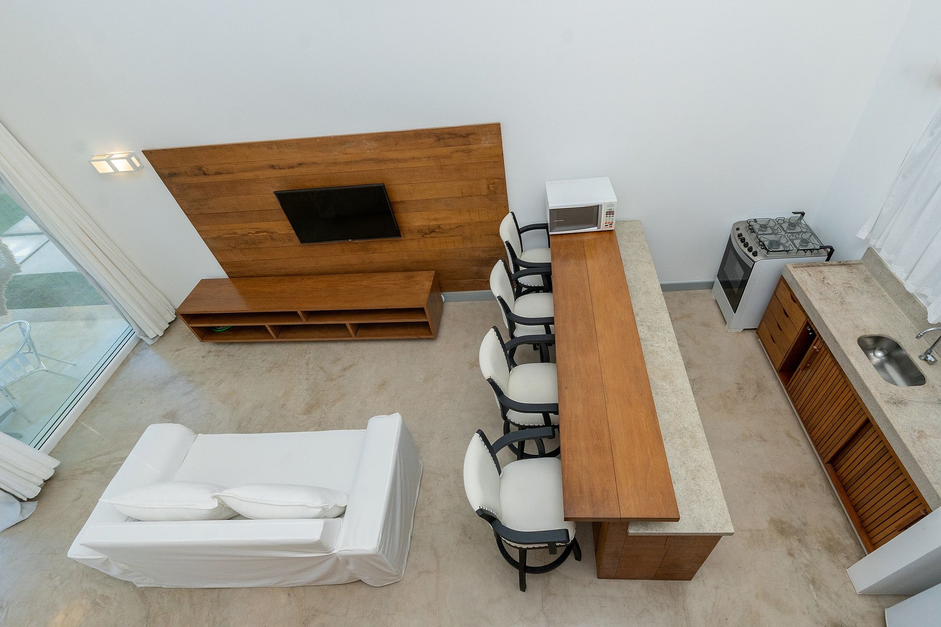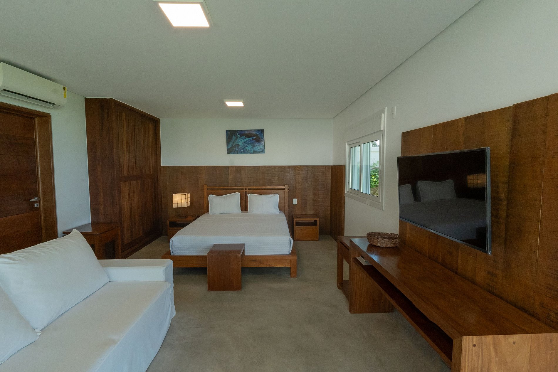 Na área externa tem 5 construções com chalés individuais e entrada privativa. São chalés pois todo quarto além de cama, banheiro, ar condicionado e smartv; tem também uma bancada de granito na cozinha, frigobar e microondas. Tudo sempre com muita qualidade, boa decoração e conforto.