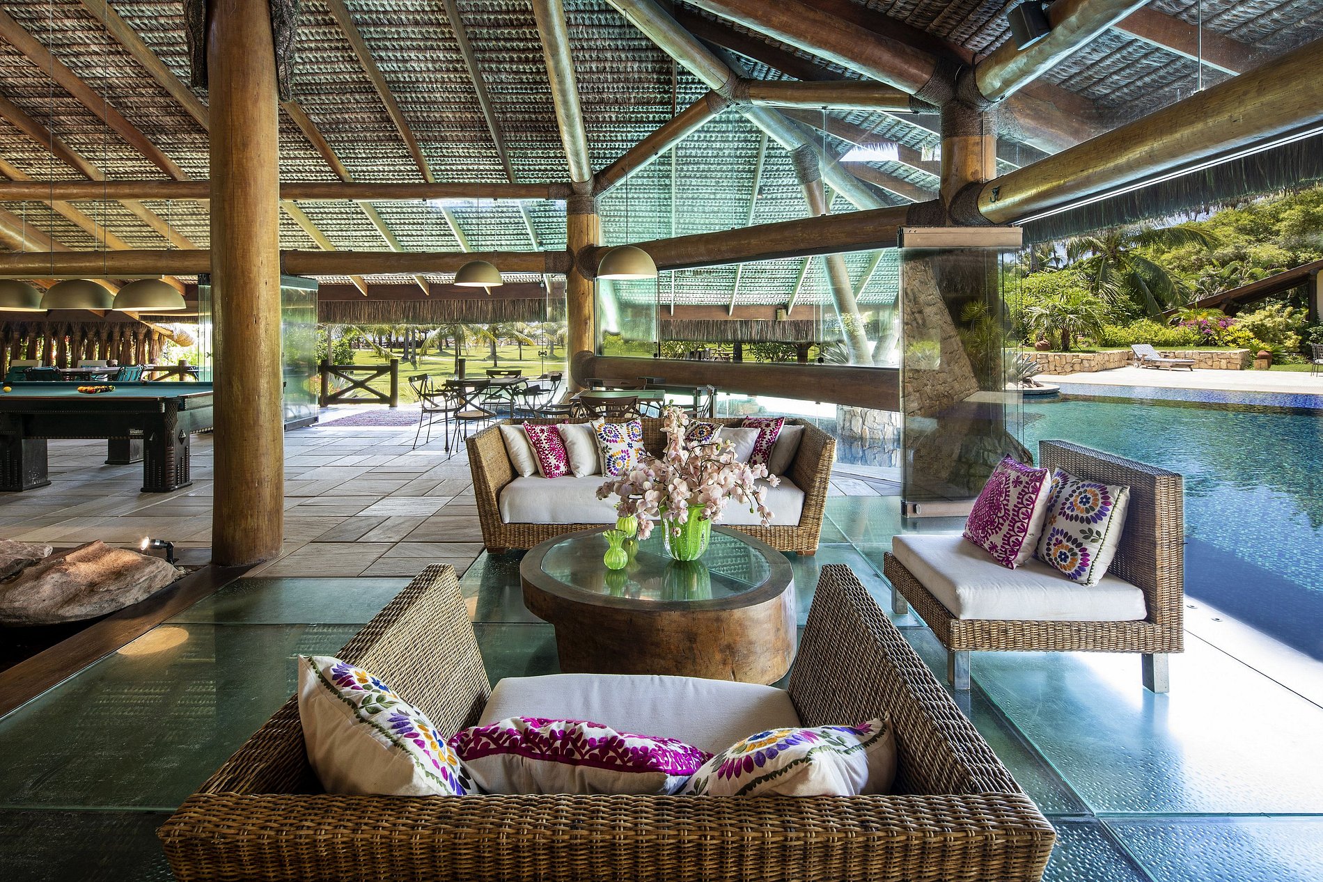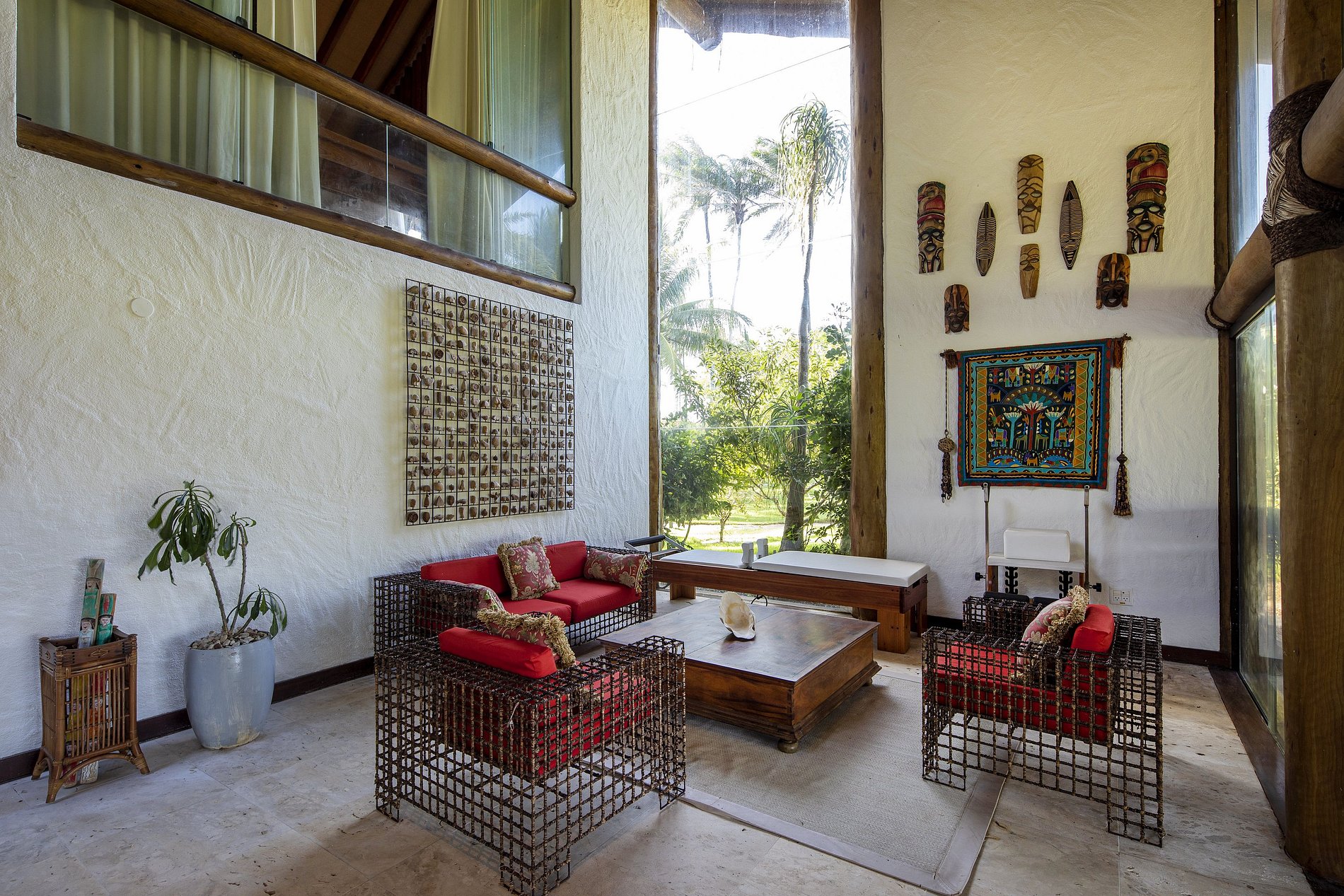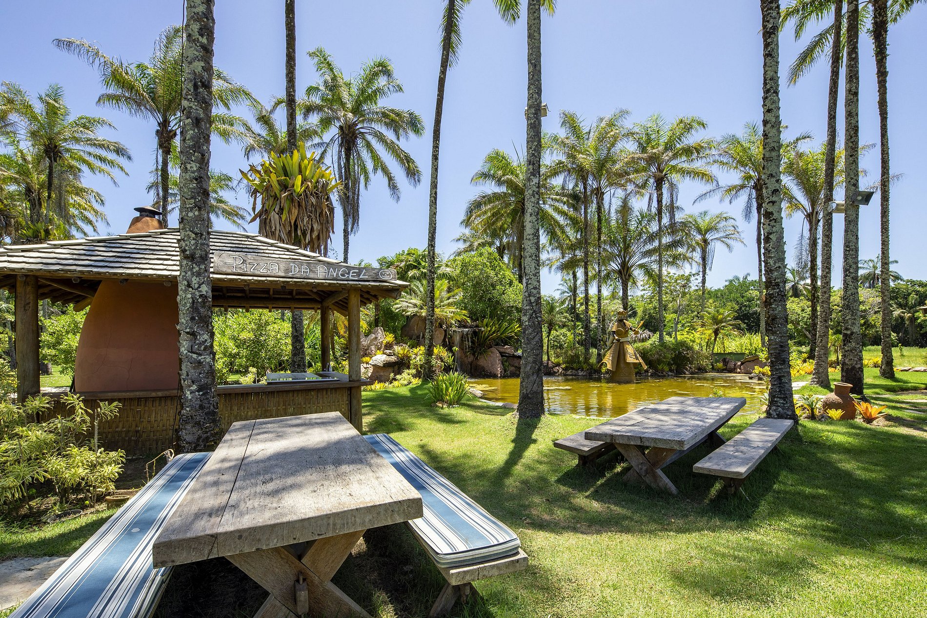A propriedade de 3600m² de área construída. Esbanja beleza em sua arquitetura. Sua casa principal é um imenso bangalô, com decoração central onde estão reunidos os principais cômodos como: sala de estar decorada com arquitetura local, área de jogos com mesa de sinuca, sala de jantar com mesa de madeira rústica, diversos lounges, adega e cozinha profissional.