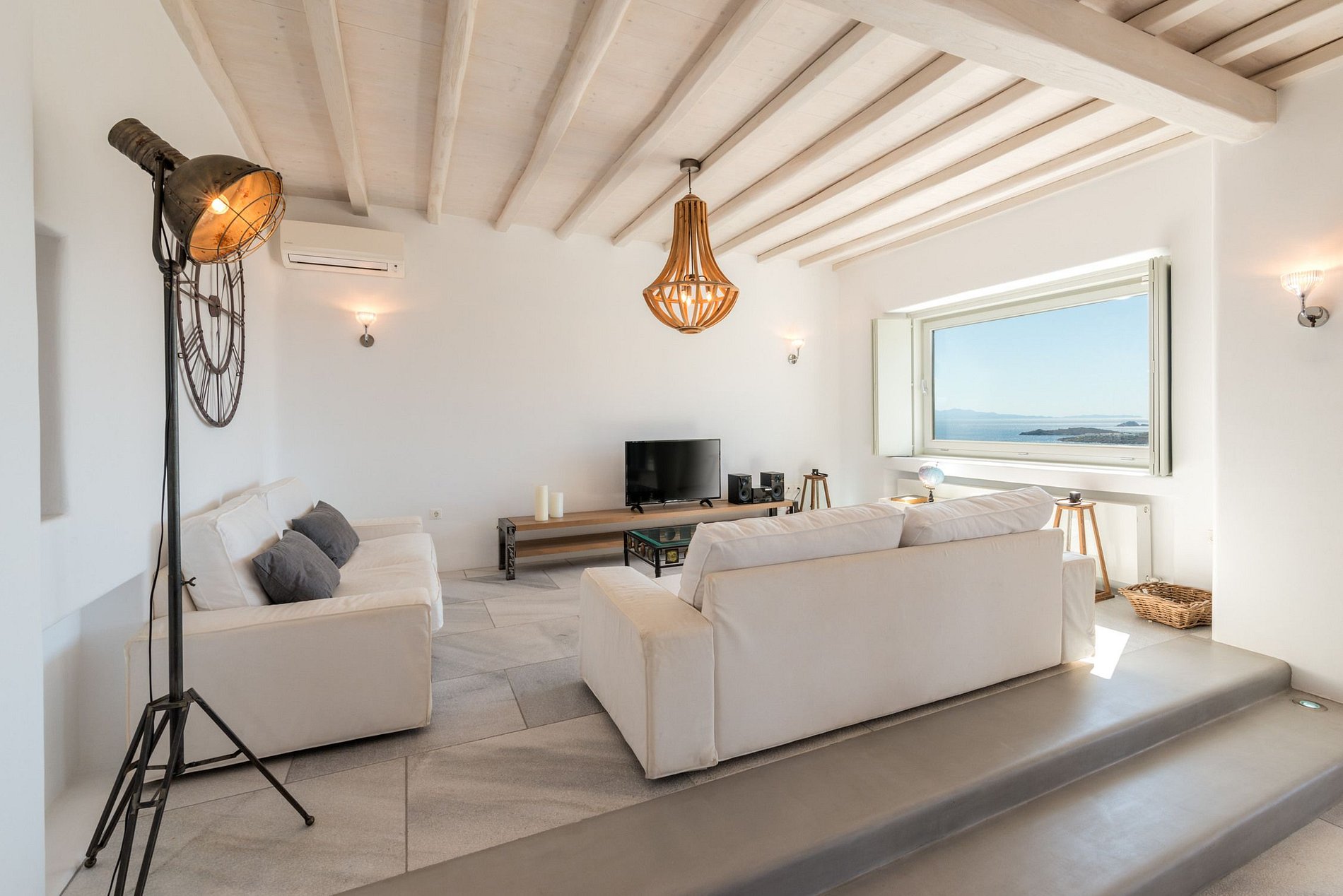 A espaçosa villa de 230m2 está rodeada pela beleza e serenidade do espírito de Mykonos com detalhes encantadores e uma esplêndida vista do topo da colina.