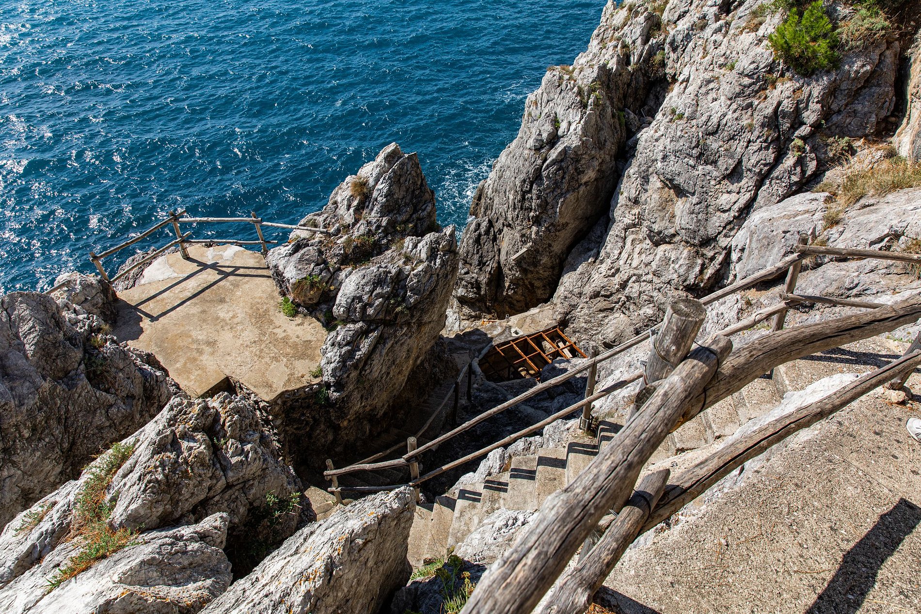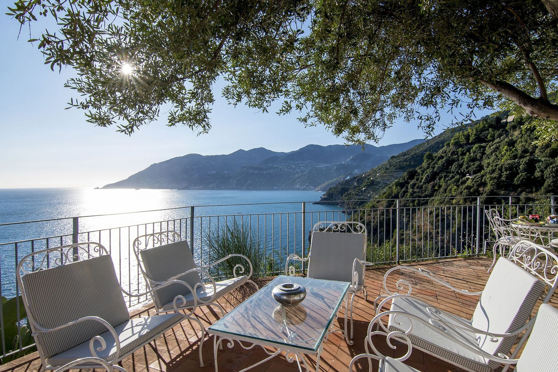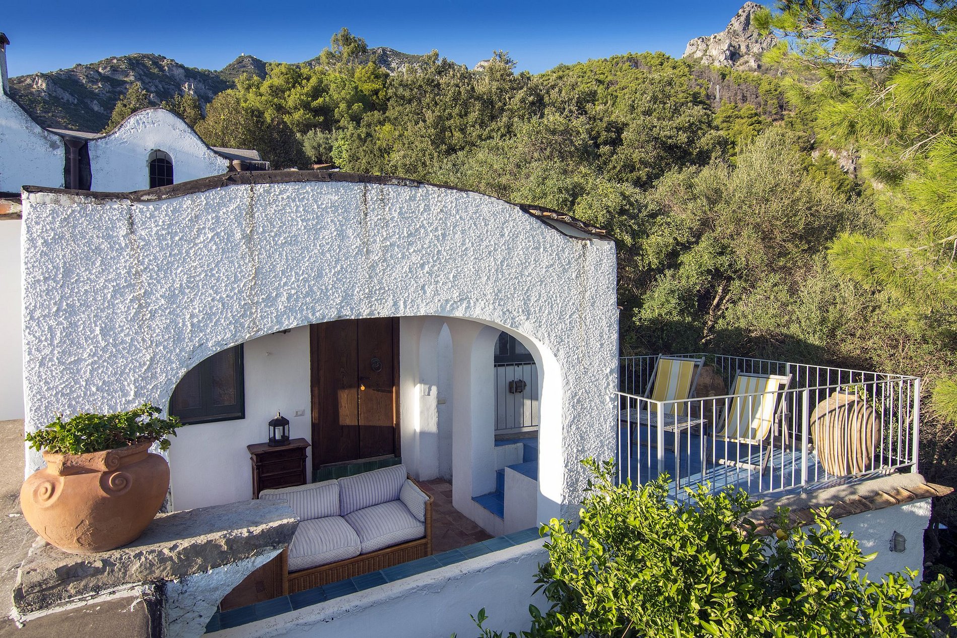 Os terrenos desta vivenda para aluguer de férias descem a encosta da estrada costeira através da densa vegetação mediterrânica de pinhais perfumados, treliças de limoeiros e jardins bem cuidados até ao mar.