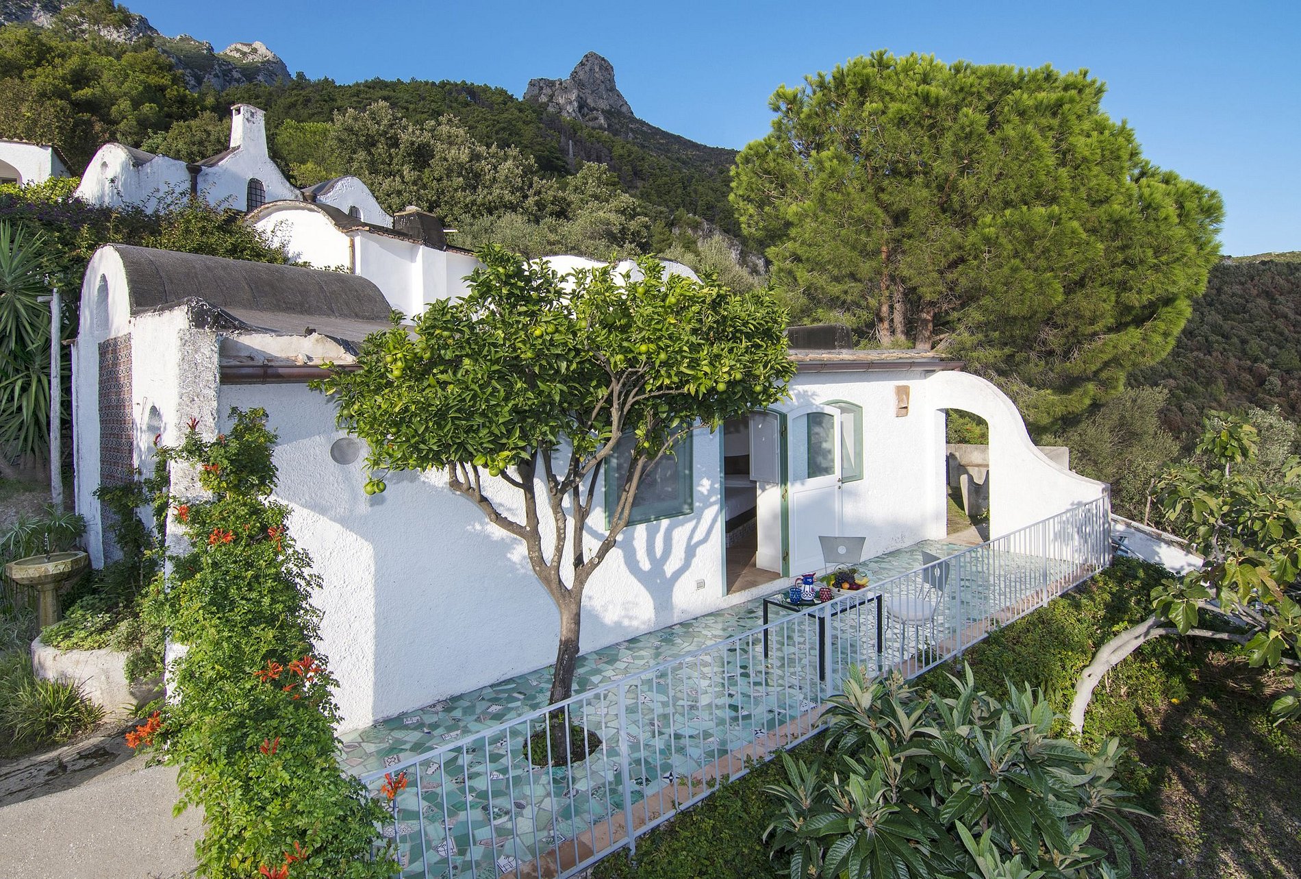 Os terrenos desta vivenda para aluguer de férias descem a encosta da estrada costeira através da densa vegetação mediterrânica de pinhais perfumados, treliças de limoeiros e jardins bem cuidados até ao mar.