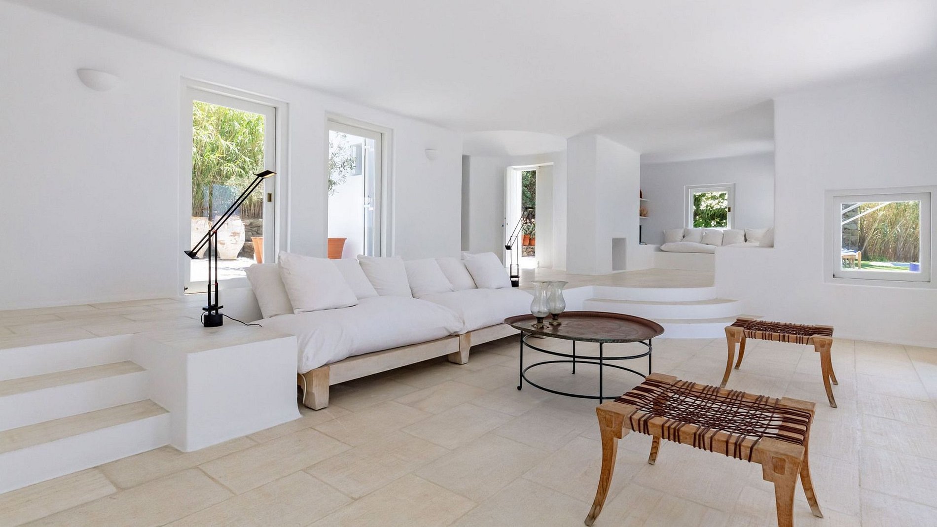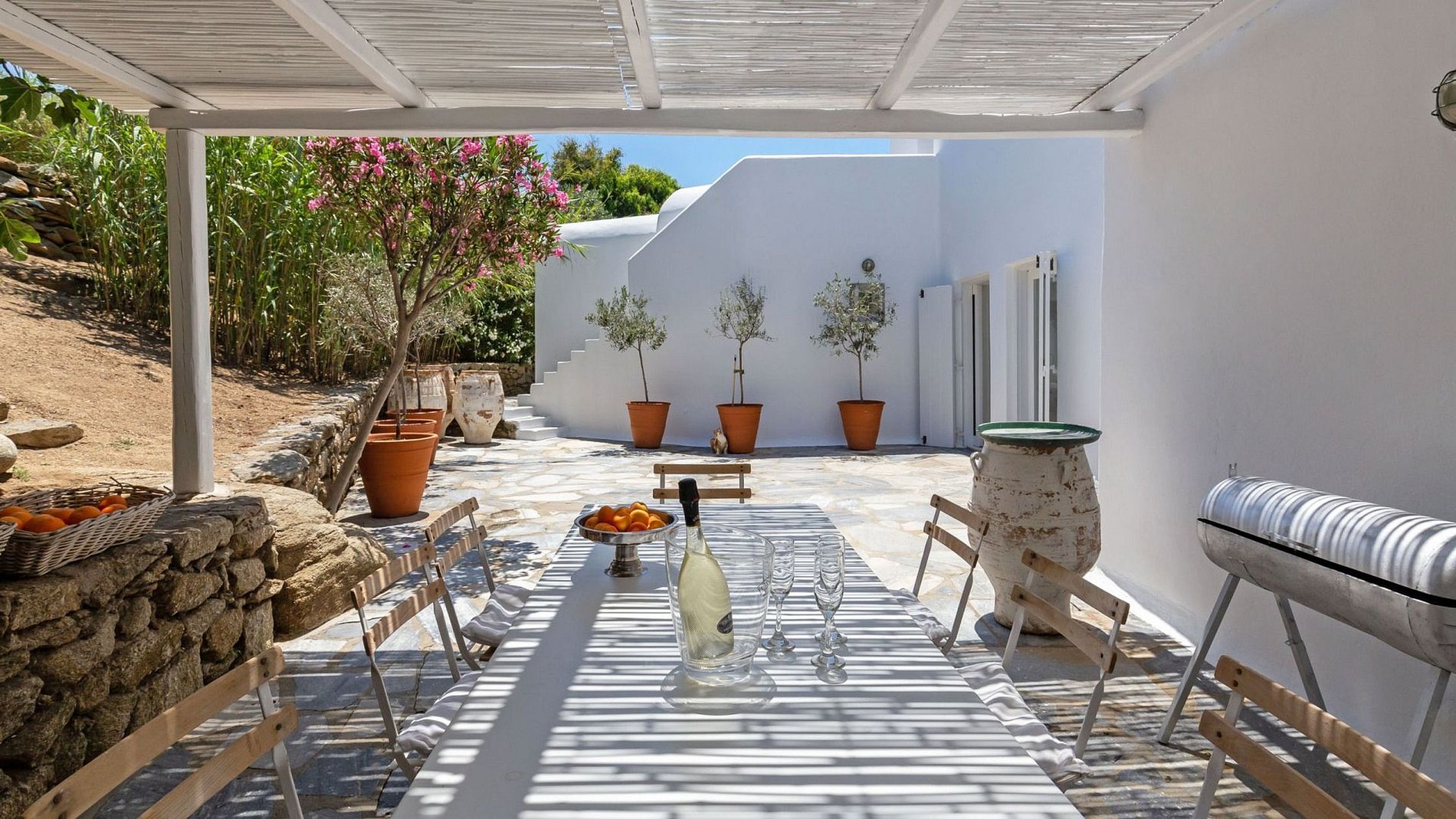 Esta villa com um design de tipo minimalista está localizada logo acima do antigo porto de Mykonos e rodeada por mais de 60 oliveiras. Um caminho de pedras brancas leva os hóspedes a uma pérgula embutida à sombra ao longo do olival, permitindo agradáveis refeições ao ar livre. Apenas a três minutos a pé do centro histórico, a villa está localizada no meio de um grande jardim e tem vista para o porto, as ilhas de Rhenia, Syros e Tinos.