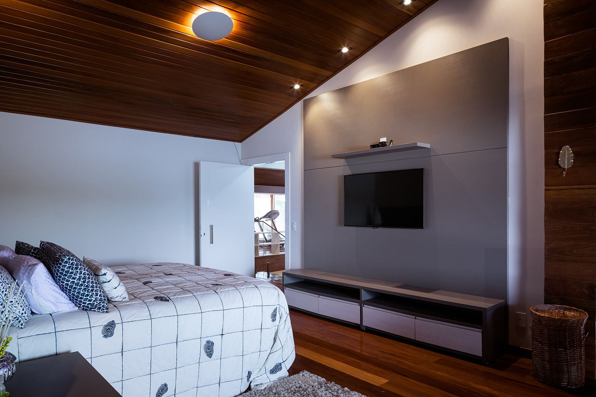 A primeiro andar da casa compõe numa grande sala de estar com uma grande tv e área de jantar com uma igualmente grande mesa composta por 18 lugares e cozinha totalmente equipada. No mesmo cômodo, subindo alguns degraus está a área de lounge com bar e equipamentos de DJ, feito para animar festas. No segundo andar temos 5 suites com cama de casal sendo um delas tendo 1 cama de solteiro, e uma sexta suíte contendo 3 beliches para crianças.