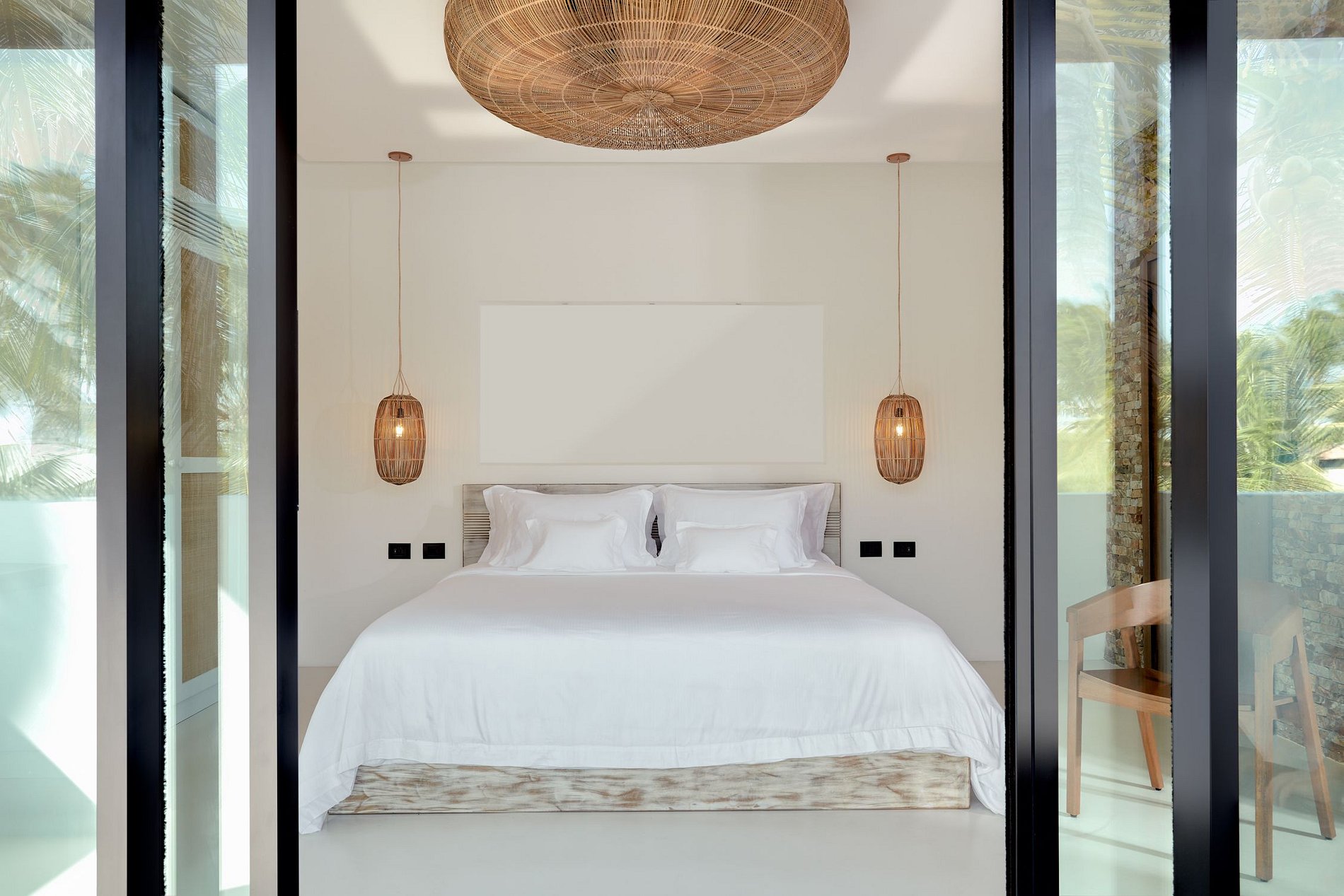 Suíte Coconut : Com uma linda vista para o mar e uma maravilhosa varanda privativa, esta suíte localizada no primeiro andar com 50m2 é composta por uma cama de casal super king size, escrivaninha, frigobar, ar condicionado, cofre e smart TV 48 ”