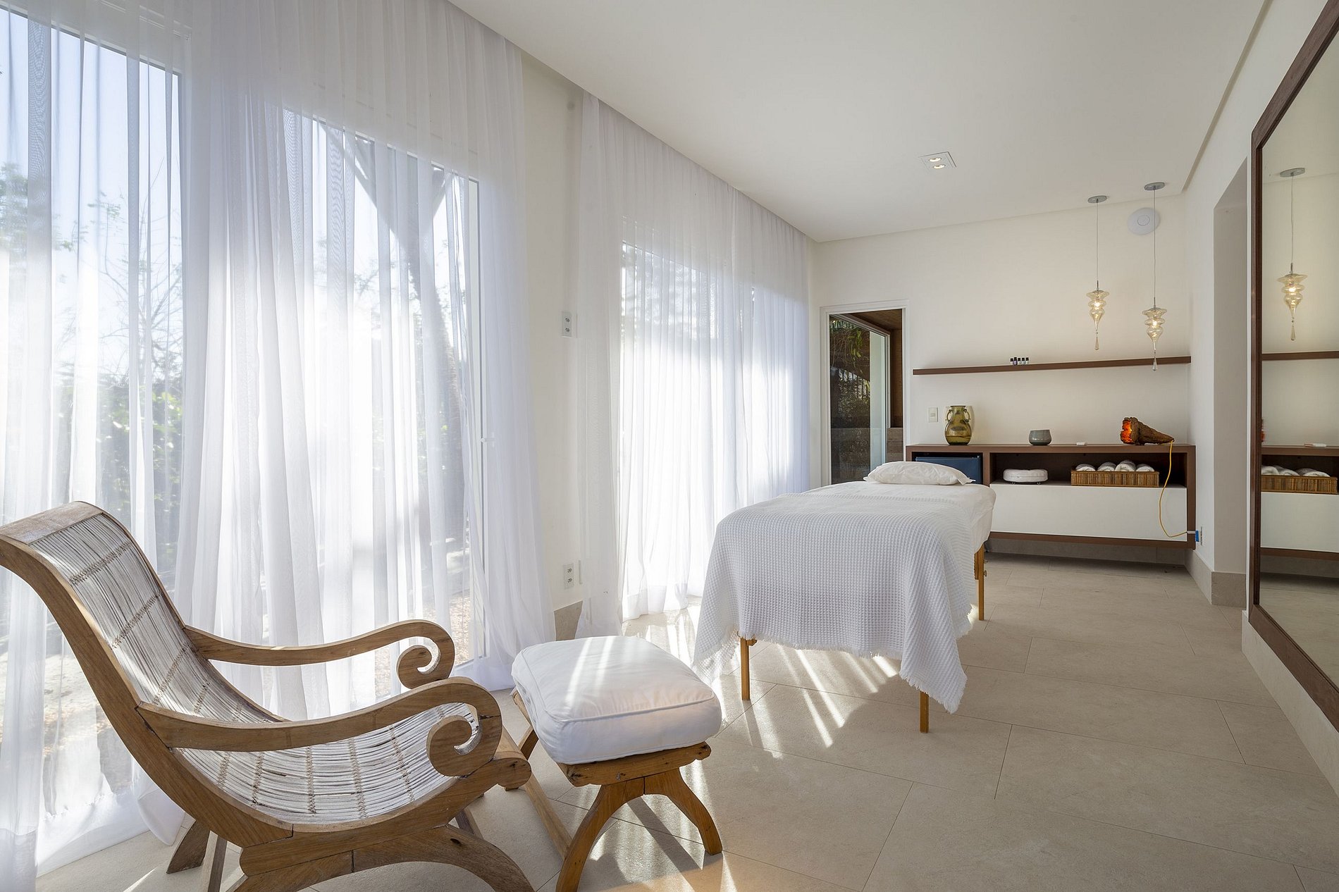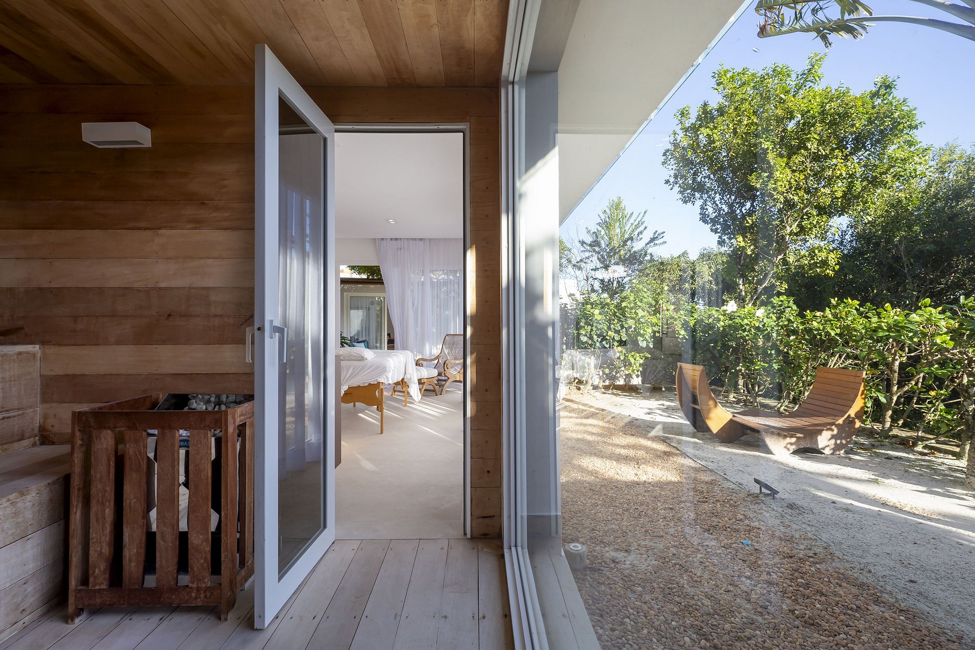 Do lado de fora são duas incríveis piscinas, sendo uma com borda infinita e outra em estilo espelho d'água. Uma Sauna seca espaçosa de vidro com vista para a mata também está a sua disposição. Passe na sala de massagem com frigobar, lavabo e chuveiros para relaxar.