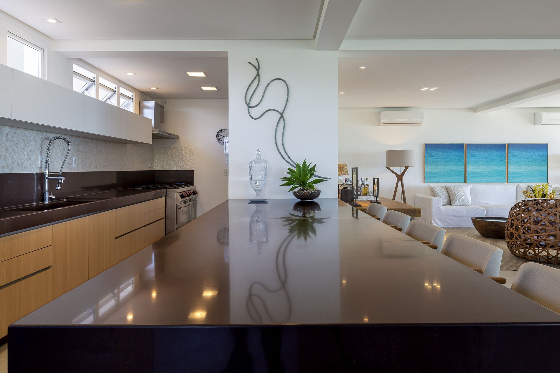 A cozinha é equipada com adega 96 garrafas, cervejeira, freezer vertical e horizontal, fogão industrial, 2 geladeiras, máquina gelo, conjunto de itens de mesa posta.