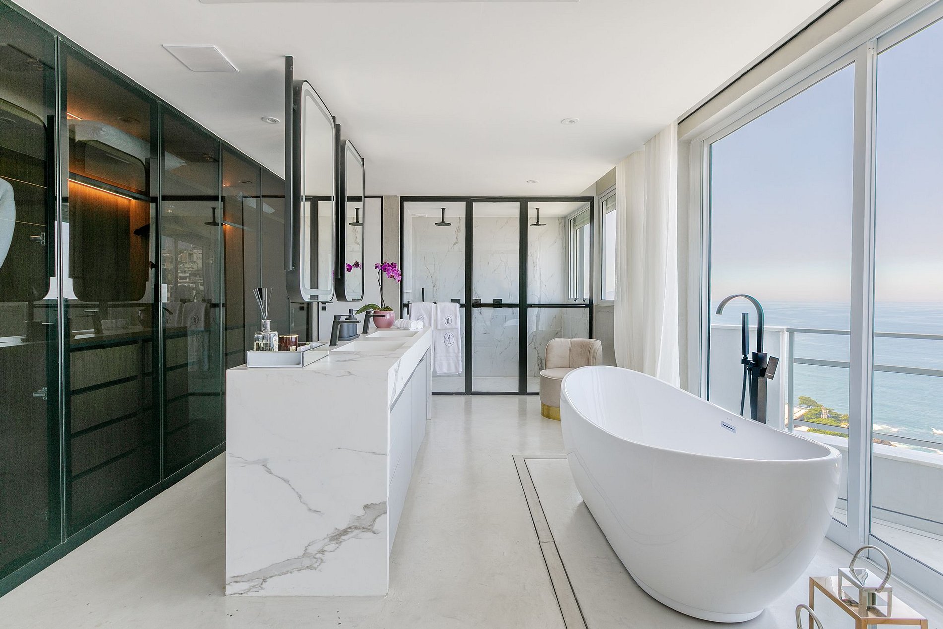 - Suíte master: Cama king-size, banheiro privativo grande, banheira, smartv acoplada em elevador flat lift