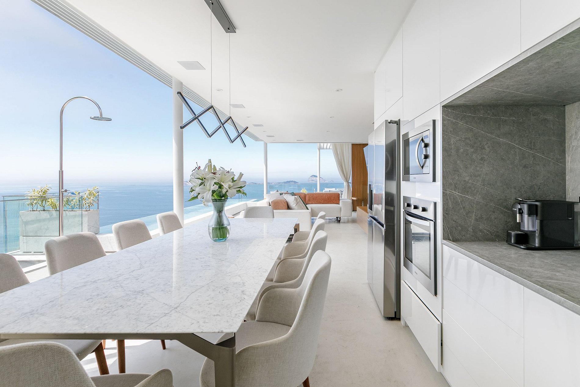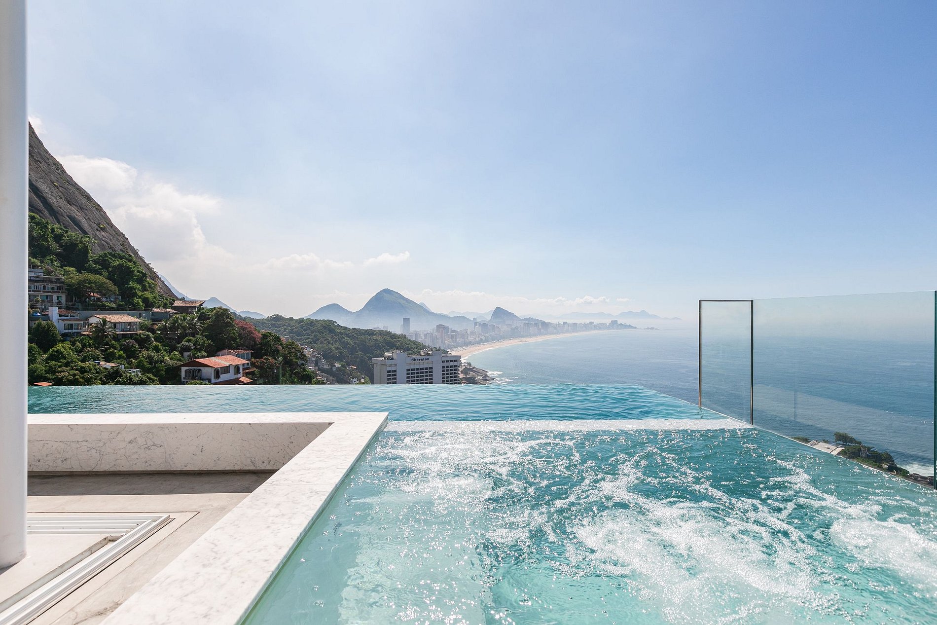 Na área externa da cobertura encontra-se uma linda piscina de borda infinita com jacuzzi, perfeita para apreciar o horizonte da cidade maravilhosa com sua beleza natural.