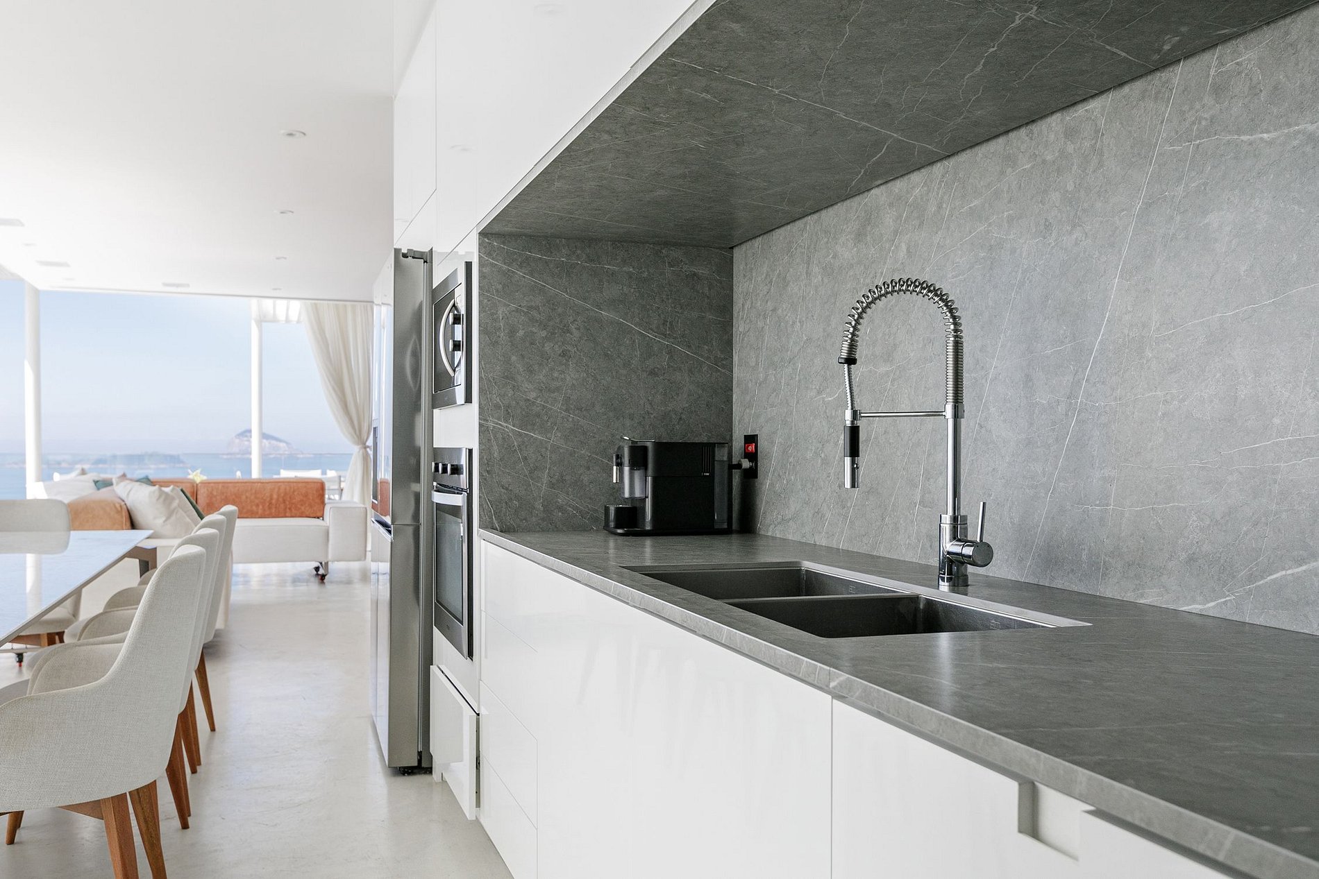 O segundo andar é onde está o ponto alto da cobertura, todo o andar possuí ambiente aberto, climatizado que mescla sala de estar, jantar e cozinha, todos os ambientes são impecavelmente decorados com qualidade e sofisticação. A área de estar compõe uma grande smartv para curtir filmes e séries e um espaço com amplo sofá para contemplar a linda imensidão do mar.