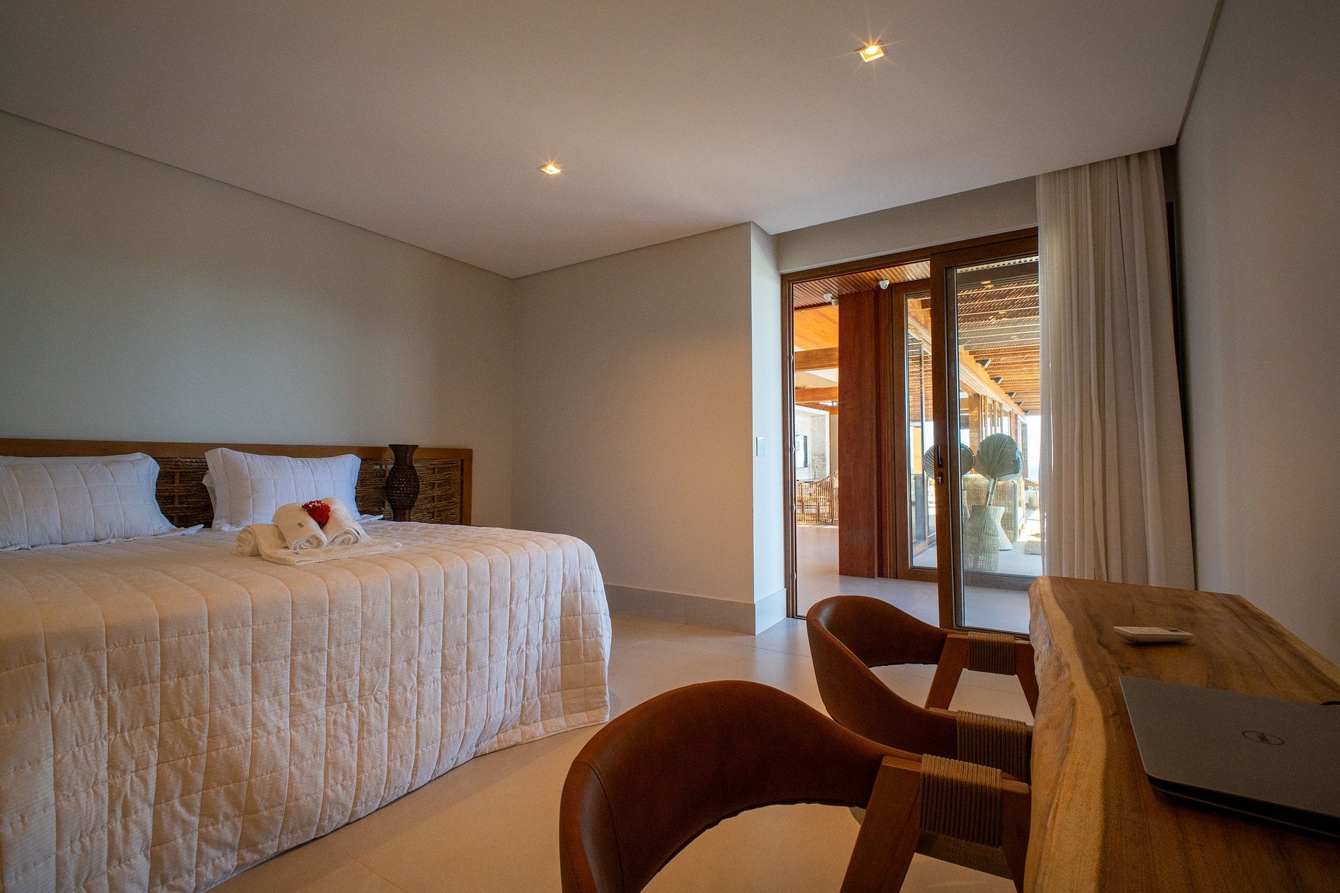 São 09 suítes, todas com vista mar e/ou mata, sendo uma delas também brinquedoteca. Piscina de 80m² com borda infinita unindo o horizonte do mar. Academia, SPA com sauna e sala de massagem, cozinha gourmet e adega, dentro de um condomínio exclusivo fechado com apenas 4 casas. O acesso à praia se dá por uma escada particular.
