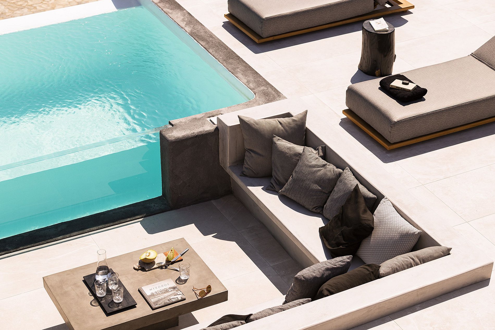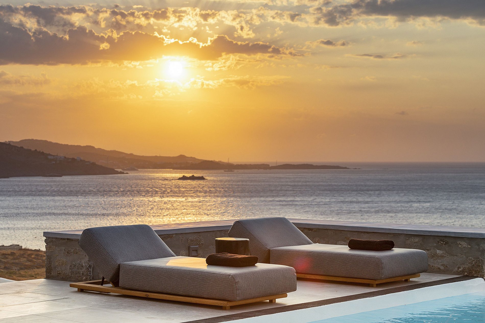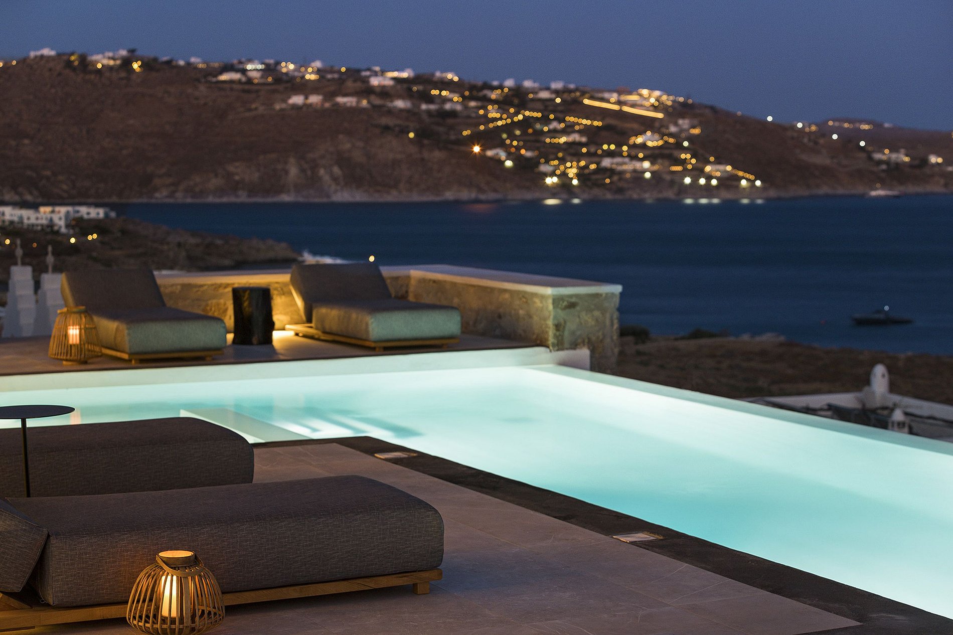 Destaques ao ar livre: piscina, terraço e área de estar ao lado da piscina. As vistas são garantidas de todos os cantos do terraço, mesmo da privacidade da área de refeições ao ar livre - localizada na parte mais discreta e protegida do vento do terraço. Coquetéis noturnos com um belo pôr do sol na área do lounge à beira da piscina são imperdíveis antes de sair à noite.