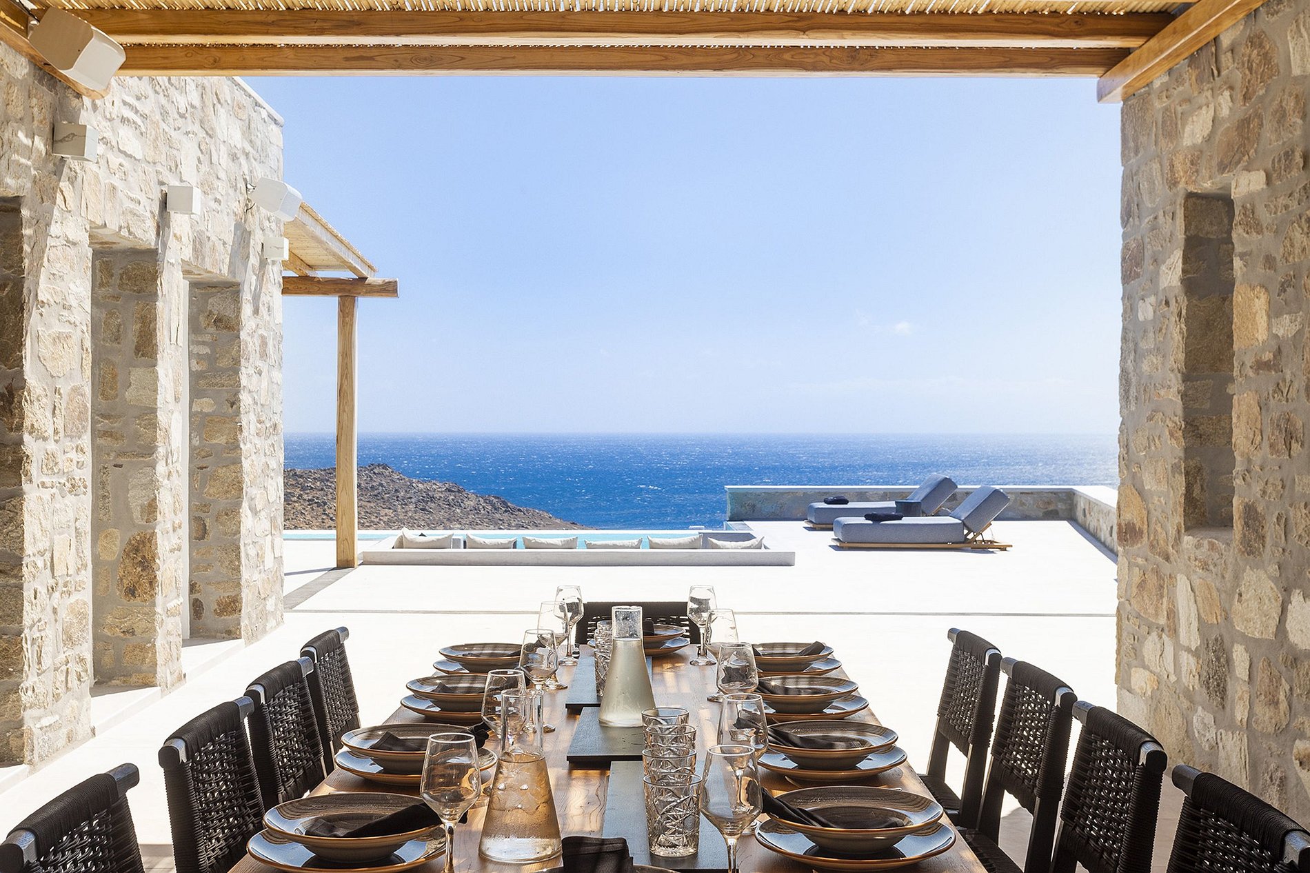 Destaques ao ar livre: piscina, terraço e área de estar ao lado da piscina. As vistas são garantidas de todos os cantos do terraço, mesmo da privacidade da área de refeições ao ar livre - localizada na parte mais discreta e protegida do vento do terraço. Coquetéis noturnos com um belo pôr do sol na área do lounge à beira da piscina são imperdíveis antes de sair à noite.
