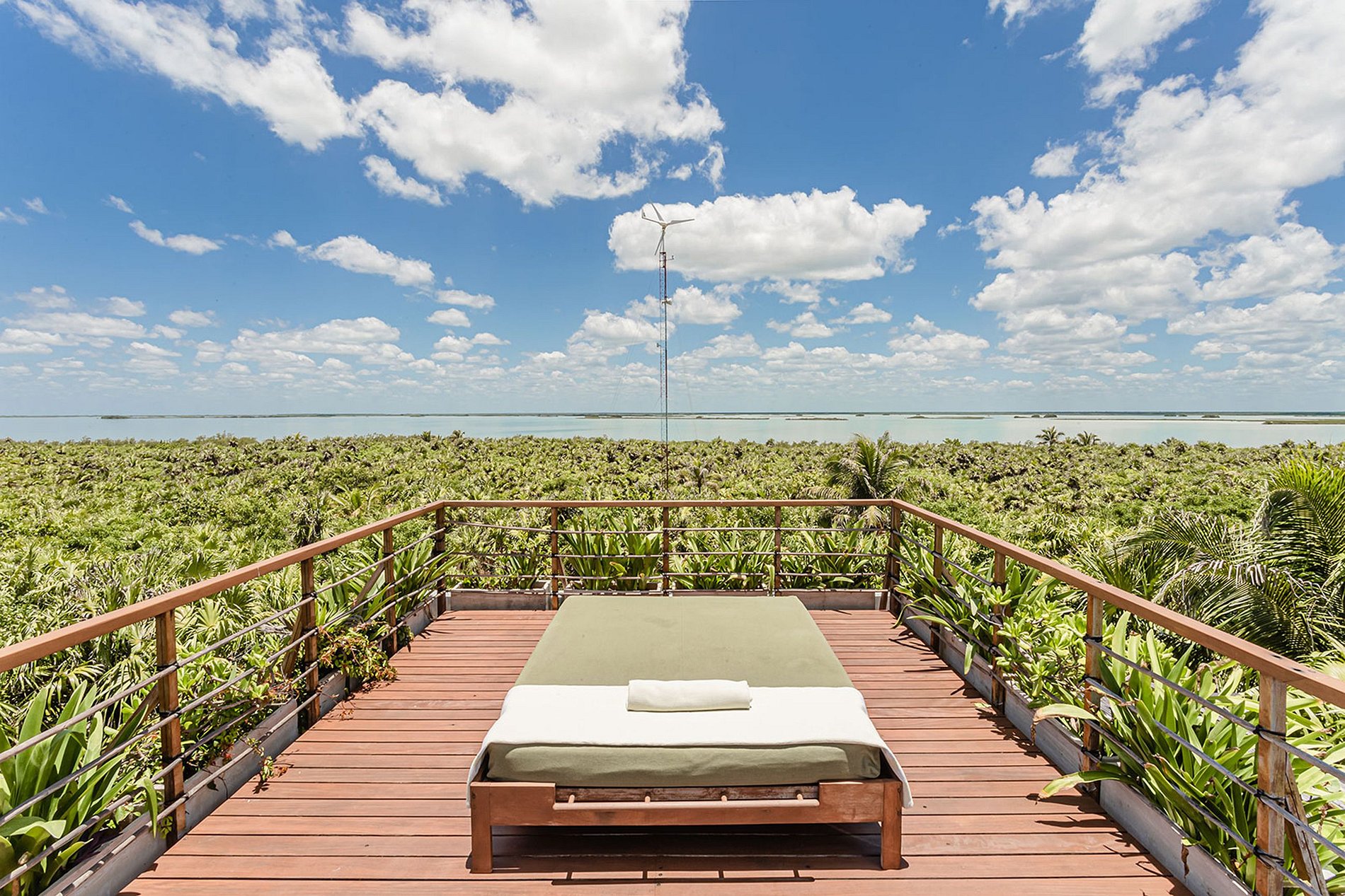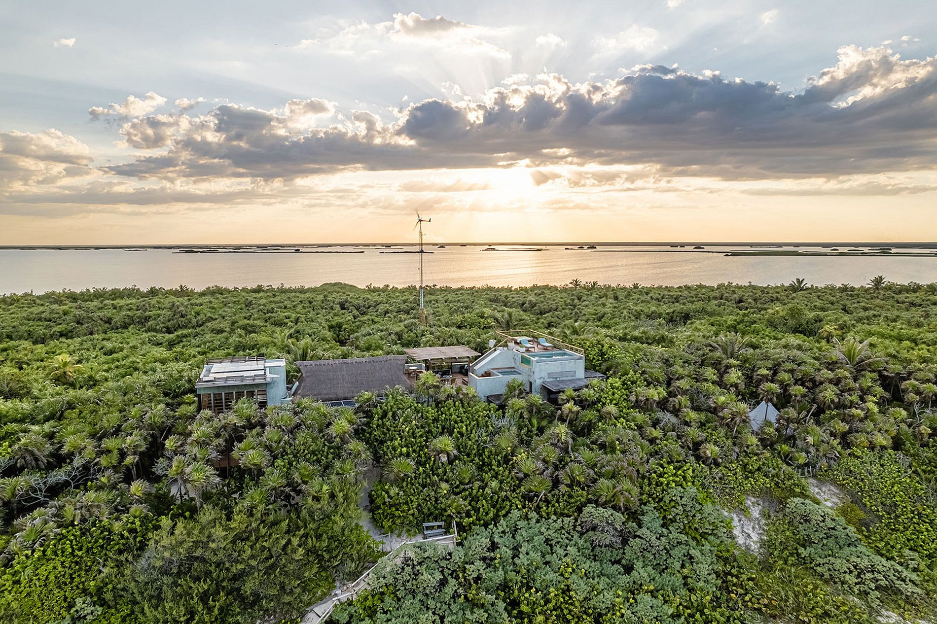 As dunas naturais, com suas palmeiras e redes aconchegantes, combinadas com os telhados de palha, formam apenas um prelúdio de uma área totalmente privada, que continua por uma paradisíaca praia de areia branca. Subindo até o terraço, você tem acesso a uma vista hipnotizante, de 360 graus, podendo apreciar todas as belezas do entorno: um lago de um lado e o Mar do Caribe de outro. Dessa forma, o deck do telhado é o lugar ideal para assistir a pôr do sol espetacular, tendo também uma piscina infinita onde você pode passar horas relaxando e contemplando o oceano.