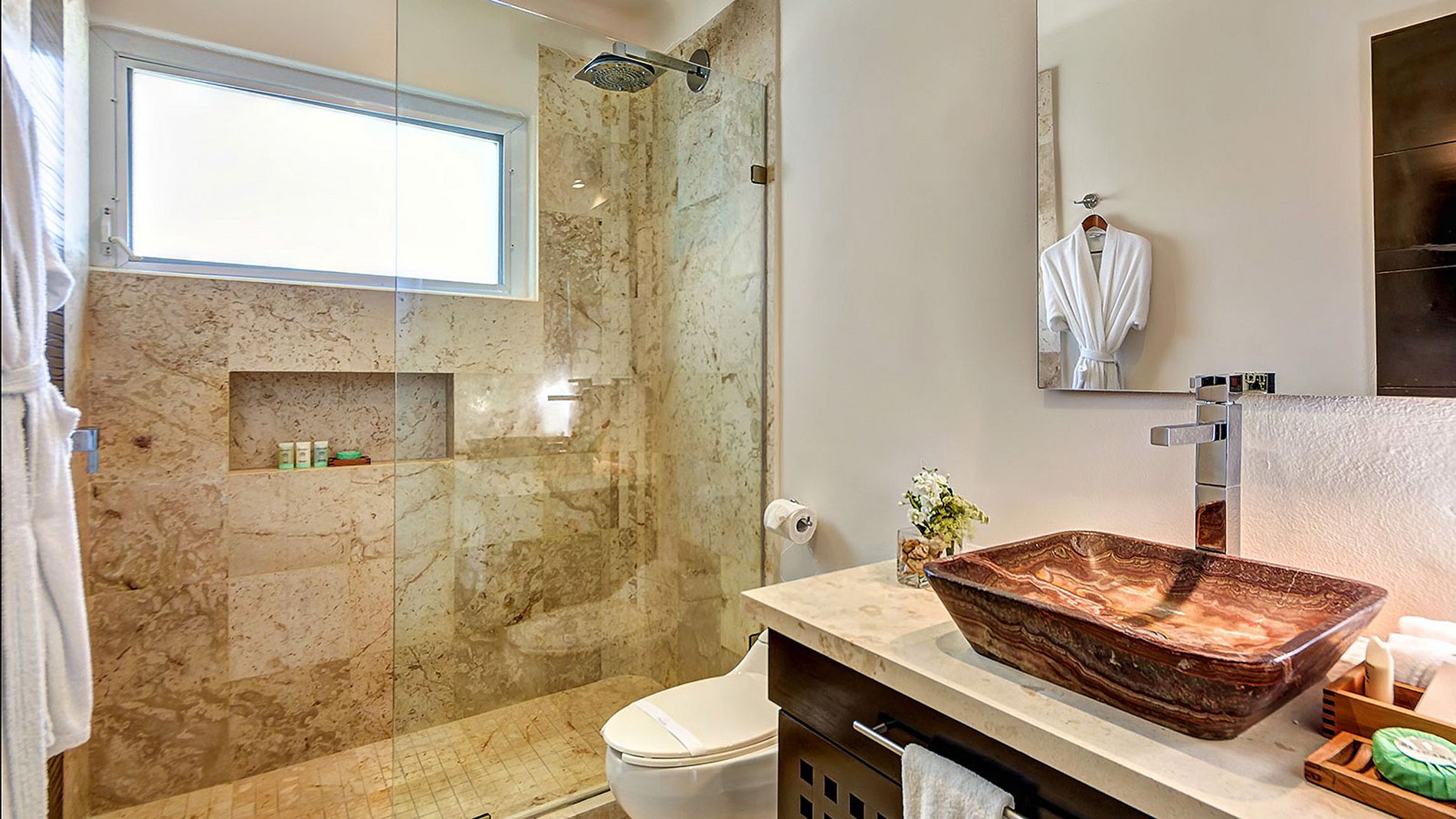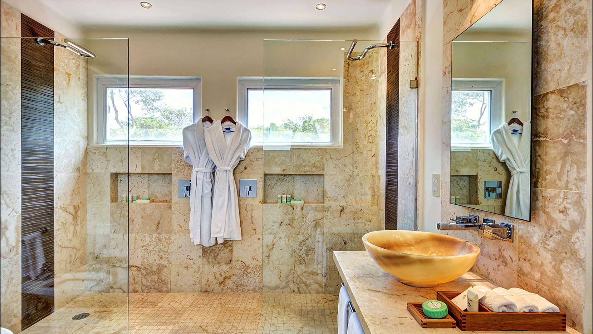 Os quartos têm um design minimalista e oferecem uma sensação de organização, frescor e muito espaço. Os banheiros são todos equipados com chuveiros no estilo italiano, que oferecem aos hóspedes um toque de elegância durante o banho. O ônix natural confere às pias do banheiro um visual único e luxuoso. Cada quarto tem seu próprio banheiro privativo, e três dos quartos oferecem TV de tela plana. O quarto principal possui ainda um grande closet.