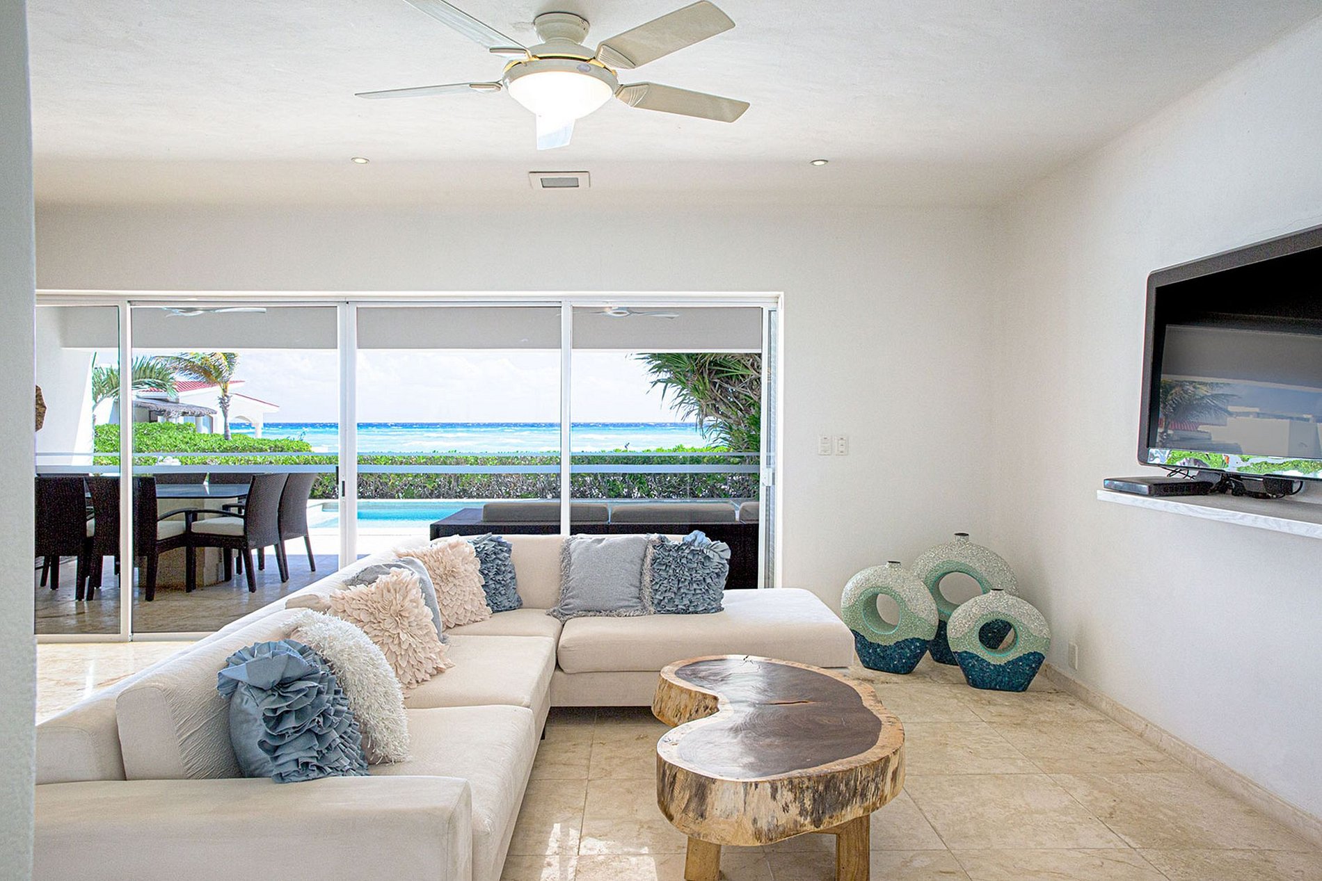Para grupos maiores, este paraíso é uma ótima oportunidade para um estada maravilhosa, acomodando até 16 pessoas em 6 quartos espaçosos. Você se sentira em casa na cozinha aberta e totalmente equipada, podendo desfrutar de refeições ao ar livre em meio à suave brisa do Caribe. Se você gosta de comtemplar o céu e as estrelas, assim como as luzes distantes de Cozumel, aproveite o terraço e relaxe em grande estilo nas espreguiçadeiras.