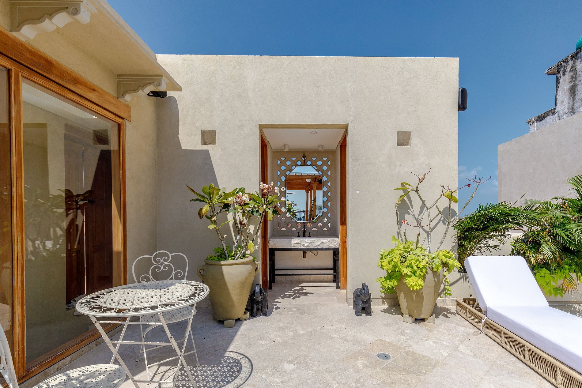 Decorada em tons quentes e terrosos, com materiais rústicos de madeira, fibras naturais e detalhes coloridos, a casa é cercada por vegetação exuberante e elementos decorativos artesanais. Os tetos altos e a combinação harmoniosa de estética colonial e modernidade fazem desta propriedade um espaço verdadeiramente único.