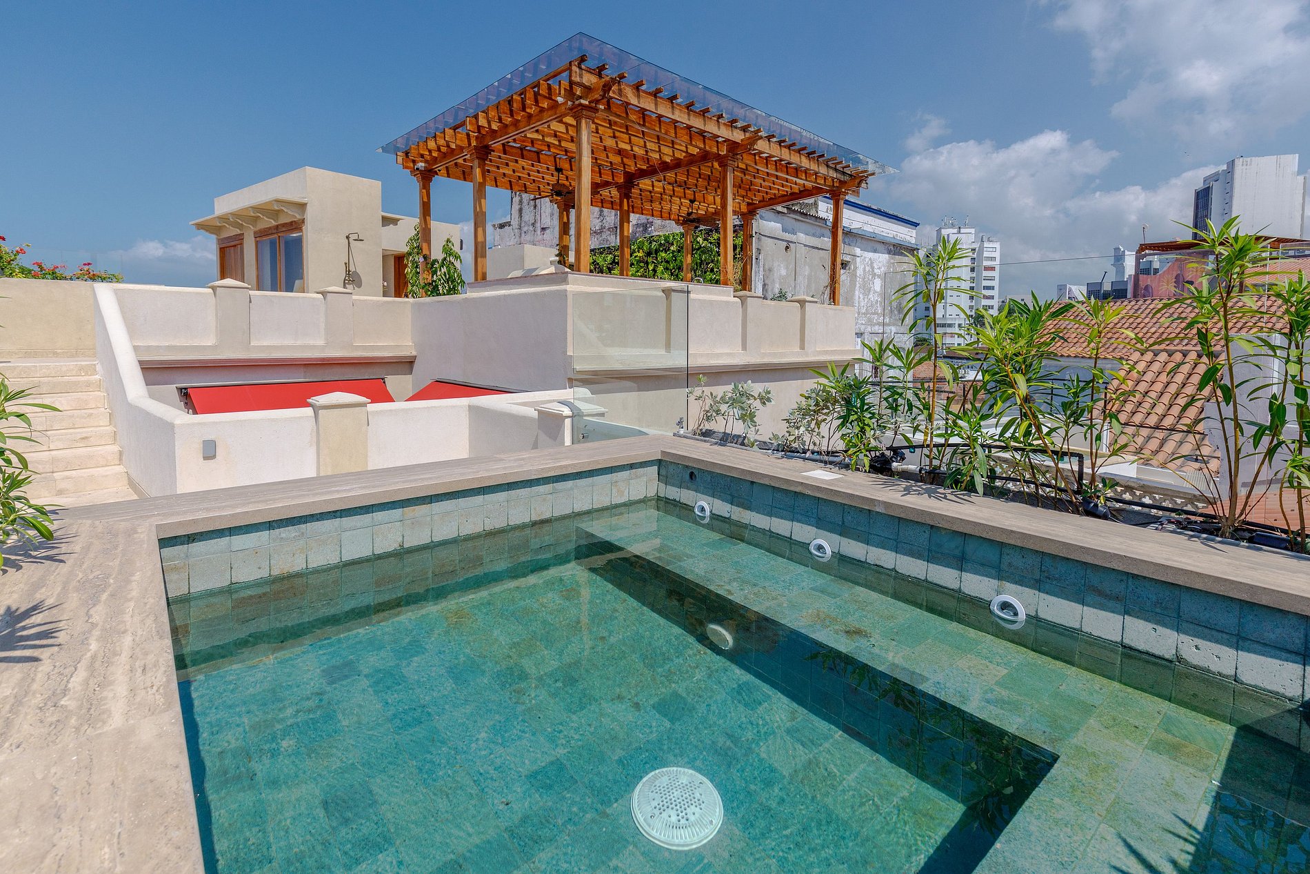 A casa se estende por vários andares, com destaque para o terraço na cobertura. Este espaço conta com uma piscina privativa com vistas deslumbrantes da cidade e da famosa catedral, cercada por vegetação exuberante. O terraço também inclui espreguiçadeiras, guarda-sóis, uma jacuzzi rodeada por plantas tropicais e uma área espaçosa para churrascos com pérgola, ideal para desfrutar de coquetéis enquanto aprecia a paisagem urbana ou o céu estrelado.