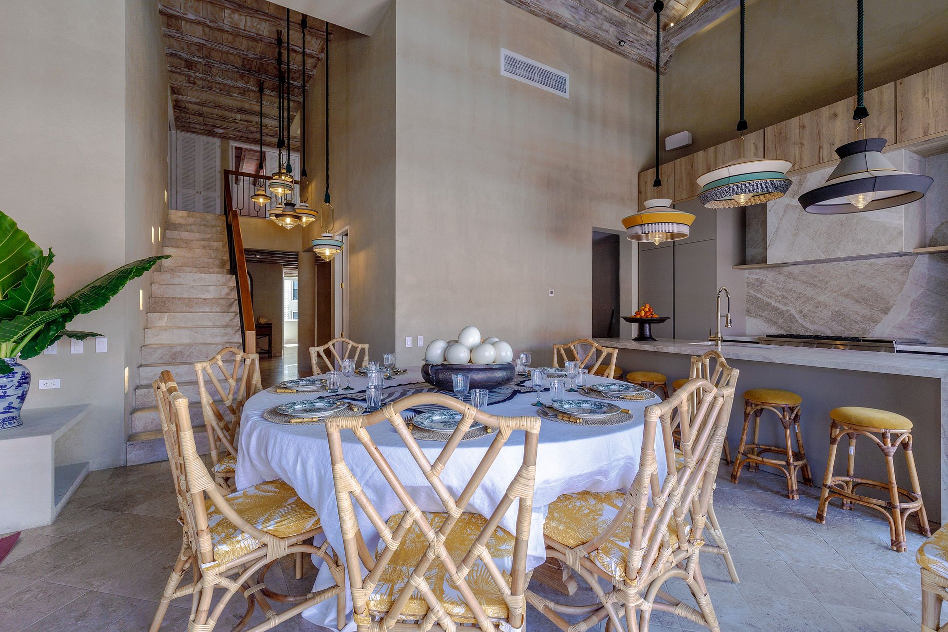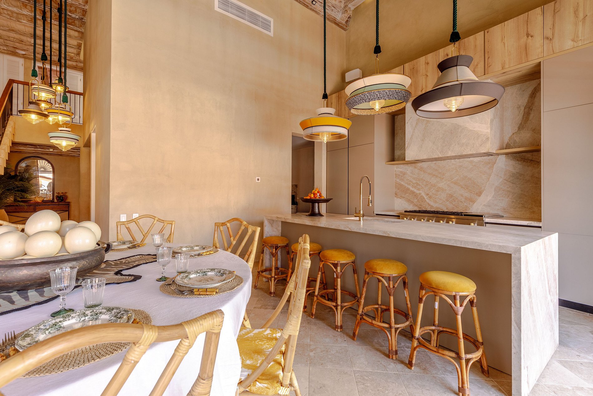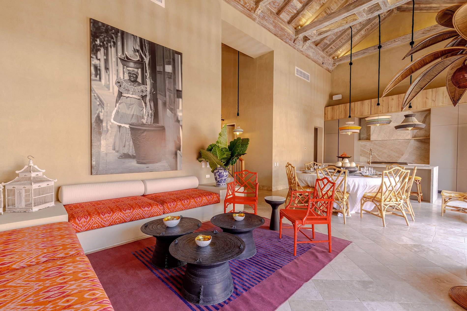 Decorada em tons quentes e terrosos, com materiais rústicos de madeira, fibras naturais e detalhes coloridos, a casa é cercada por vegetação exuberante e elementos decorativos artesanais. Os tetos altos e a combinação harmoniosa de estética colonial e modernidade fazem desta propriedade um espaço verdadeiramente único.