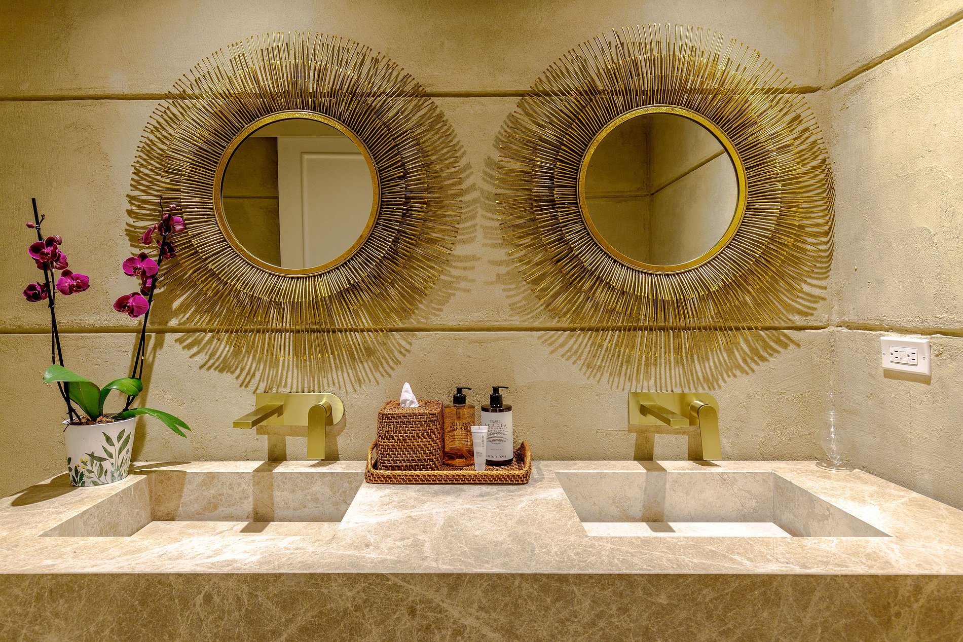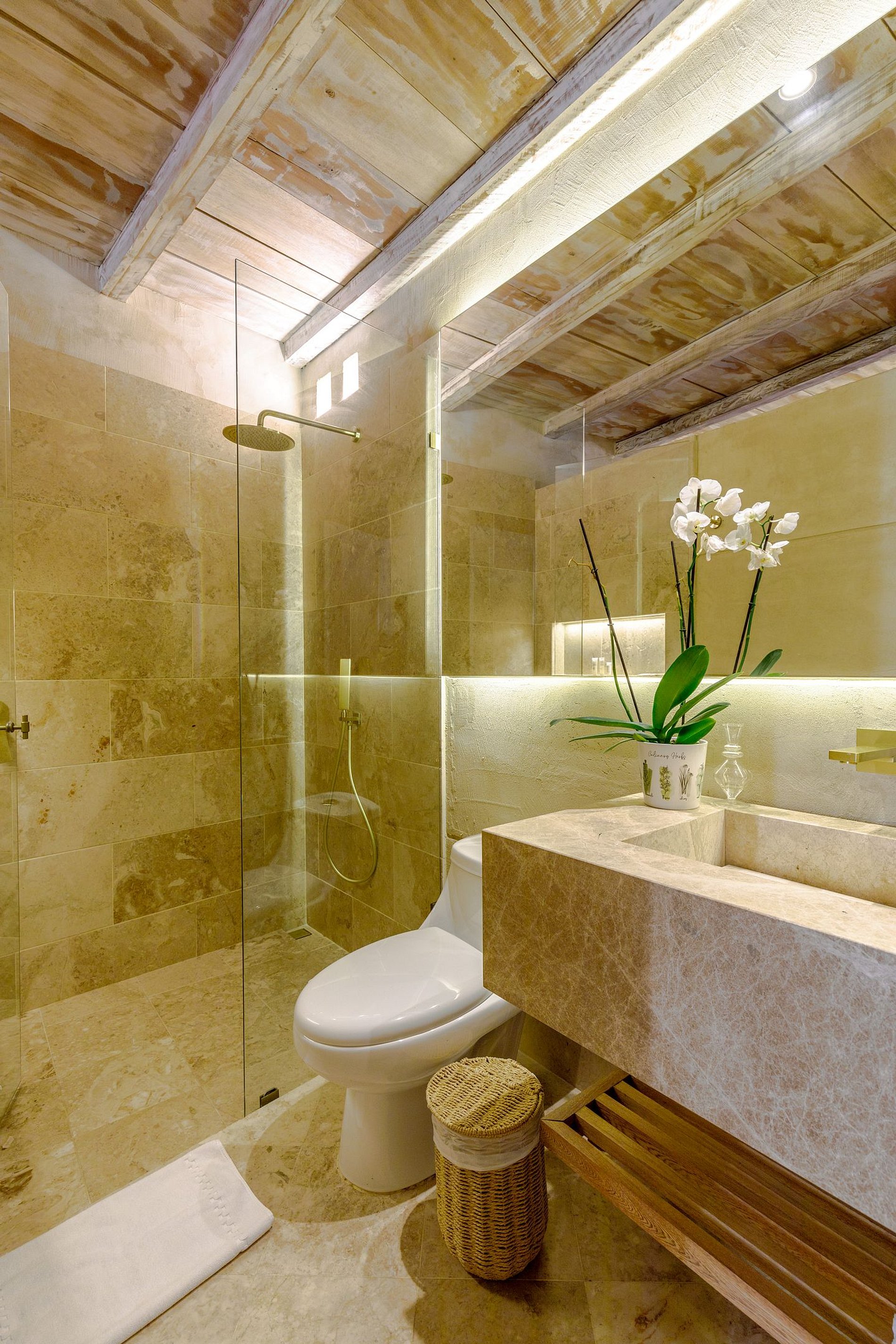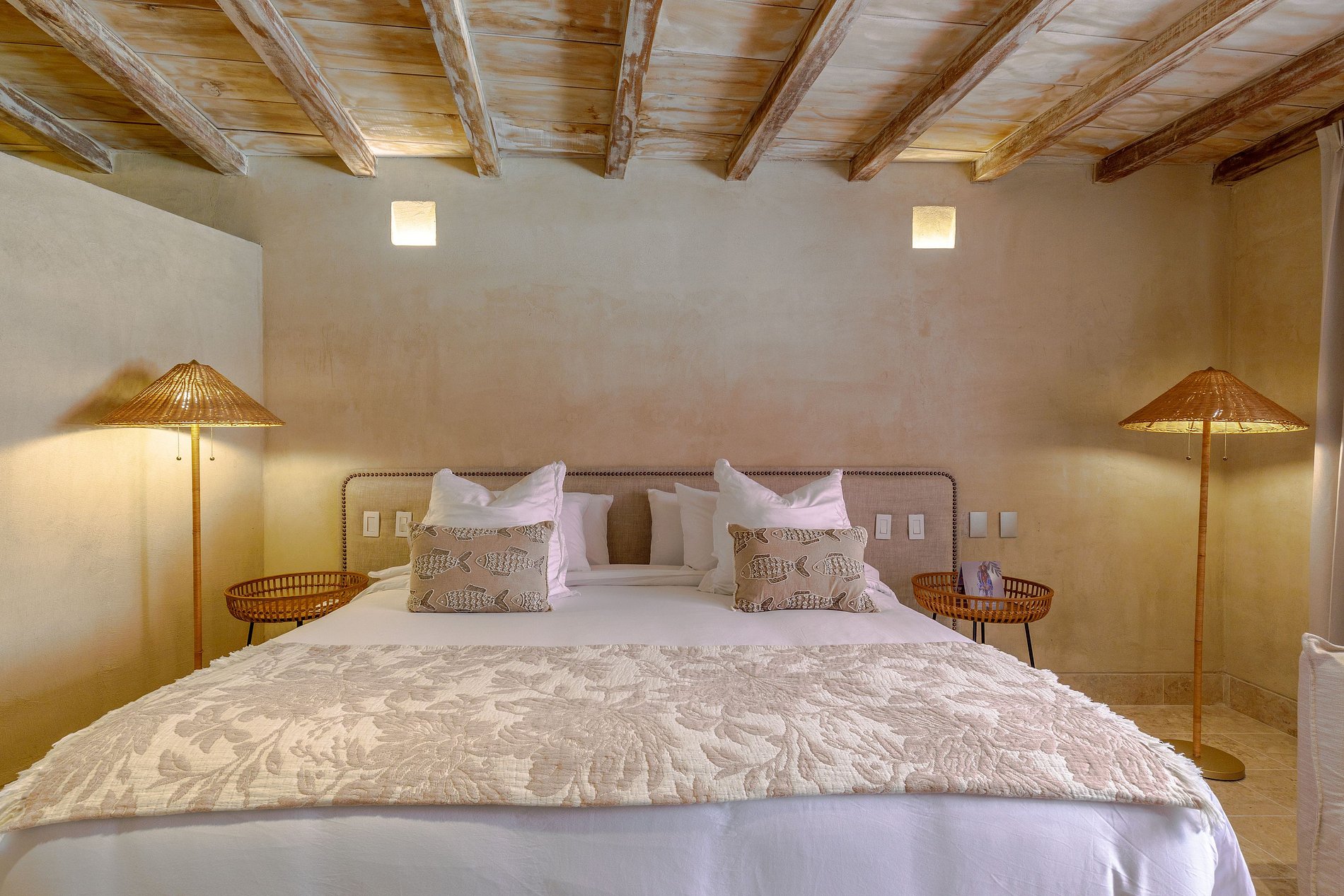 Decorada em tons quentes e terrosos, com materiais rústicos de madeira, fibras naturais e detalhes coloridos, a casa é cercada por vegetação exuberante e elementos decorativos artesanais. Os tetos altos e a combinação harmoniosa de estética colonial e modernidade fazem desta propriedade um espaço verdadeiramente único.