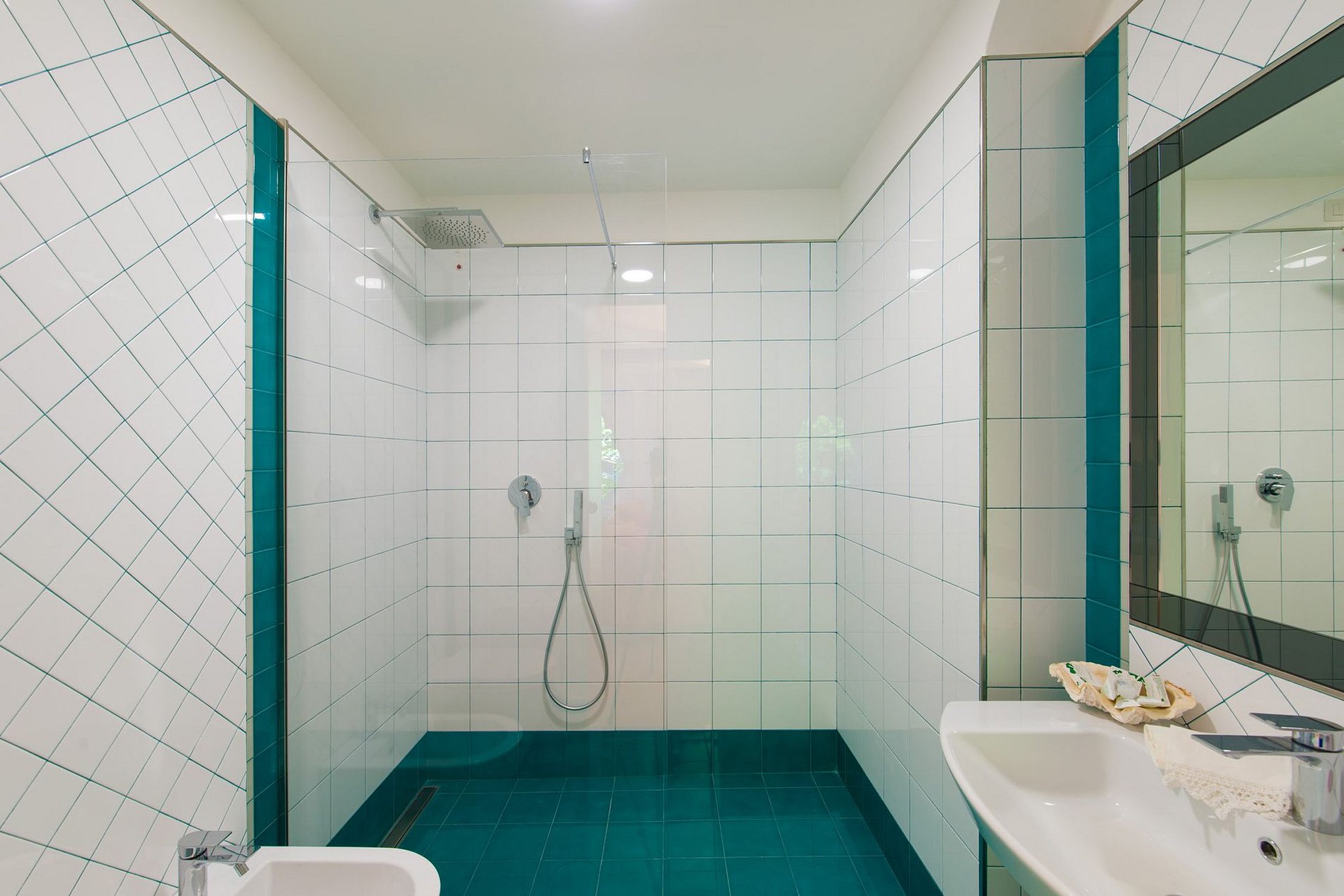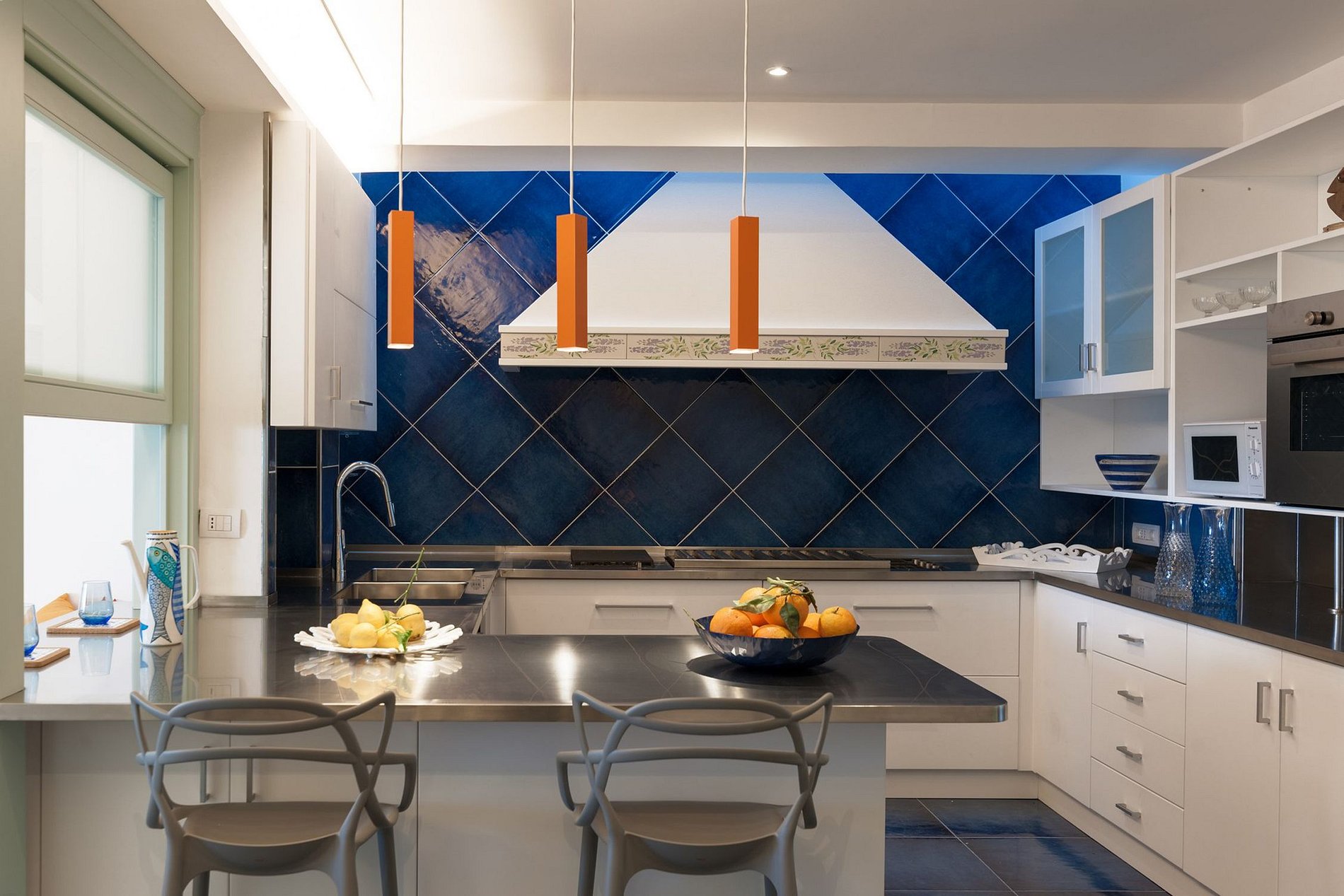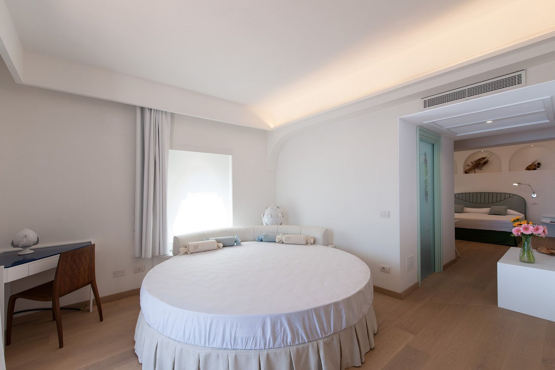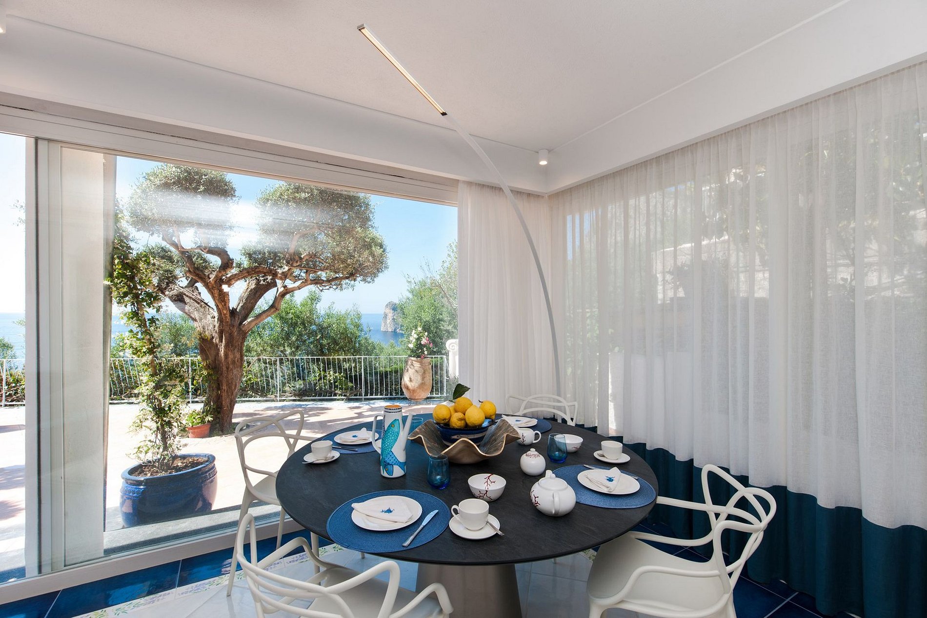 Móveis de design de marcas italianas da moda foram usados em todos os cômodos da villa; sofás são da Gervasoni, as mesas pequenas são da Knoll e Cattelan Italia. As cores azul e branco interagem por toda a vila, lembrando o céu e o mar interrompido apenas por um toque fresco de amarelo e laranja. Um sistema de iluminação cênica faz com que as cores se destaquem com brilho e força. A villa é requintada e impressiona os hóspedes com instalações excepcionais.