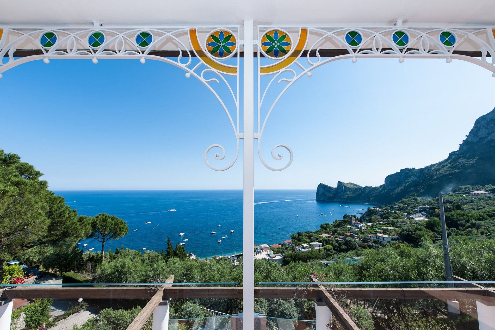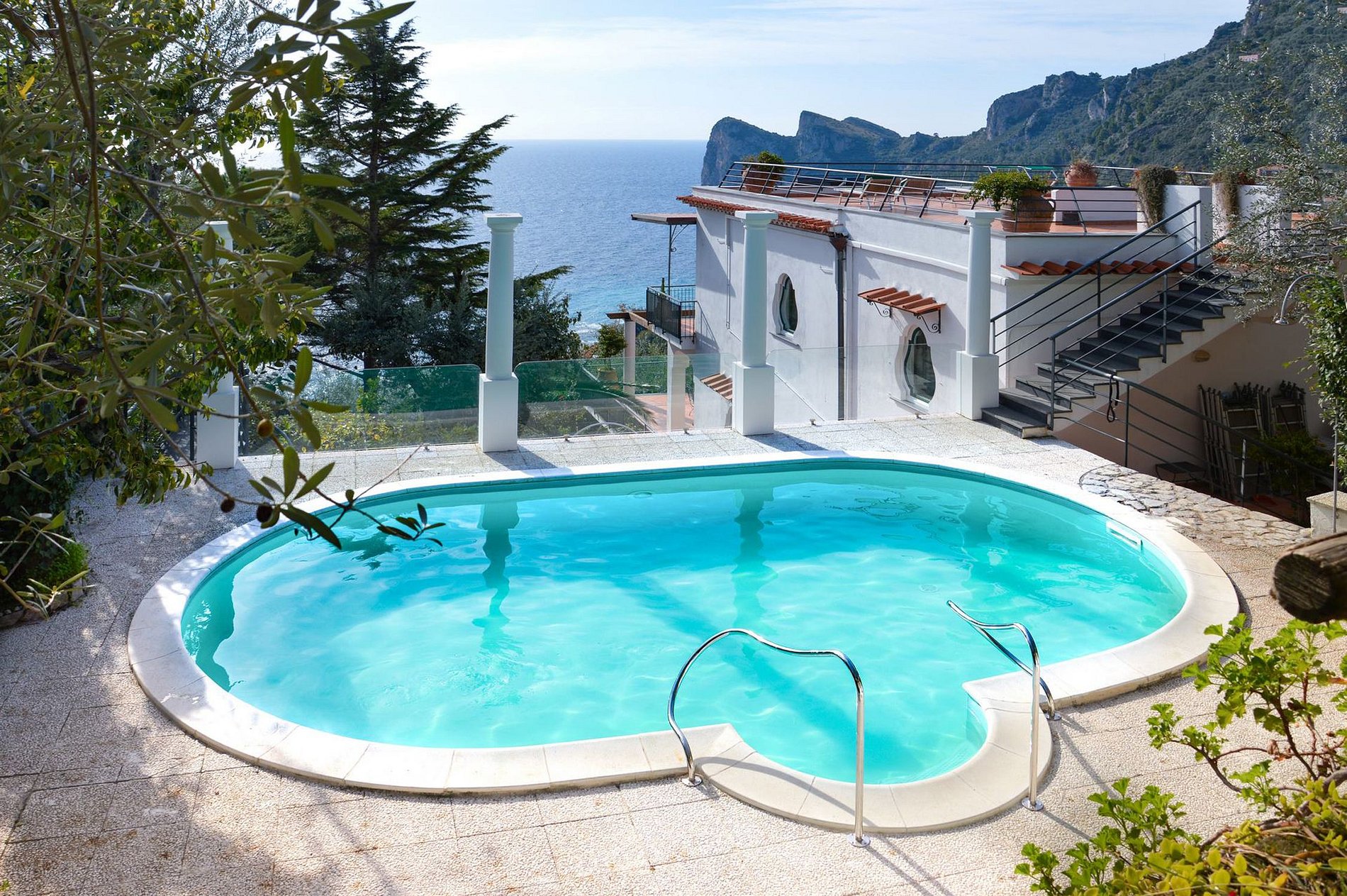 Luxuosa, moderna e luminosa villa de três andares com uma decoração minimalista, de frente para o sol e o mar, ocupando uma posição panorâmica com vista para a baía de Marina del Cantone, a apenas cinco minutos de carro da praia, através de um trilha cênica. A propriedade possui uma piscina privada e dois terraços privados panorâmicos com vista para o mar, um pátio exterior para refeições com BBQ e um forno a lenha. No primeiro e segundo andar, encontram-se cinco belos e espaçosos quartos duplos e uma suite composta por dois quartos duplos.