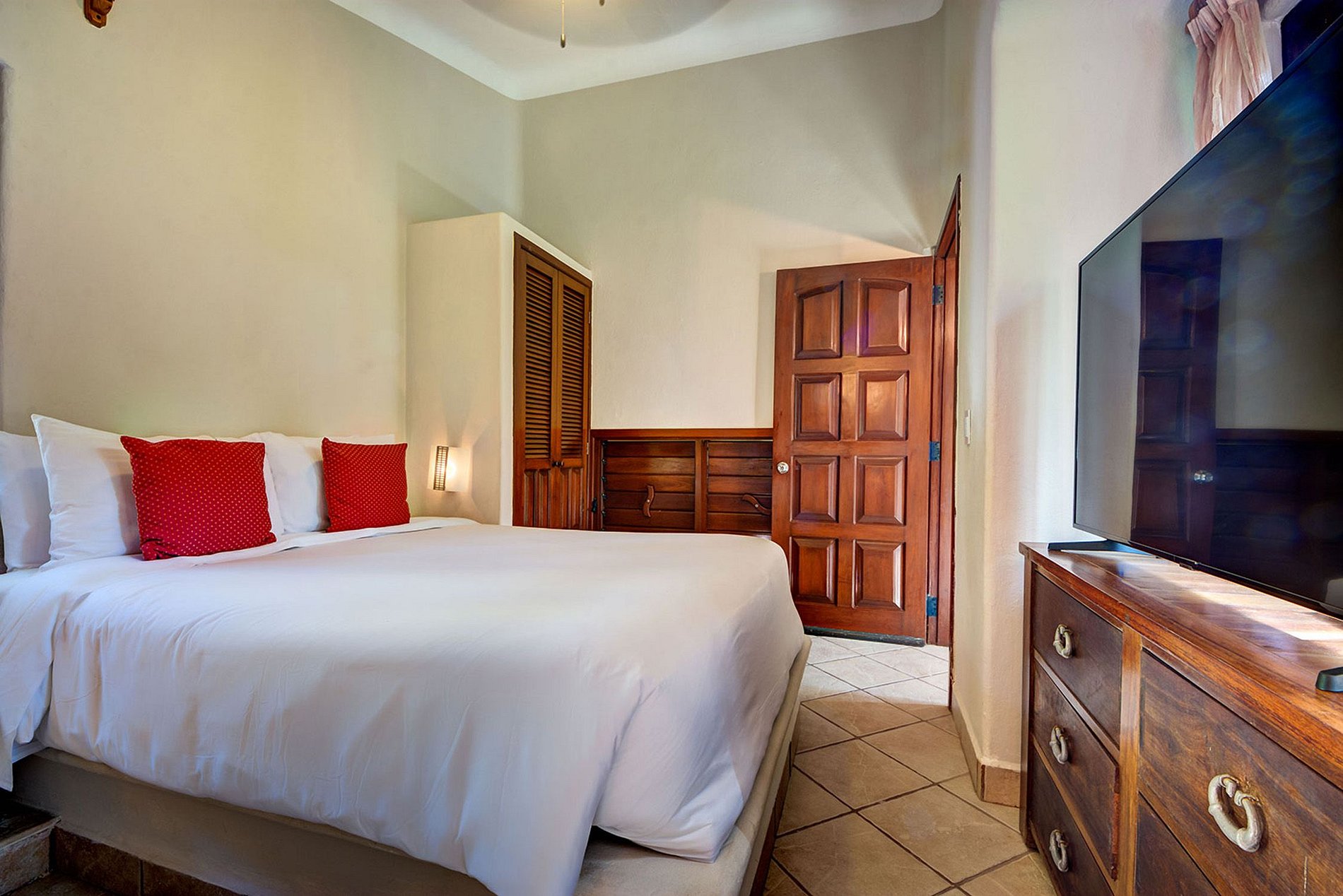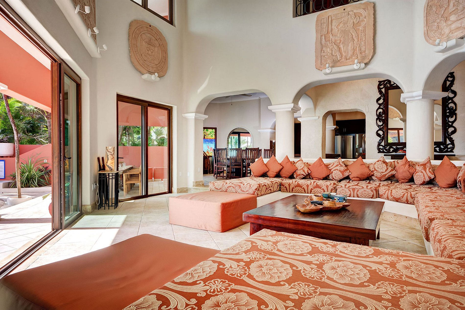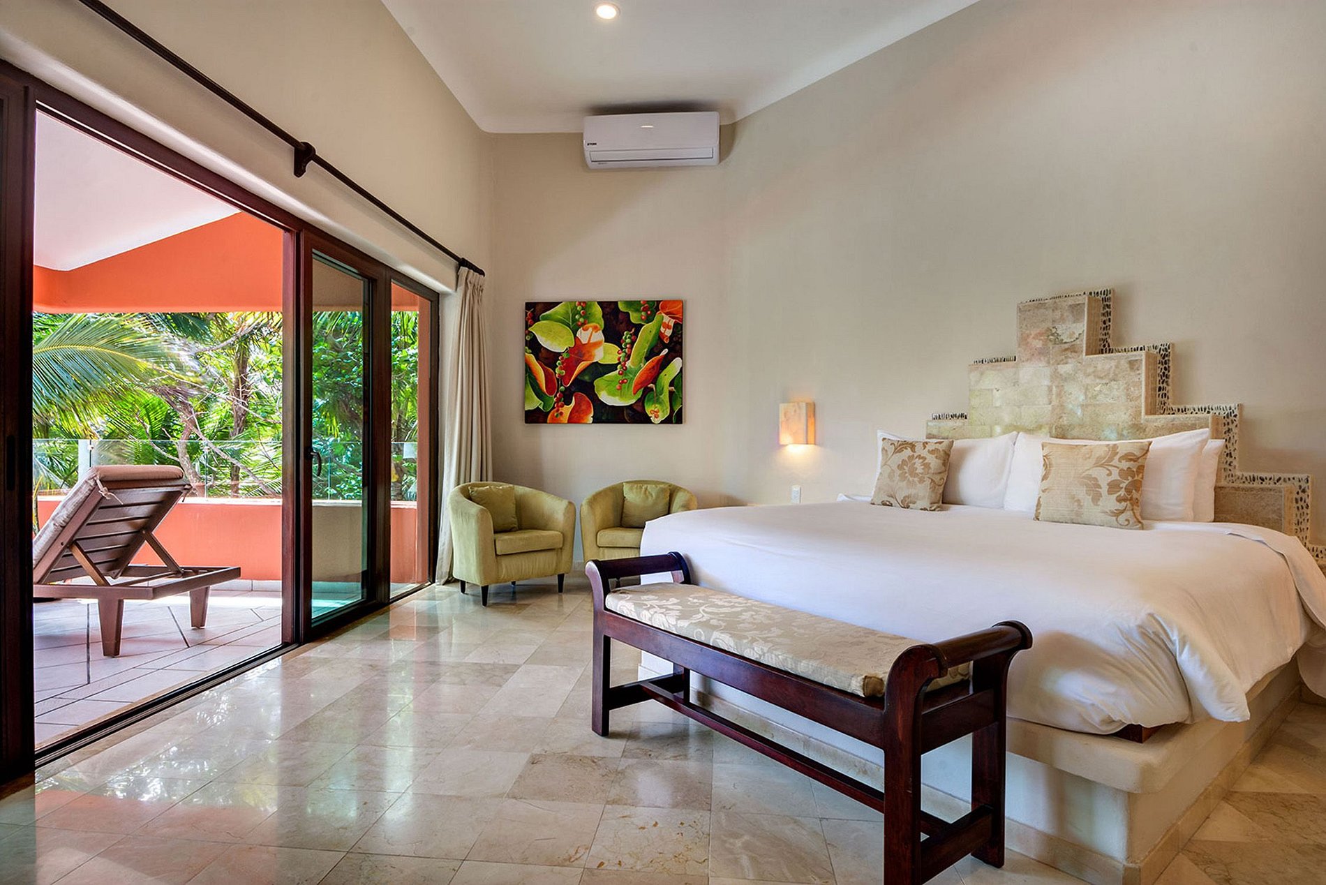 Existem cinco quartos com ar-condicionado artisticamente projetados, com tetos de quatro metros dentro da vila; 2 quartos estão equipados com 2 camas queen-size, dois quartos estão equipados com 1 cama king-size e 1 quarto está equipado com 1 cama queen-size. Existem também 4 encantadoras pousadas localizadas fora; 2 das pensões estão equipadas com 2 camas king-size e as outras 2 pensões possuem 1 cama king-size. Cada um dos 9 quartos está equipado com ventiladores de teto, TV via satélite, DVD player e cofre. Esta magnífica decoração da casa foi inspirada na arquitetura e artesanato mexicanos. Cada quarto tem seu banheiro privativo de luxo em mármore e o banheiro principal possui uma banheira de hidromassagem com uma vista incrível do Caribe.