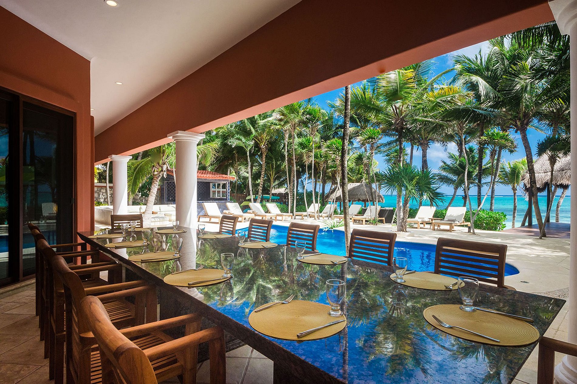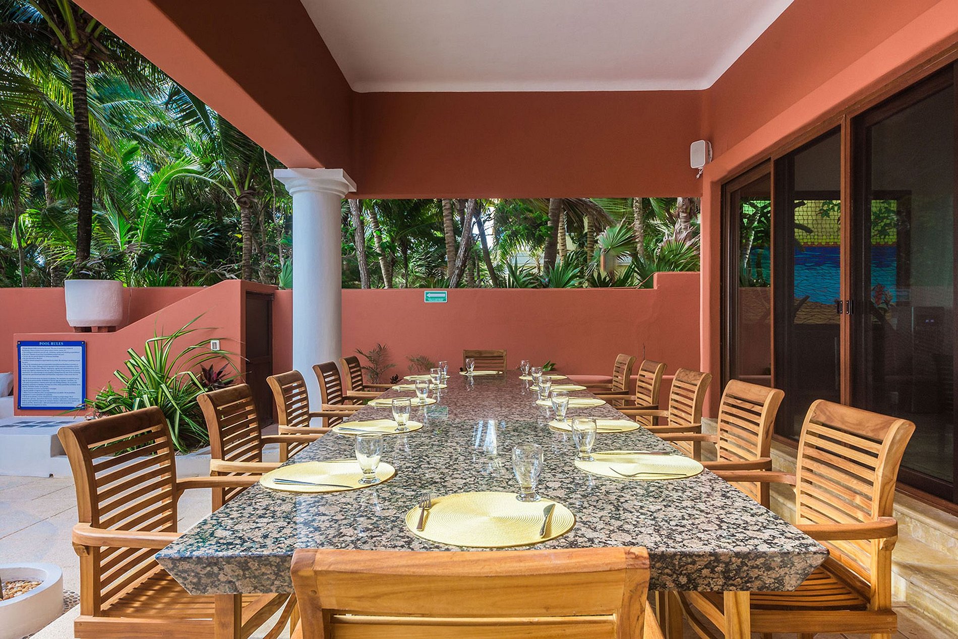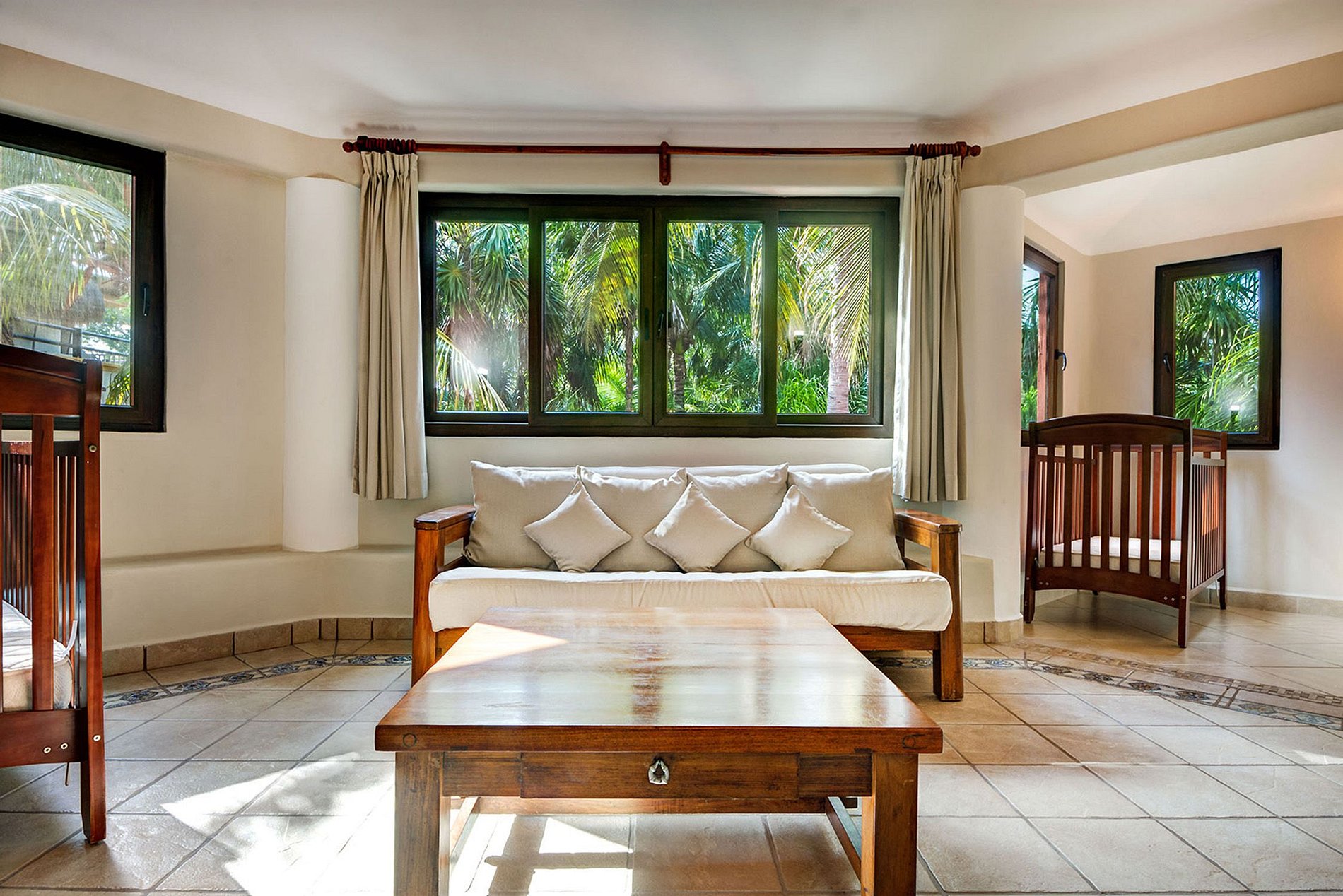 Sua espaçosa sala de estar oferece um teto de 10 metros, uma impressionante espreguiçadeira em meio círculo que pode acomodar seus hóspedes confortavelmente com uma vista espetacular da piscina e da praia, ideal para relaxar e divertir. A área da piscina também é equipada com um chuveiro externo para seu conforto. Acesso gratuito à Internet está disponível, o que o torna ideal para turistas modernos. Nosso gerente também fornece assistência pessoal, que inclui o planejamento de viagens de um dia e a reserva de massagens maias autênticas no conforto da sua casa de férias dos sonhos. A casa possui cinco cuidadores em tempo integral e também está incluído um serviço de segurança, através de uma empresa que fornece à sua casa de férias um guarda noturno.