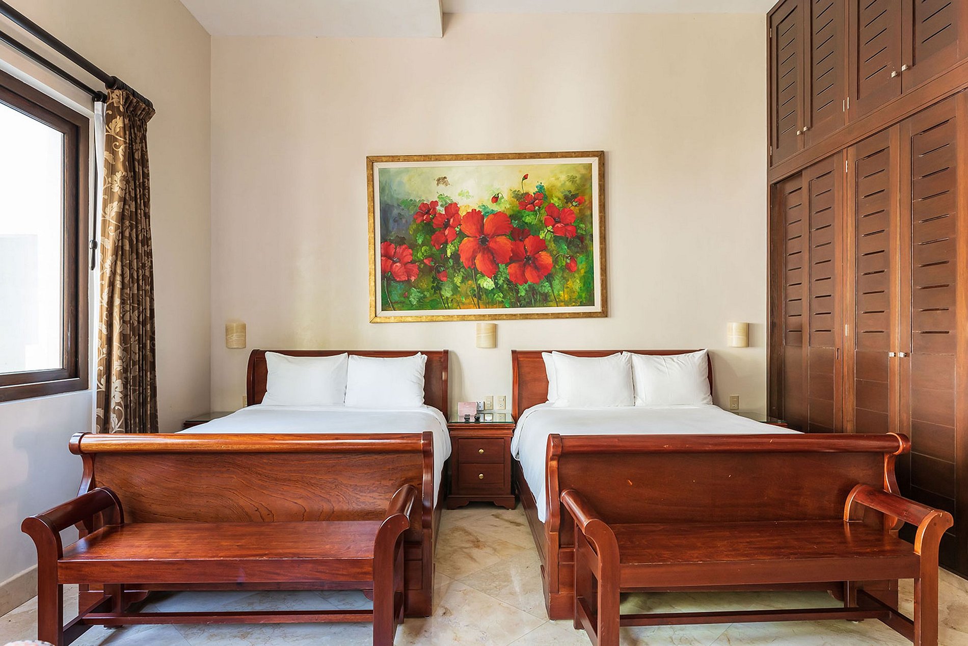 2 camas Queen, ar-condicionado, ventilador de teto, banheiro privativo com chuveiro, TV de tela plana, secador de cabelo, cofre, TV via satélite, tela de janela