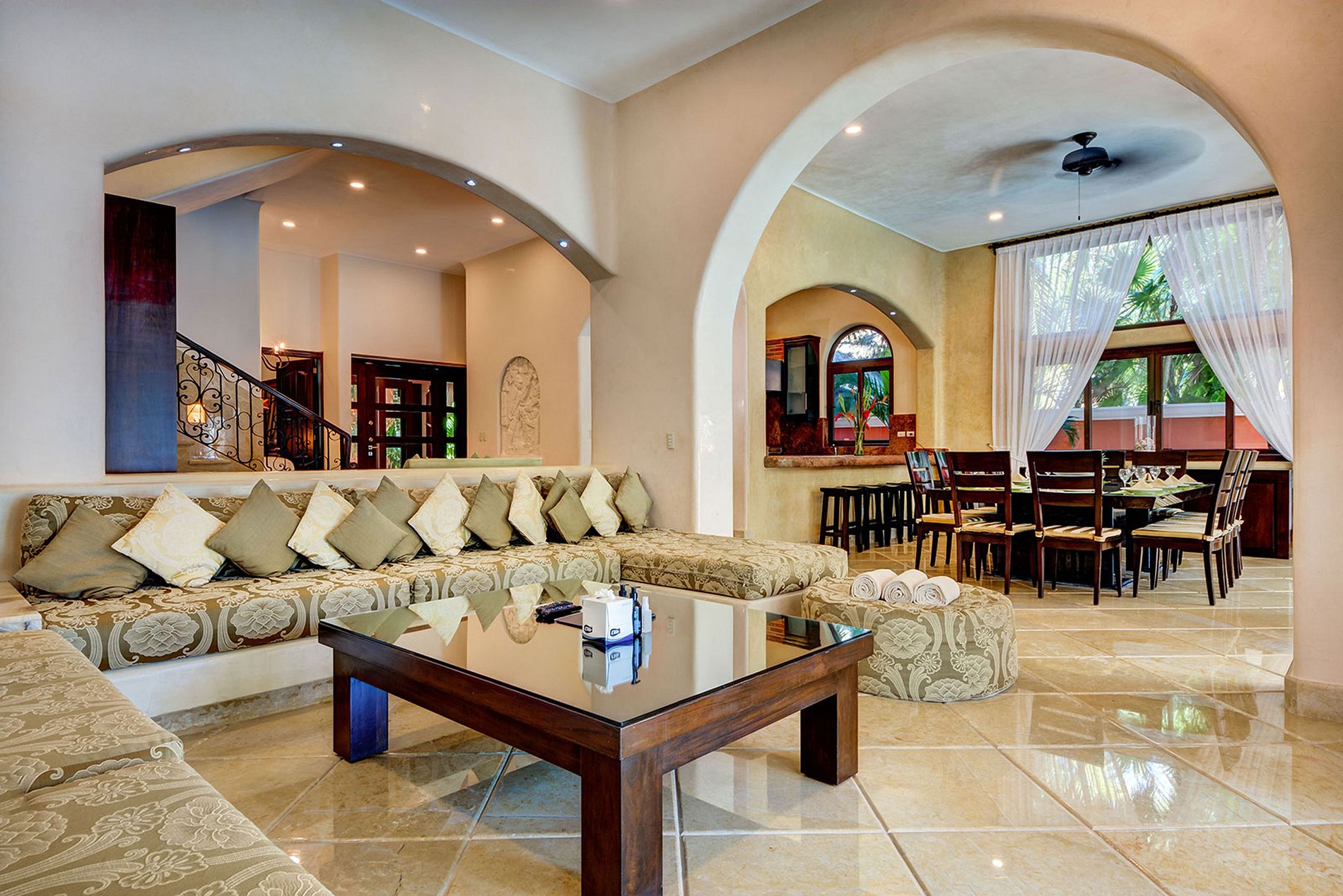 Ao entrar na vila, os hóspedes verão o primeiro quarto à direita e logo à esquerda é a cozinha totalmente equipada. Em frente é a sala de jantar e sala de estar; através das portas de vidro é a piscina e vistas magníficas para o mar.