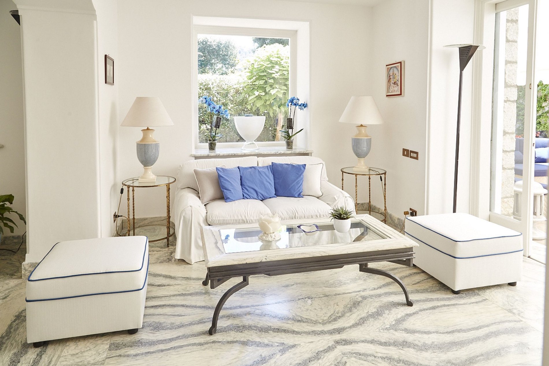 Esta villa de 3 andares é composta por 5 quartos e 5 banheiros e meio, com 2 quartos duplos no primeiro andar e 3 no segundo, e pode acomodar até 10 pessoas. A entrada na villa é feita por um pequeno saguão, que leva a uma grande sala de estar dupla e à sala de jantar com mesa de vidro para 8 pessoas. Há também uma área para refeições externa coberta com uma longa mesa de cerâmica para 10 pessoas. situado ao lado de um forno de pizza a lenha e uma pintura em cerâmica de Capri como pano de fundo.