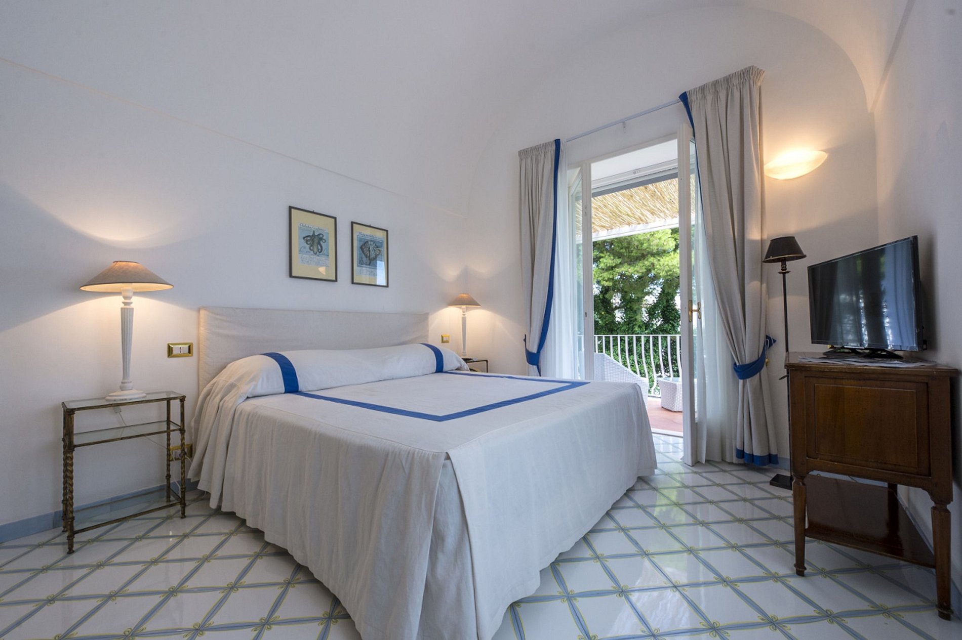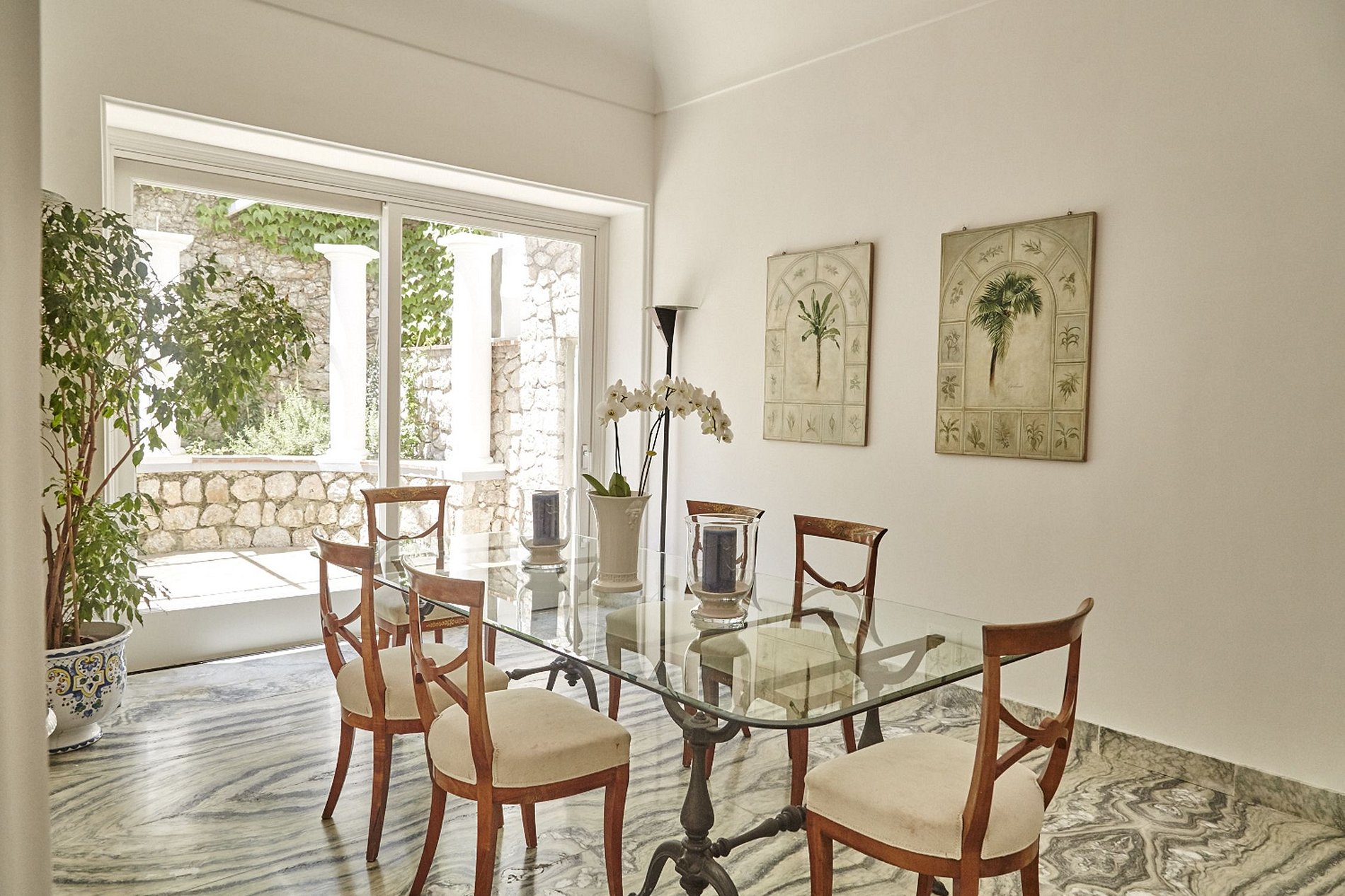 Esta villa de 3 andares é composta por 5 quartos e 5 banheiros e meio, com 2 quartos duplos no primeiro andar e 3 no segundo, e pode acomodar até 10 pessoas. A entrada na villa é feita por um pequeno saguão, que leva a uma grande sala de estar dupla e à sala de jantar com mesa de vidro para 8 pessoas. Há também uma área para refeições externa coberta com uma longa mesa de cerâmica para 10 pessoas. situado ao lado de um forno de pizza a lenha e uma pintura em cerâmica de Capri como pano de fundo.