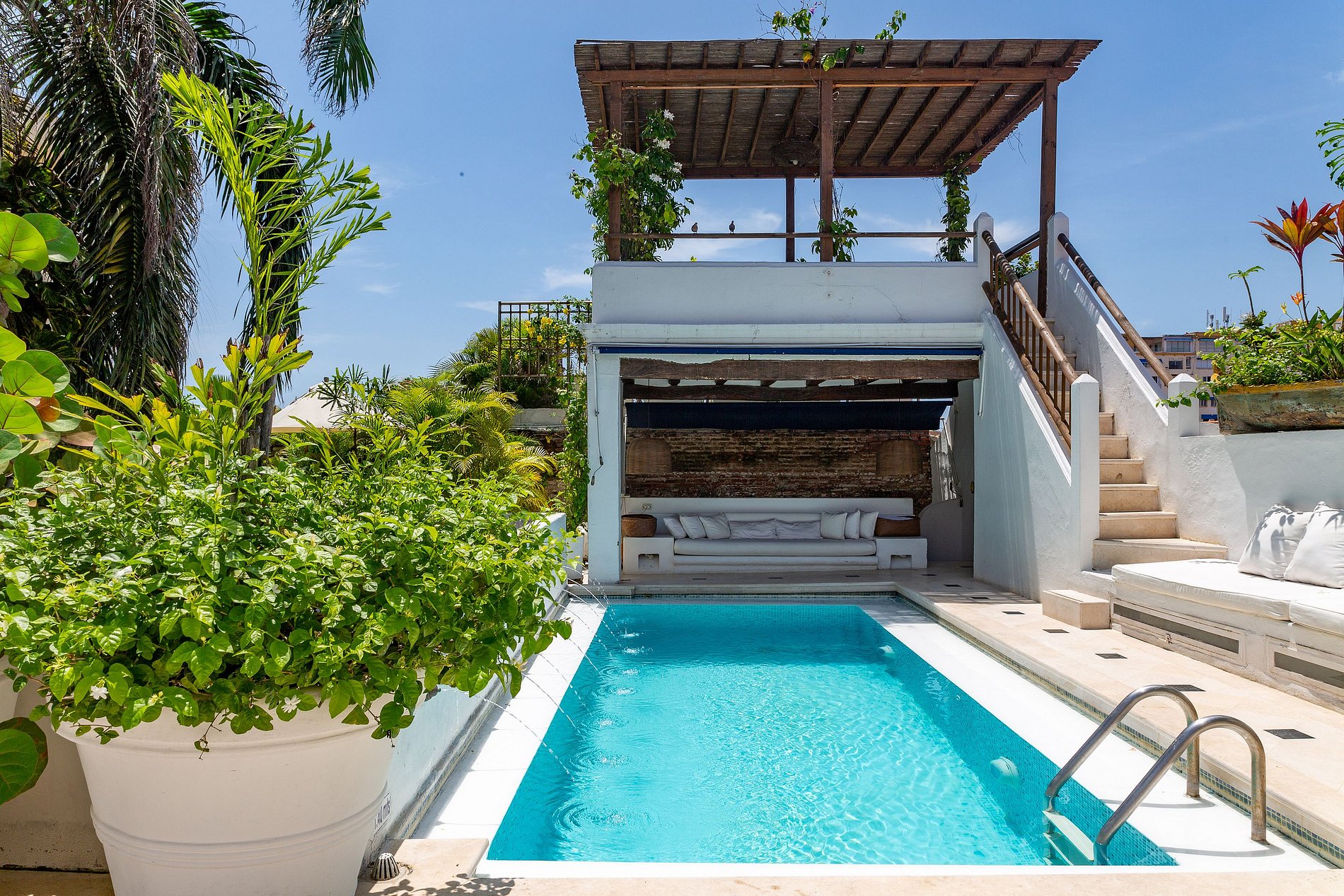 O segundo andar abriga seis quartos espaçosos e decorados de maneira única, incluindo uma suíte duplex que acomoda até quatro hóspedes. Cada quarto é projetado com estilo e conforto, oferecendo roupa de cama de algodão de luxo, toppers de colchão de plumas, ar condicionado, TV via satélite de 43′, cofre, artigos de toalete de luxo, robes de seda e secador de cabelo. Alguns quartos possuem varandas com vistas encantadoras das coloridas ruas de Cartagena ou do sereno jardim interno. O café da manhã está incluído.