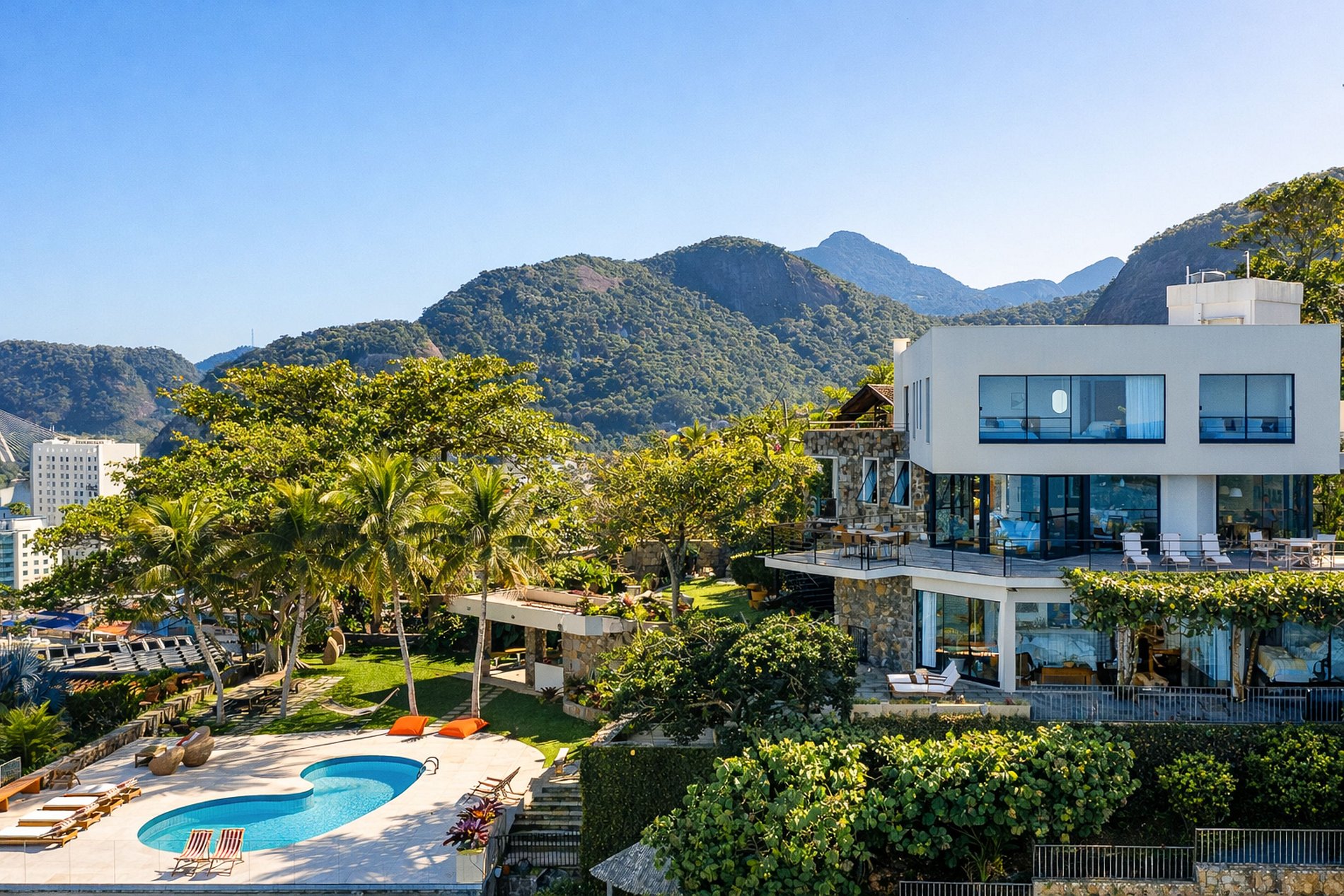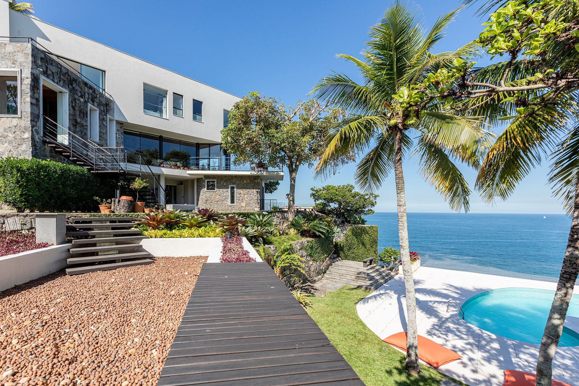 Esta casa cinematográfica fica em uma das regiões mais bonitas do Rio de Janeiro, na Ponta da Joatinga. Suas áreas internas e externas impressionam pela vista panorâmica que oferecem para o oceano e para a cidade.