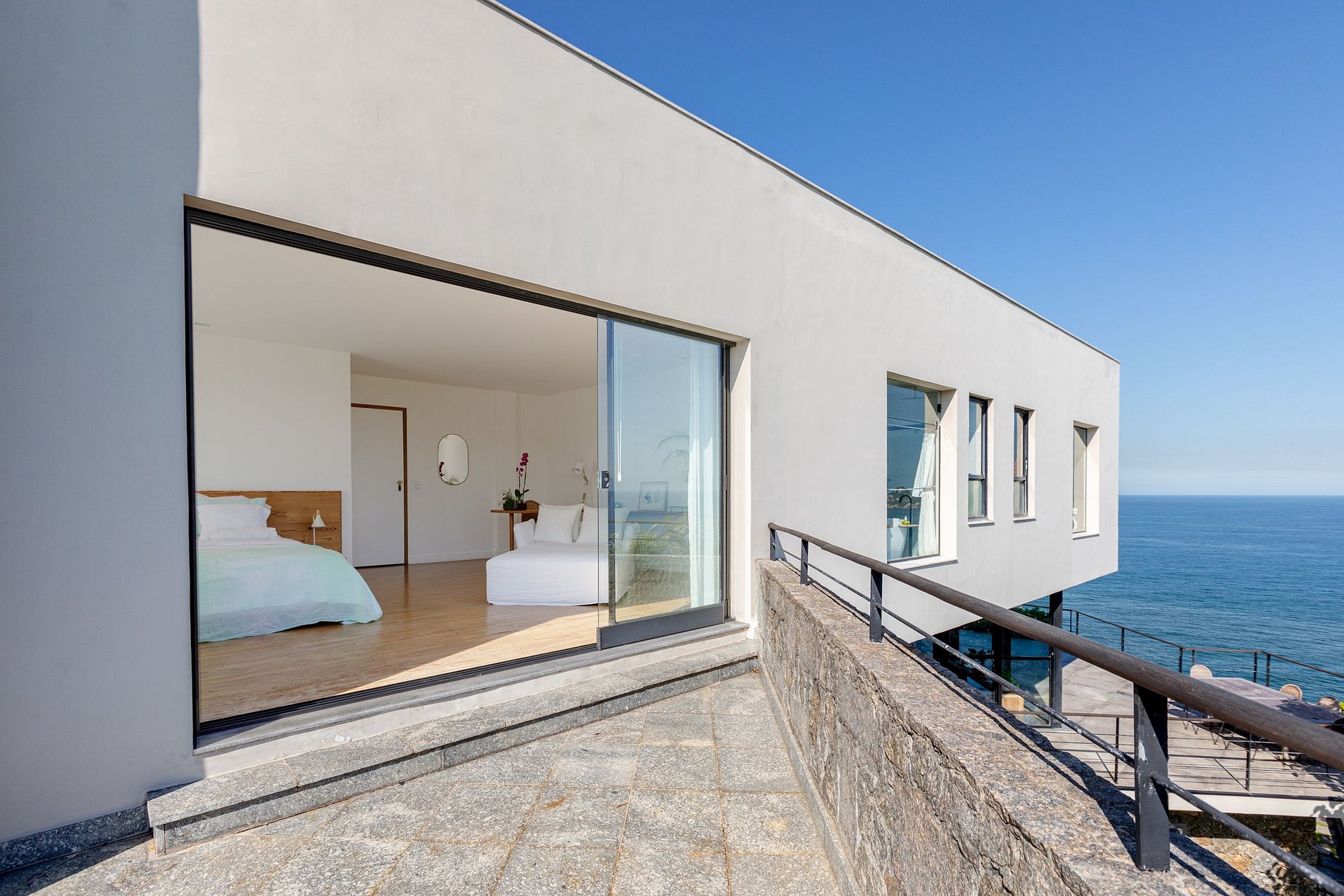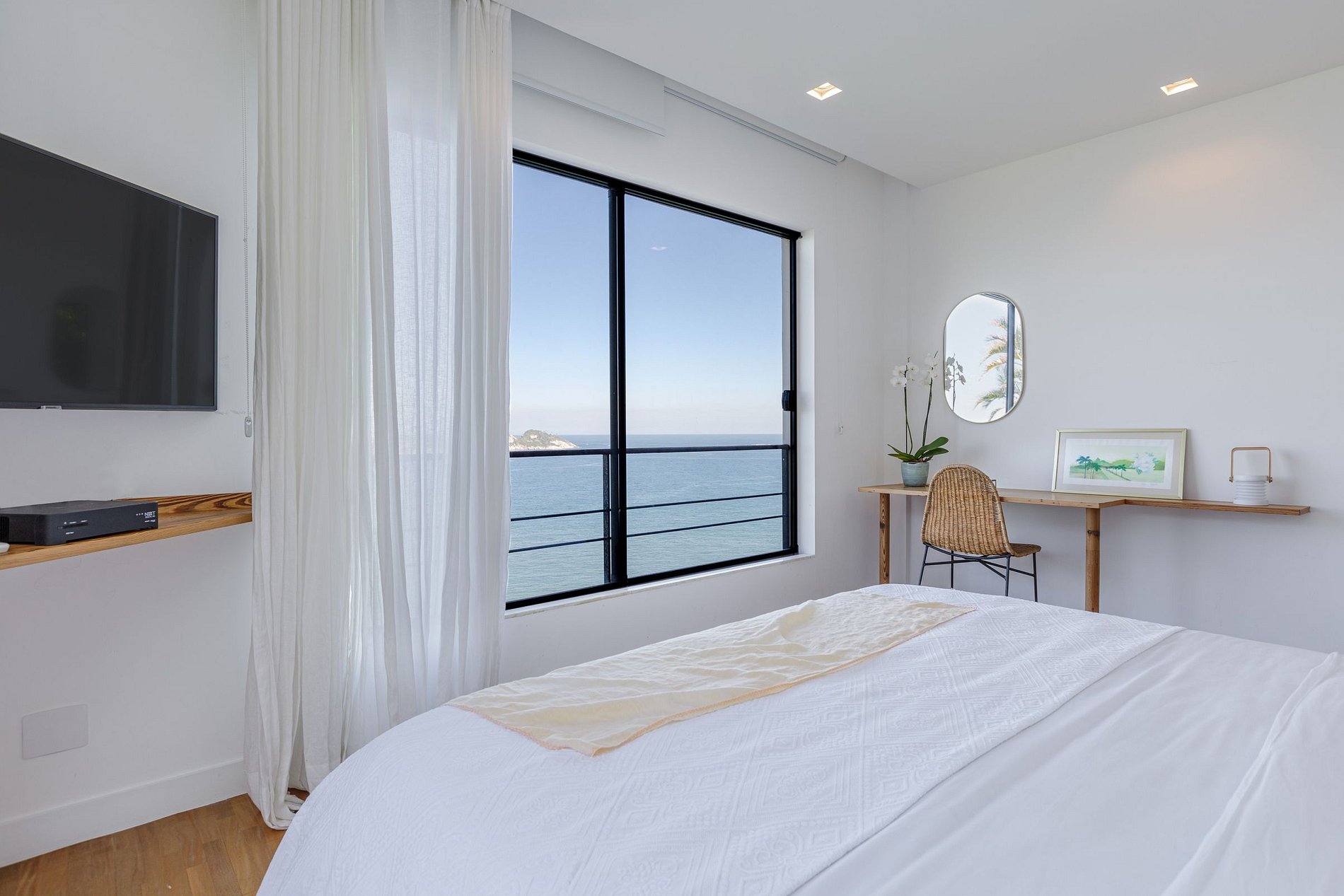 A suíte principal possui uma sofisticada banheira, onde você poderá desfrutar de um banho relaxante com vista para o mar, exatamente onde o sol se põe. Os demais quartos também mantêm o seu charme. A suíte familiar possui uma pequena varanda com amplas portas e janelas de vidro, oferecendo vista para a praia de diferentes ângulos. A terceira suíte, assim como as outras, possui tudo para o conforto dos seus convidados: decoração de extremo bom gosto, ambiente iluminado e aconchegante com TV, ar condicionado e escrivaninha.