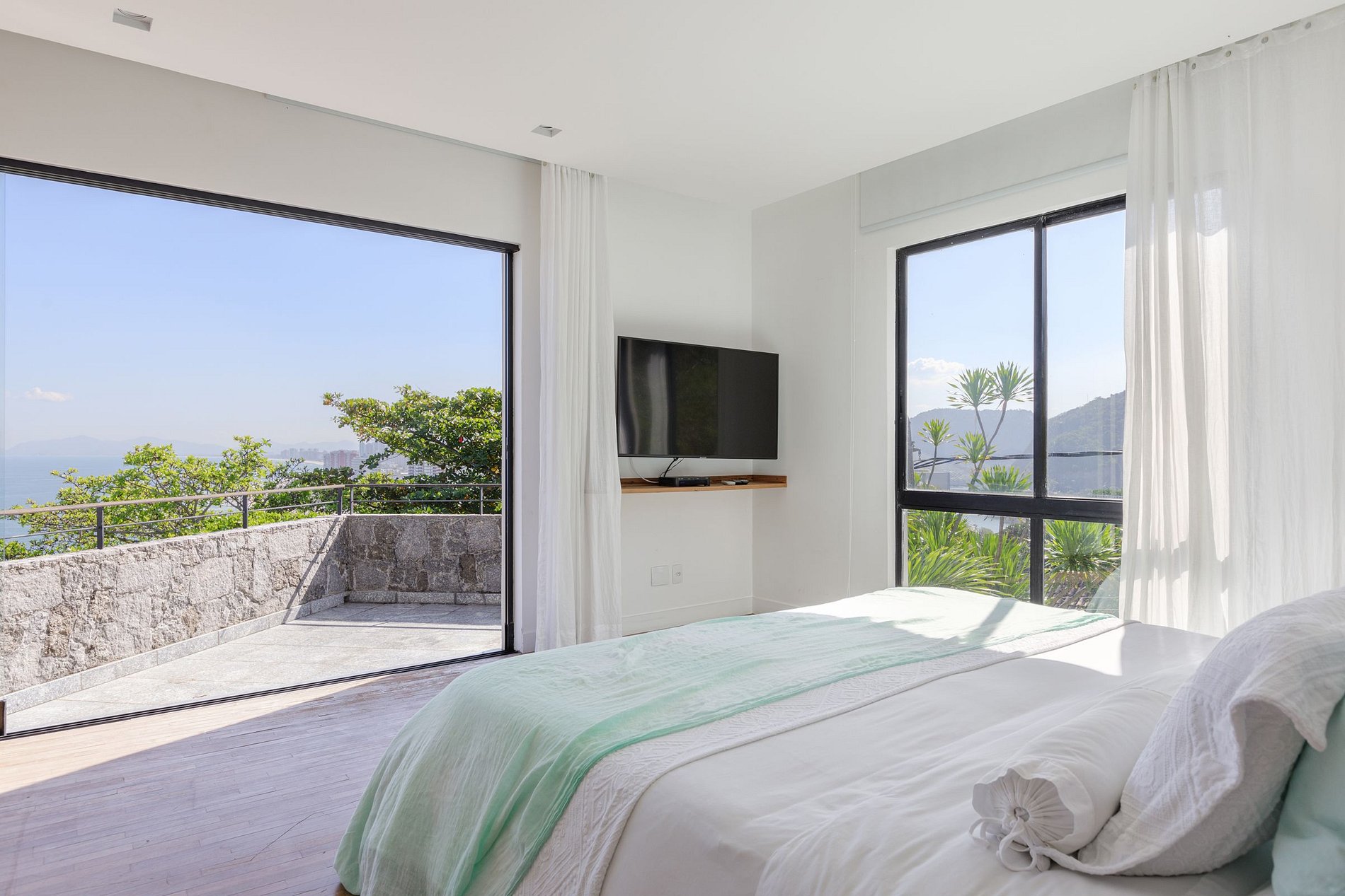 Durante o dia, o barulho do mar é o único som que ocupa o ambiente. Além da luz do sol que invade todos os cômodos da propriedade. Durante a noite, as luzes dos prédios compõem o cenário dentro e fora da casa.