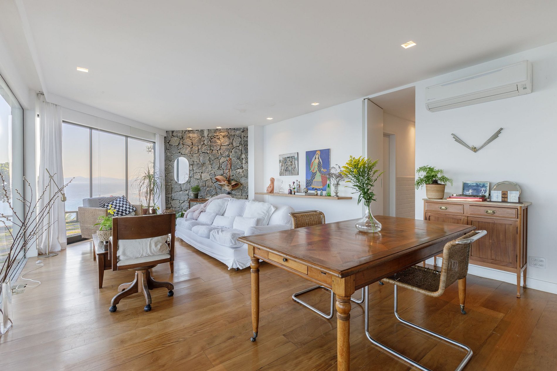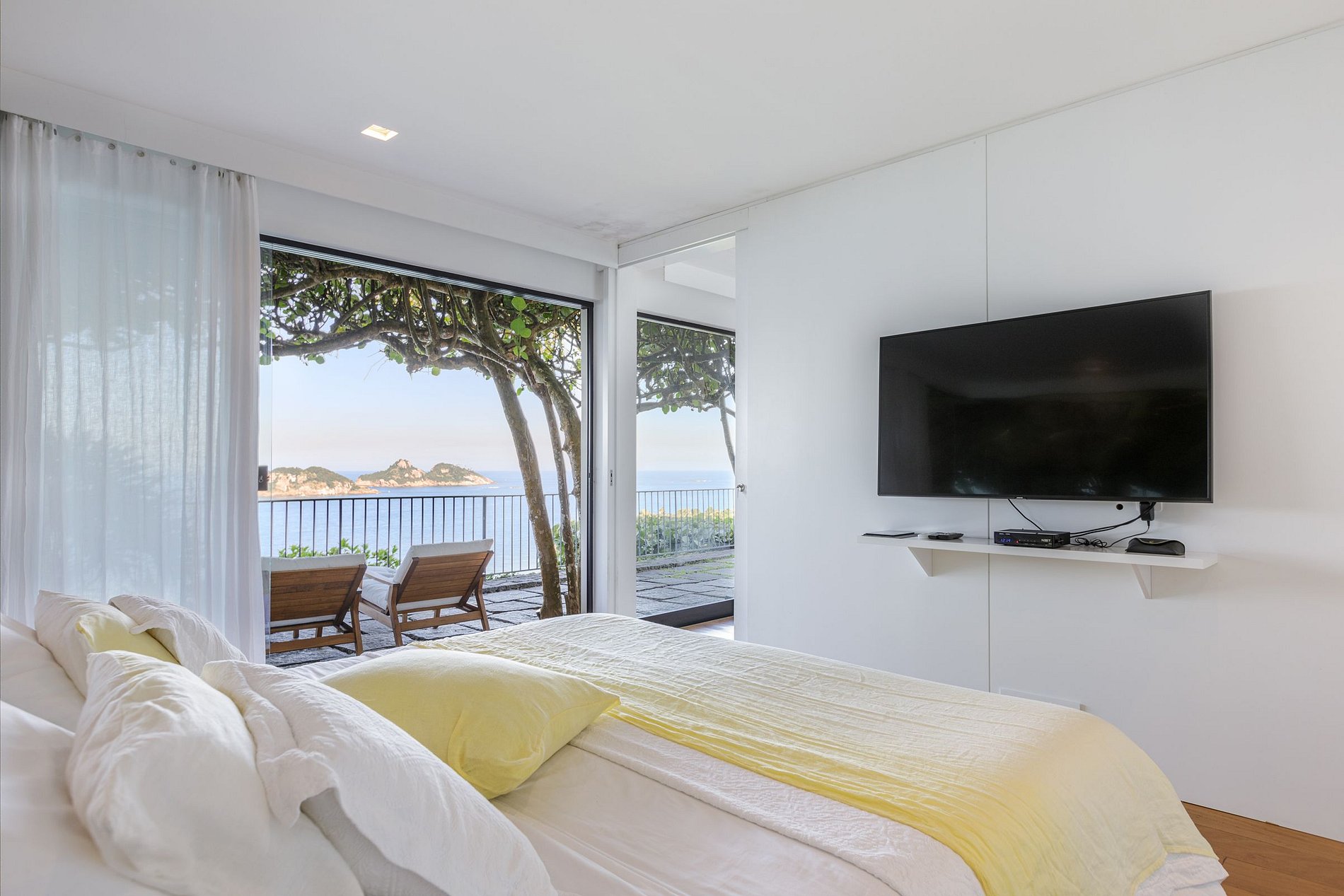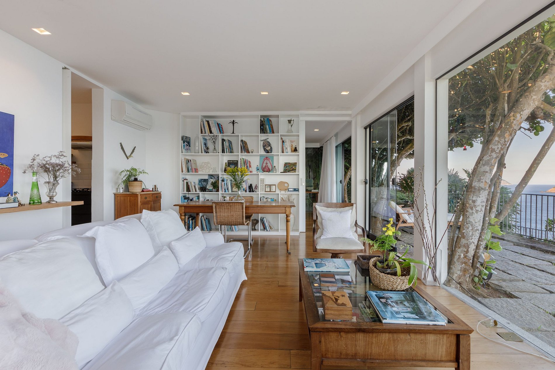 A sala de estar, com seus 70m², é o ponto alto desta propriedade. De um lado, paredes de vidro para vislumbre da vista privilegiada. De outro, paredes em madeira e rocha, tornando o ambiente aconchegante. Bromélias, orquídeas e o verde da vegetação local estão por toda parte. Assim como o azul do mar e o colorido do céu a cada fim de tarde. Em frente a sala, uma arejada varanda com espreguiçadeiras e um espaço lounge te esperam. Da varanda, o bônus é a vista da arquitetura arrojada e contemporânea que marca o estilo da fachada da casa.