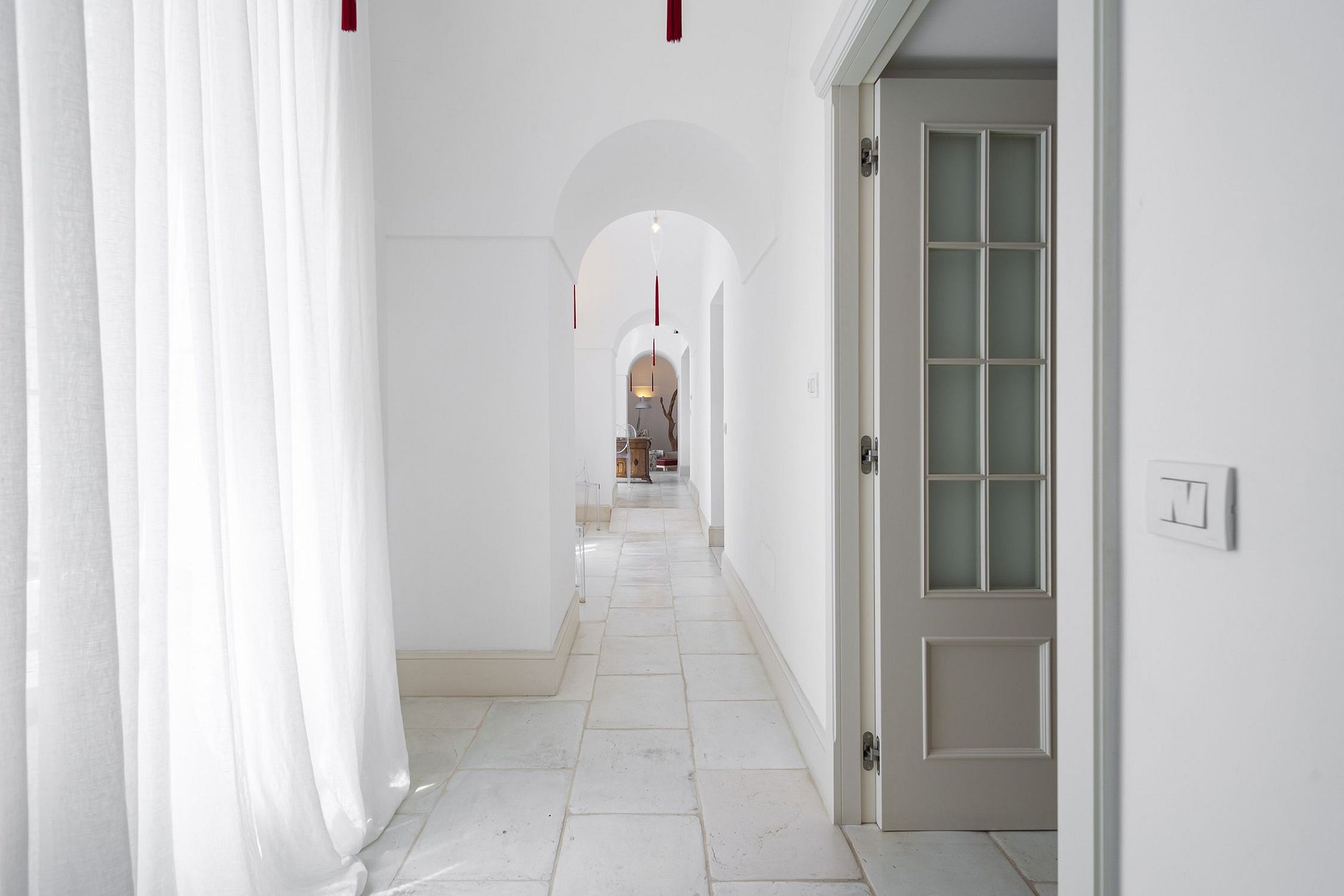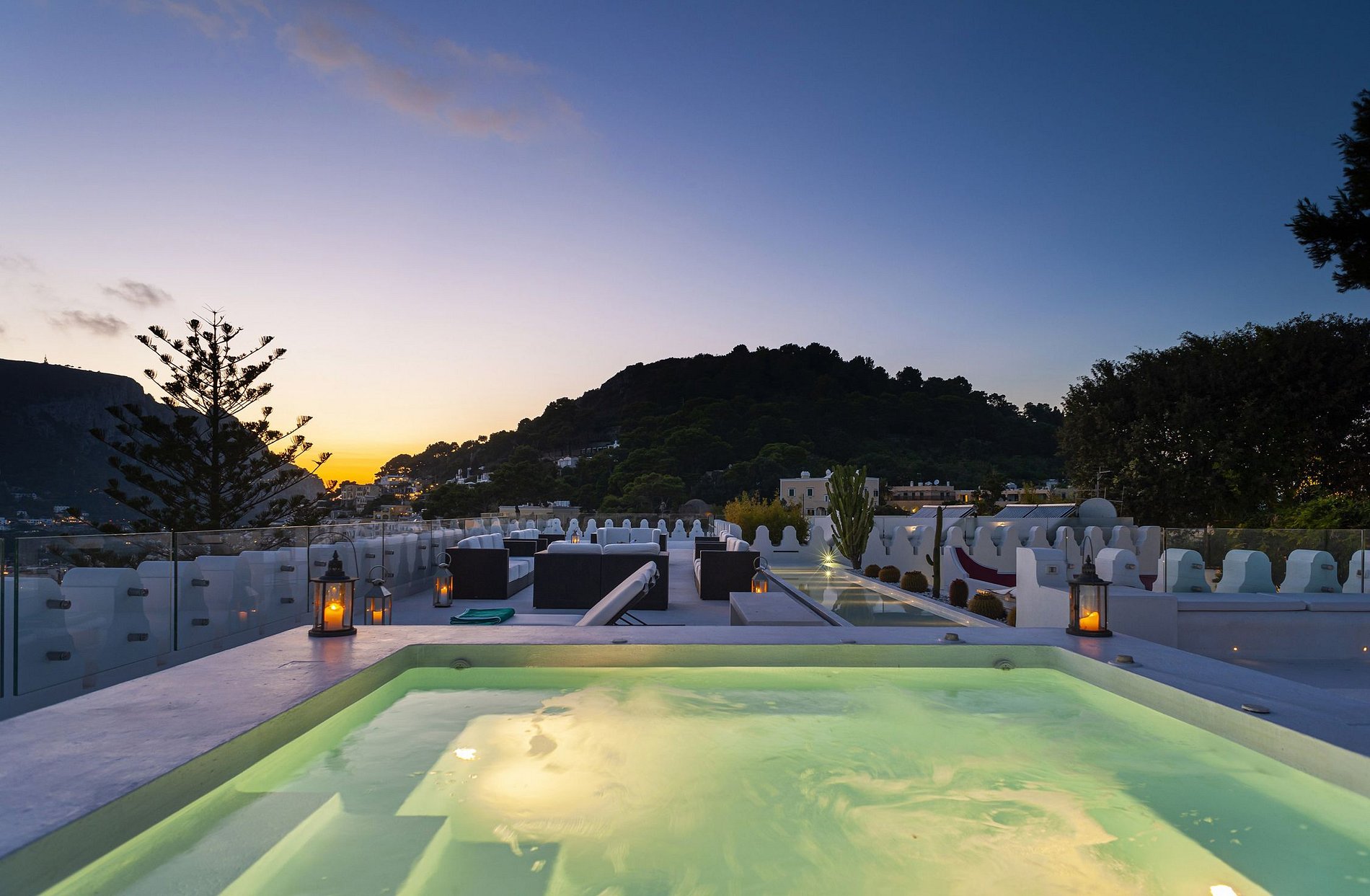 No exterior existem 7 espreguiçadeiras com almofadas premium e toalhas de piscina. Do terraço da piscina, uma colunata tradicional de Capri tem vista para o centro da cidade de Capri, oferecendo um vislumbre do Monte Solaro. Palmeiras em vasos pequenos alinham o belo terraço pavimentado.