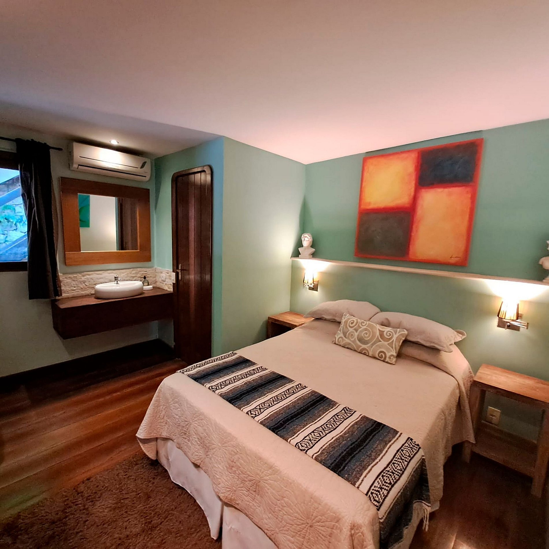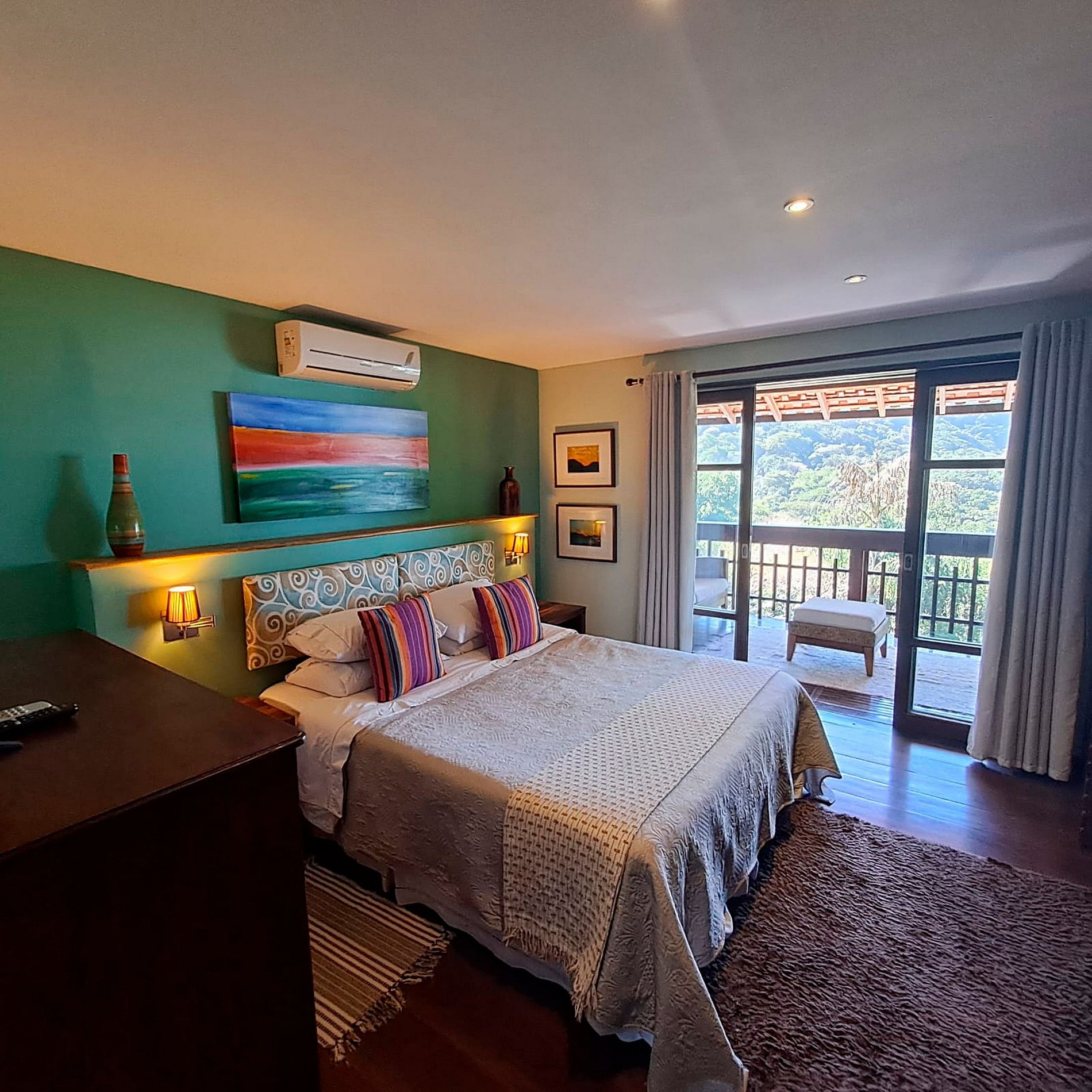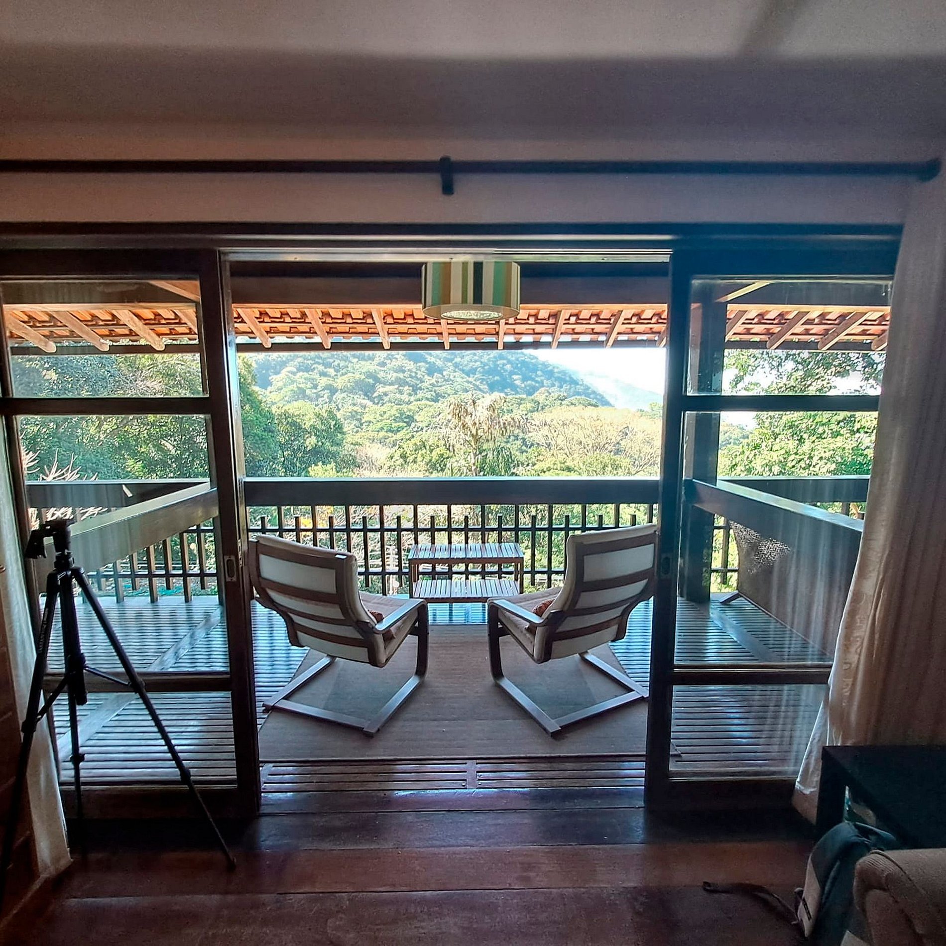 A área externa conta com uma piscina e espaço para entretenimento, proporcionando diversão e relaxamento ao ar livre. Os quartos são climatizados e possuem terraços com vistas incríveis para a floresta e a montanha, garantindo uma estadia confortável e inesquecível.
